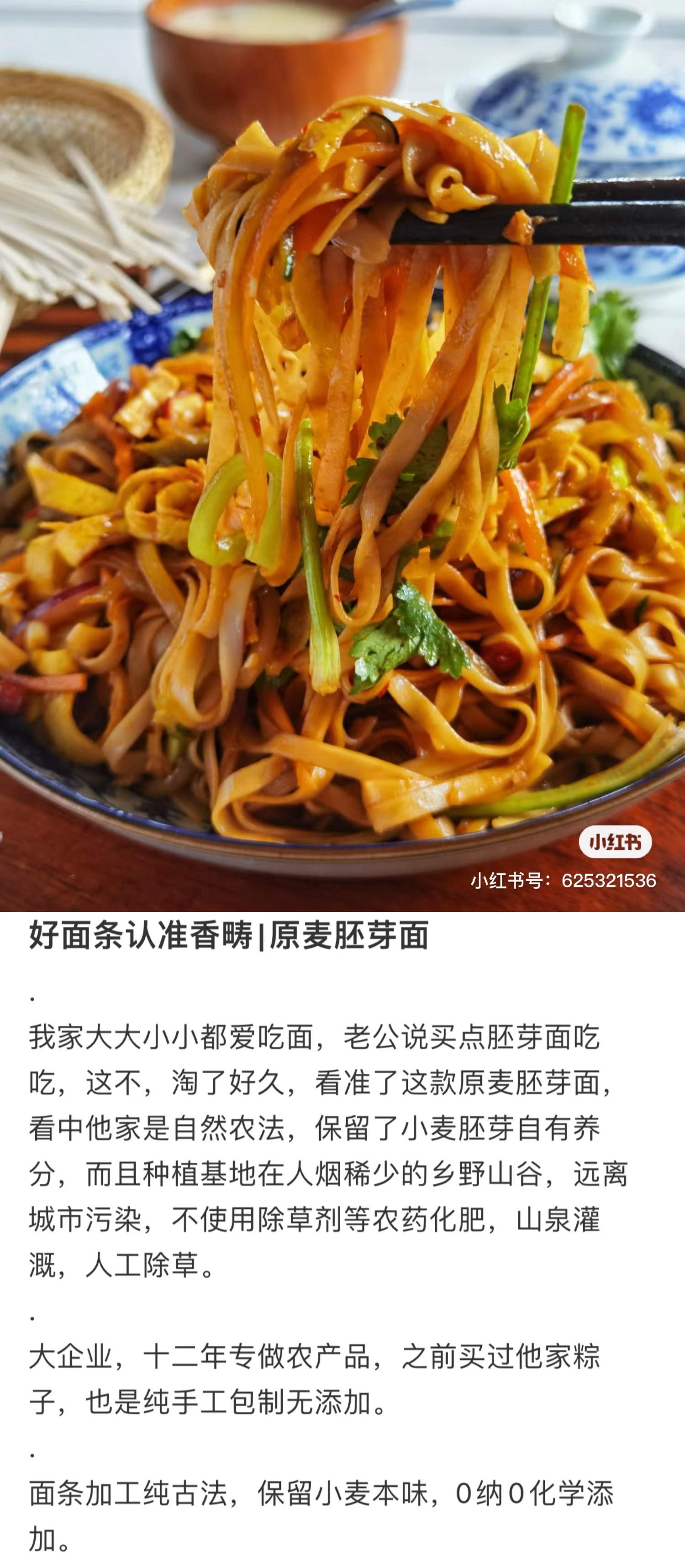 胚芽面条有分粗面和细面,味道一样,看喜好啦,热汤面凉拌面都可!水煮个10来分钟,捞起,淋上酱油醋,再拌点喜欢的酱料,就可以开吃了,面条爽滑有嚼劲,麦香浓郁,回甘十足!没有添加盐和食用碱,吃起来轻松无负担,特别适合家中孕妇、老人或小孩,好嚼,营养也更好!