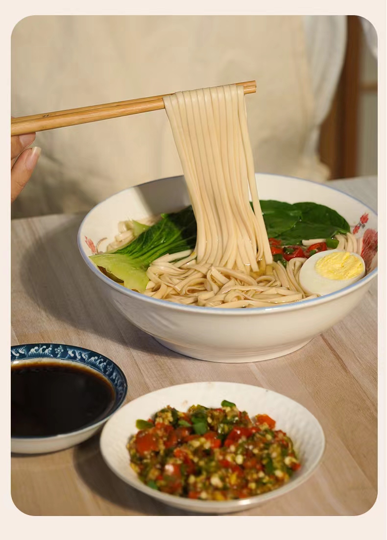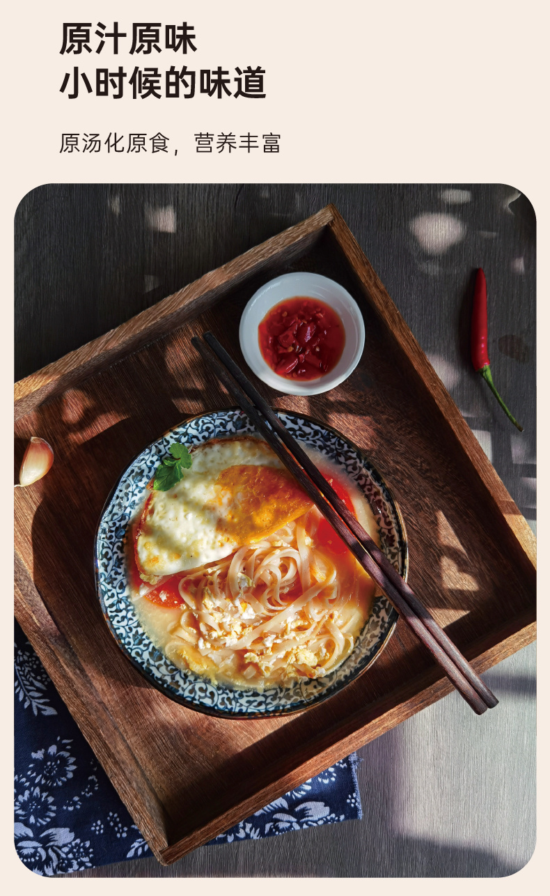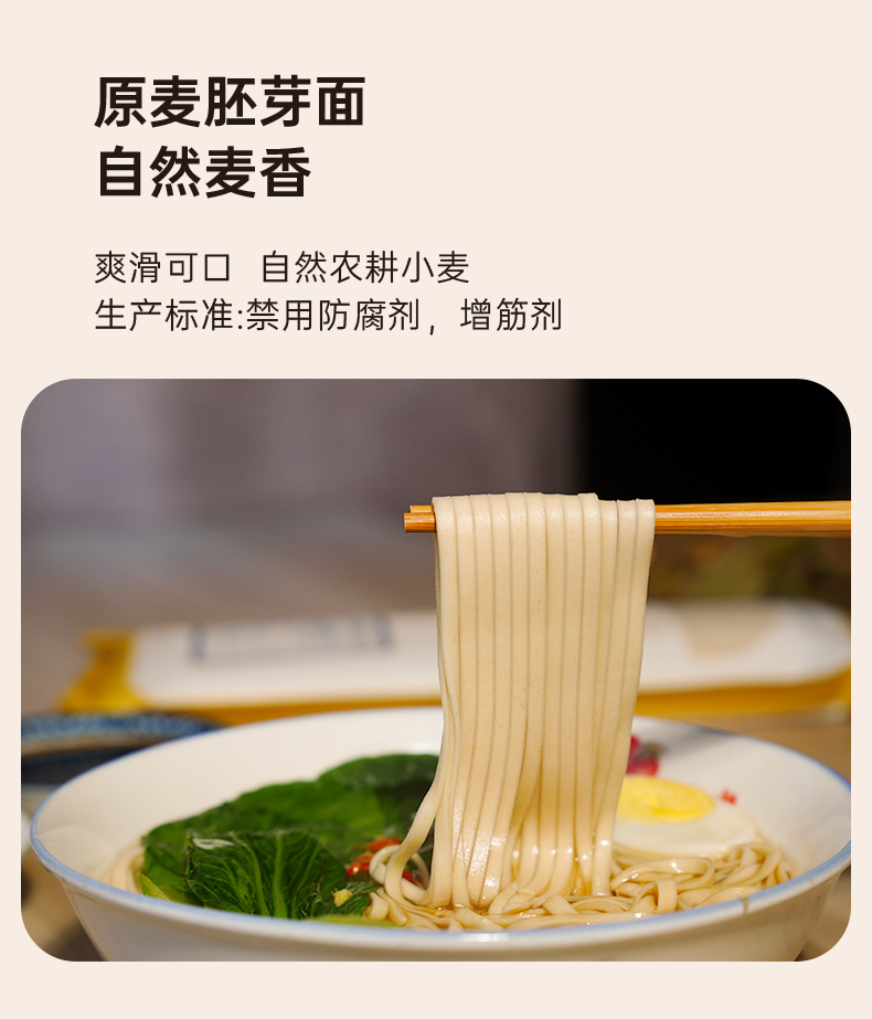 原麦胚芽面条,选用的是存放了3个多月的自然农耕优质小麦,等待它完成自己的后熟过程再进行加工。传统的低温石磨,每分钟仅24转,虽然效率看似不高,但却能最大限度地保留小麦的胚芽和麸皮,那是小麦营养的精华所在。而低温加工,不仅避免了高温对小麦营养的破坏,更无需添加任何稳定剂。和面、熟化、九道延续压片、切条、烘干……每一个步骤,都凝聚了农人心血。