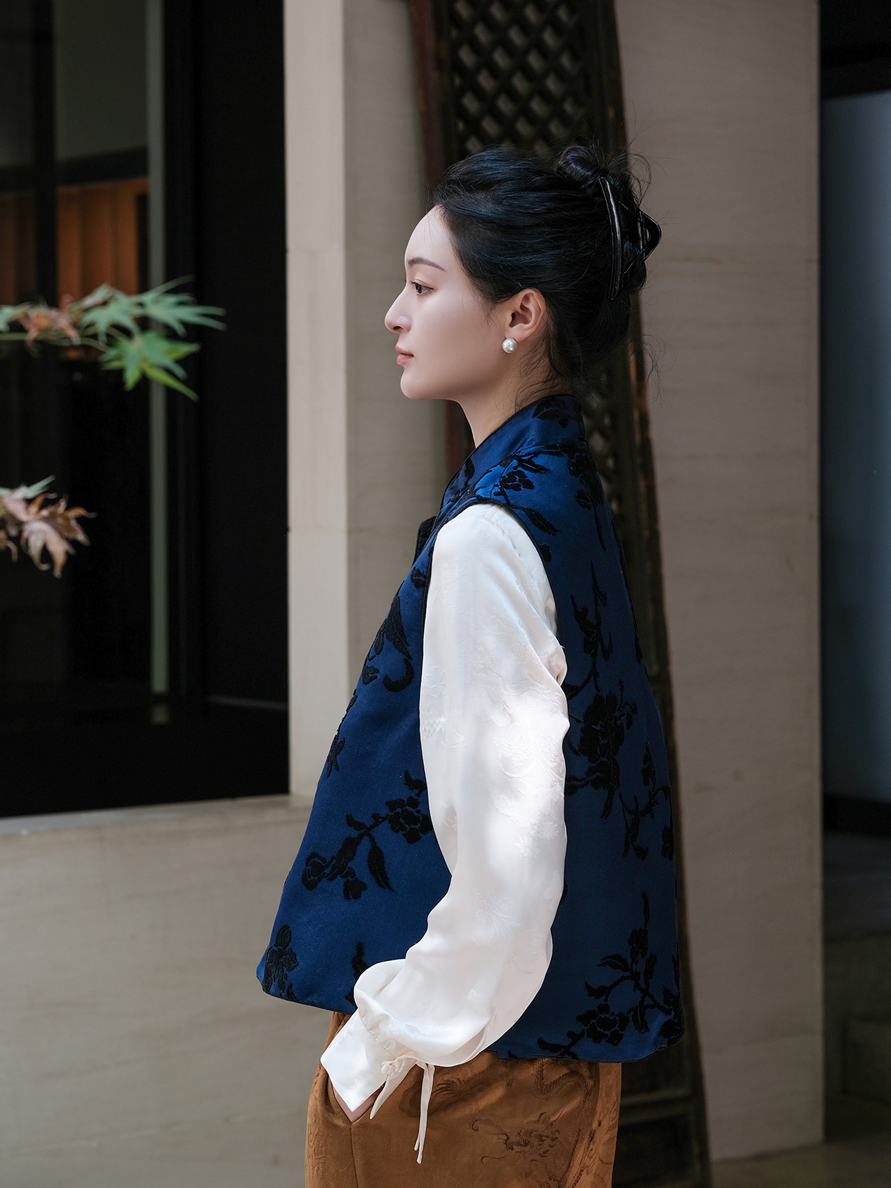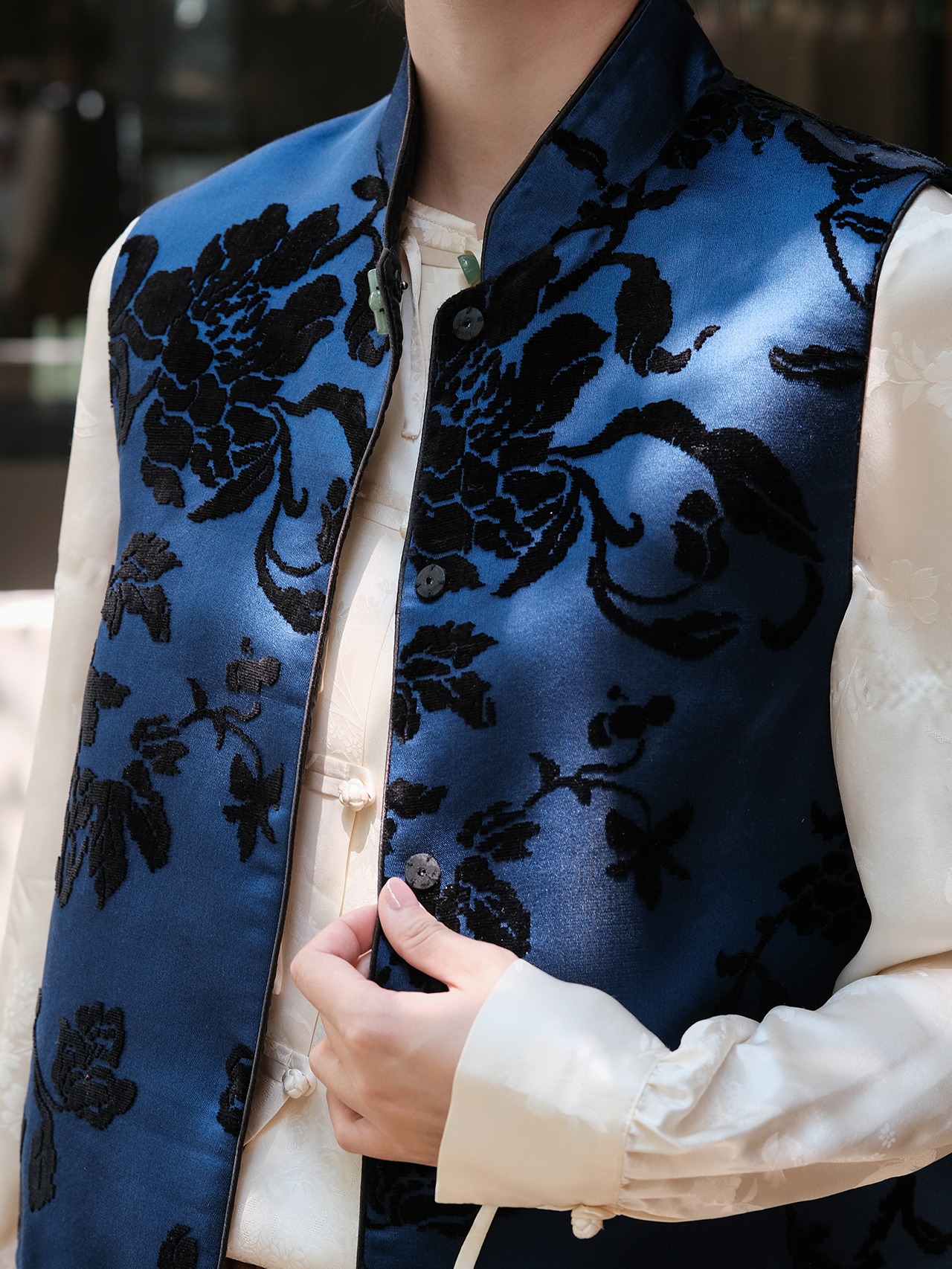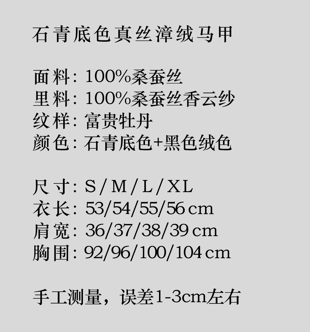 盛唐牡丹 |石青底色真丝漳绒马甲
