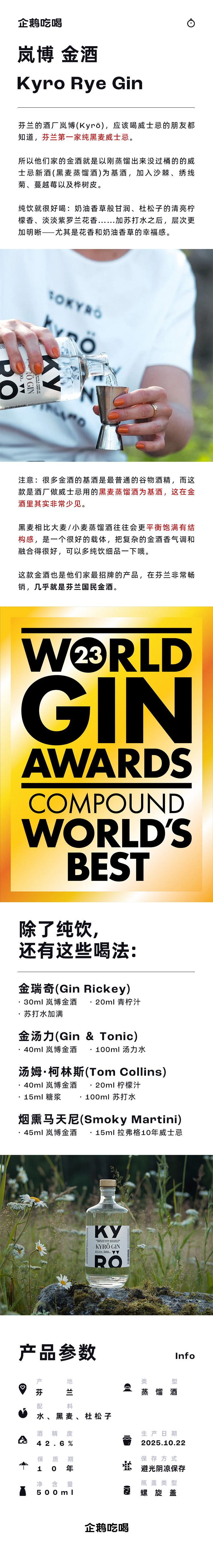 企鹅市集|芬兰KYRO岚博黑麦金酒 500ml 柑橘木质调花香奶油香草 芬兰国民金酒