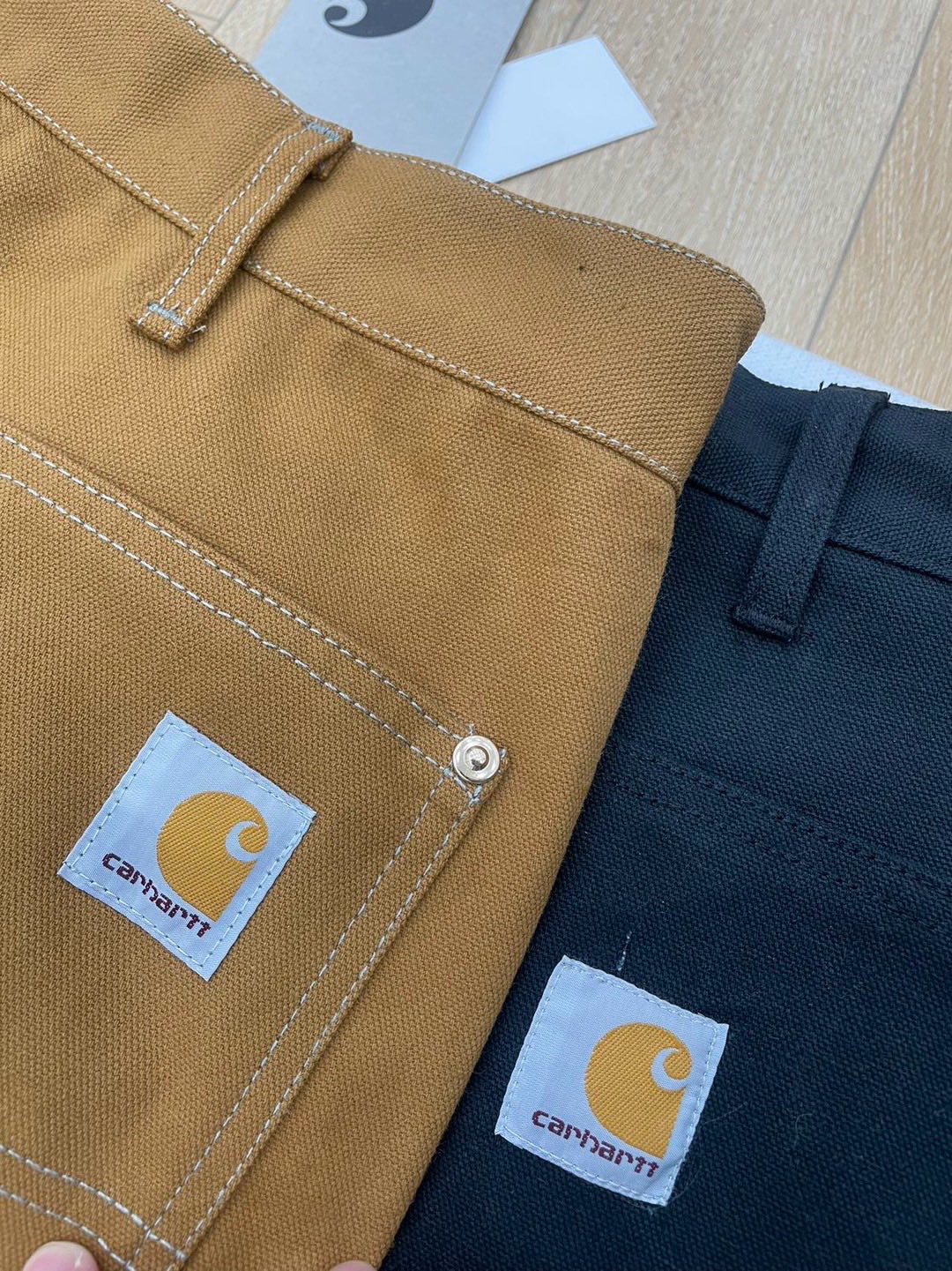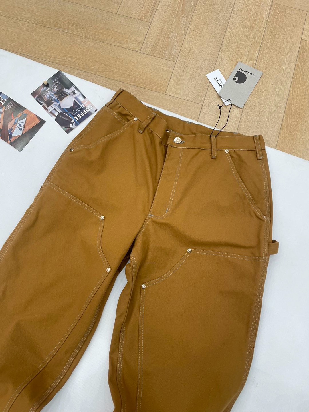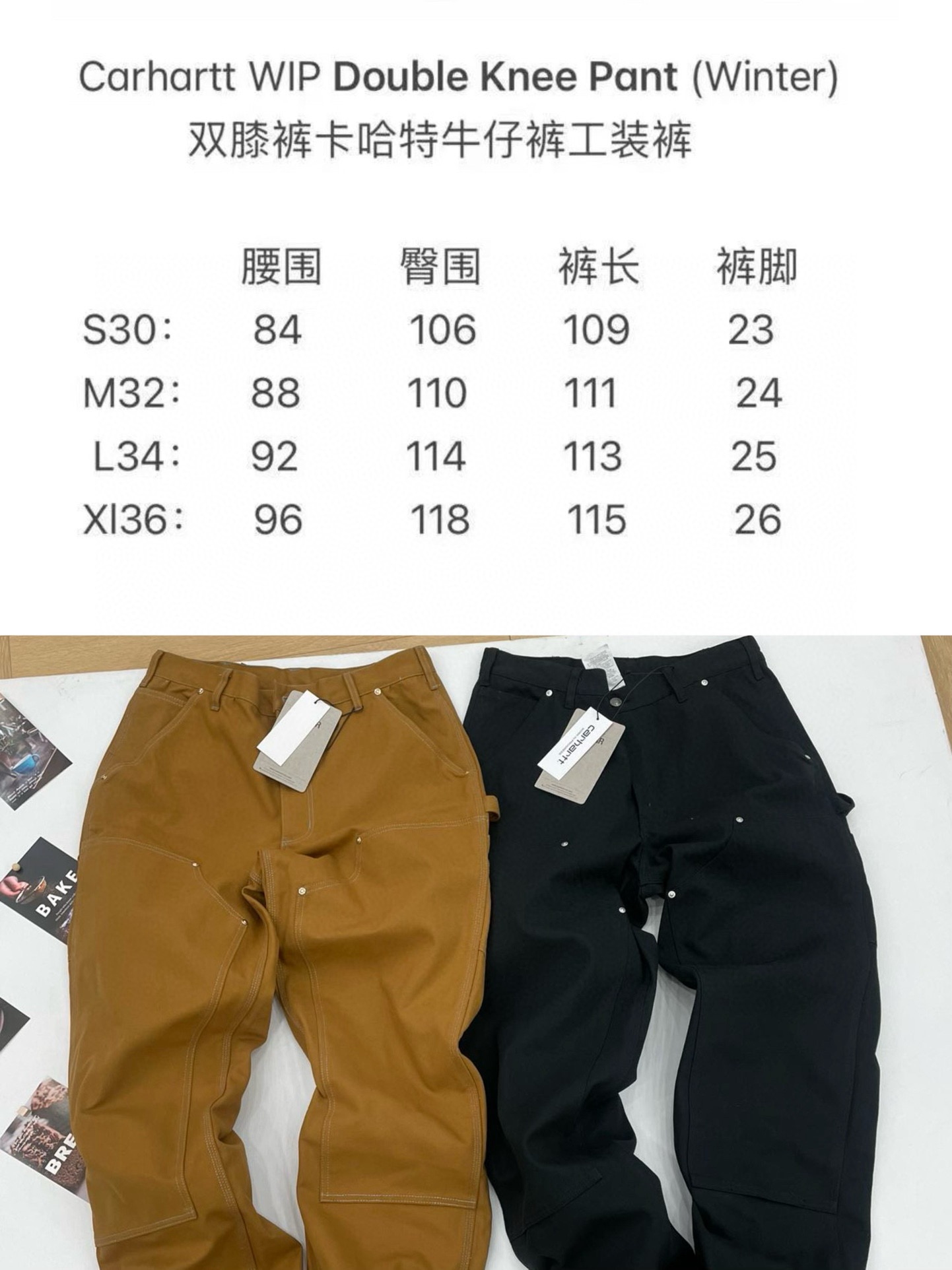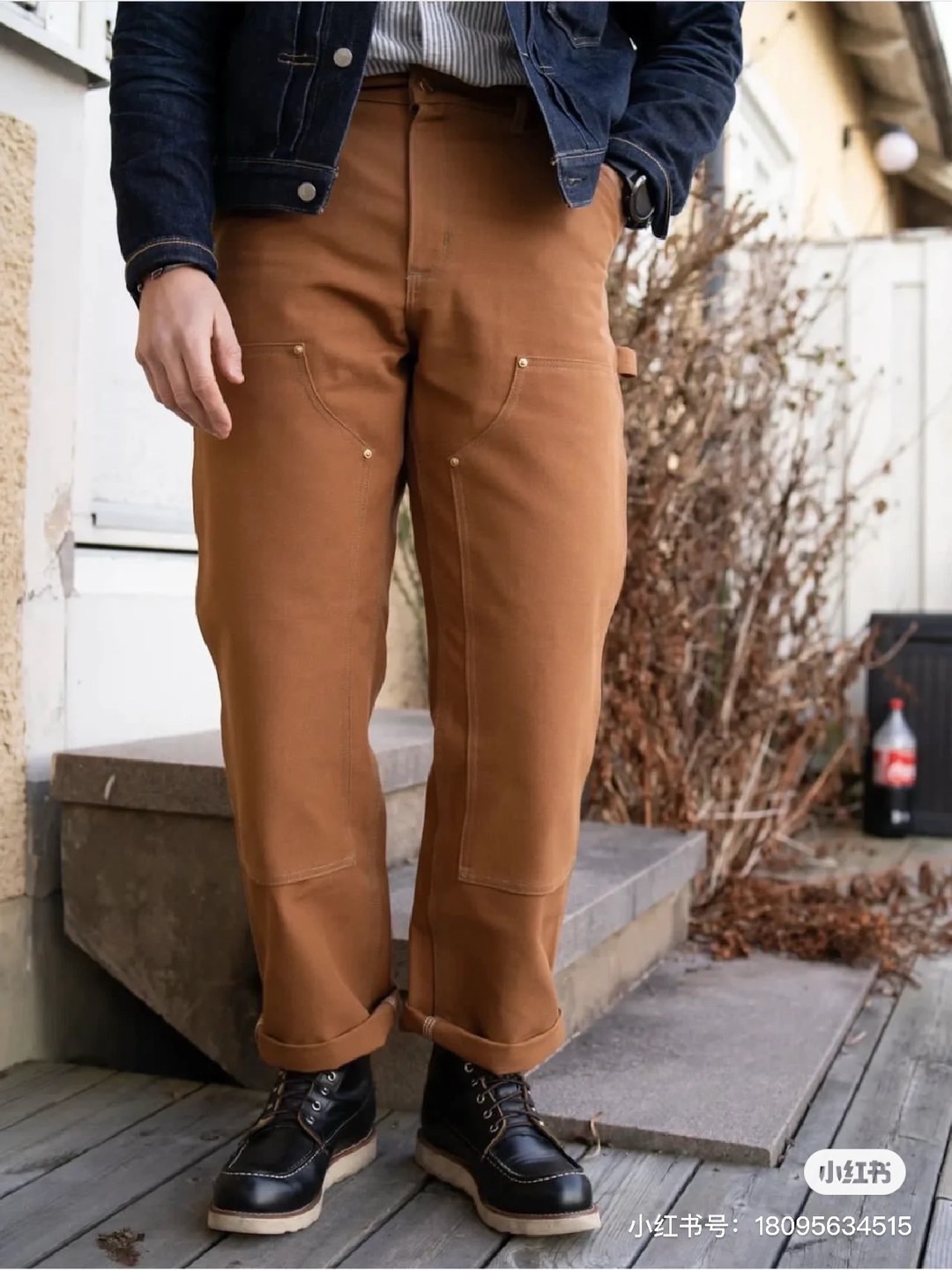 卡哈特最经典版型、海王/杰森/莫玛同款、 Carhartt2025新品WIP经典LOGO标签多口袋双膝布工装裤,中腰直筒裤型,定义为loose fit宽松版型,恰到好处的剪裁,上身后非常显精神,主要为伐木工人所使用,所以也称为伐木裤,采用12盎司100%棉原生帆布,未脱浆面料,面料较硬,随穿着和洗涤会逐渐变软合身,不但能防风防水,长年累月的穿着还留下生活的痕迹,这便是卡哈特成为经典的基础,细节上有着牢固的车线,膝盖处有大块的双层帆布,并且各个点位有加固的铆钉,力量感和装饰感拉满的硬核裤子,双插口袋和后背的两侧尾袋开口相当大,满足于频繁使用的工作需求,尾袋下方各有小插袋,一侧带袢子用于放榔头,一侧放扳手,细节到位,整体具有防护属性,并且帅气好看,无论在工装圈还是潮流圈都很火爆,面料做工和设计风格都围绕着硬朗、有型、耐穿,特别是又硬又厚反而符合经典的一切要求。