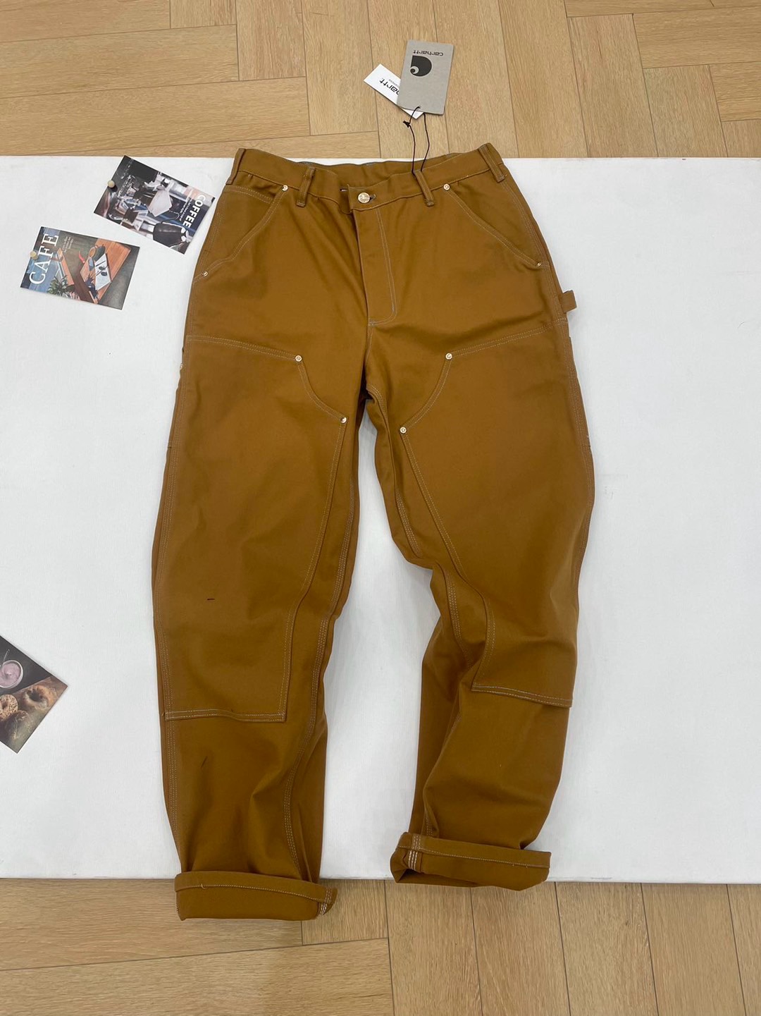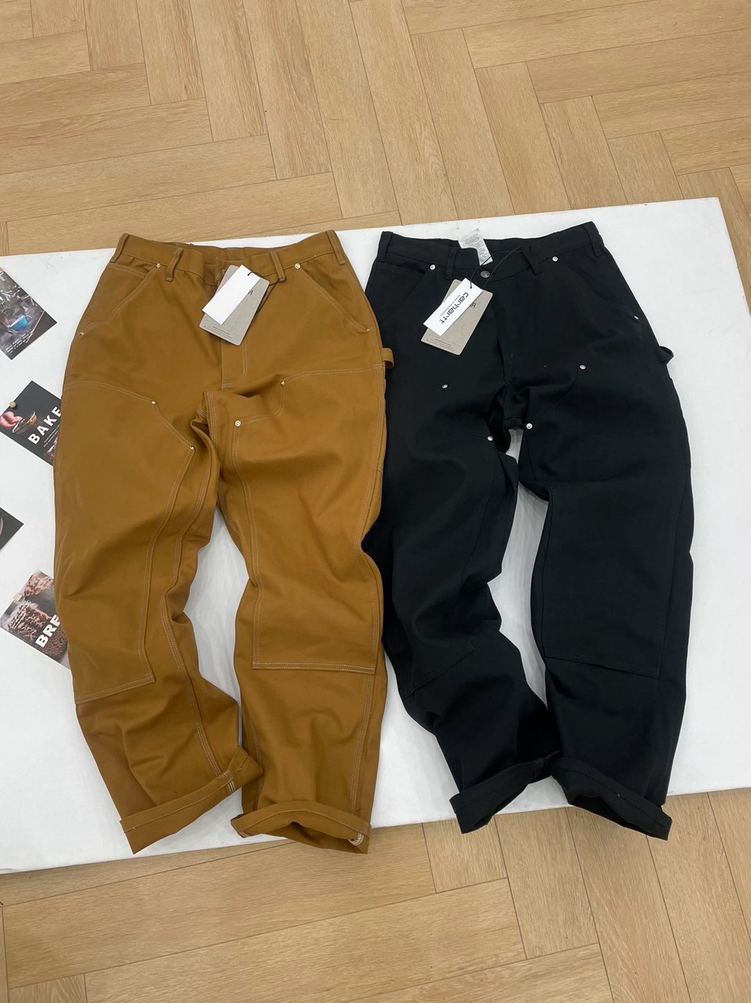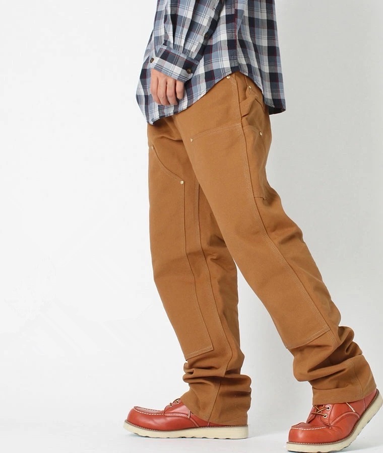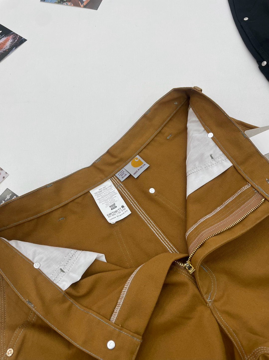 卡哈特最经典版型、海王/杰森/莫玛同款、 Carhartt2025新品WIP经典LOGO标签多口袋双膝布工装裤,中腰直筒裤型,定义为loose fit宽松版型,恰到好处的剪裁,上身后非常显精神,主要为伐木工人所使用,所以也称为伐木裤,采用12盎司100%棉原生帆布,未脱浆面料,面料较硬,随穿着和洗涤会逐渐变软合身,不但能防风防水,长年累月的穿着还留下生活的痕迹,这便是卡哈特成为经典的基础,细节上有着牢固的车线,膝盖处有大块的双层帆布,并且各个点位有加固的铆钉,力量感和装饰感拉满的硬核裤子,双插口袋和后背的两侧尾袋开口相当大,满足于频繁使用的工作需求,尾袋下方各有小插袋,一侧带袢子用于放榔头,一侧放扳手,细节到位,整体具有防护属性,并且帅气好看,无论在工装圈还是潮流圈都很火爆,面料做工和设计风格都围绕着硬朗、有型、耐穿,特别是又硬又厚反而符合经典的一切要求。