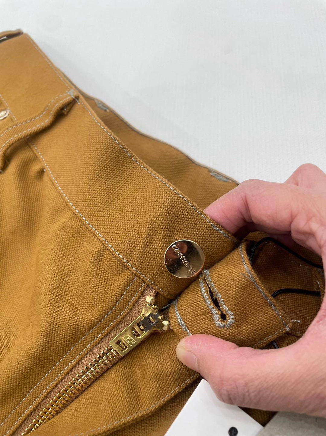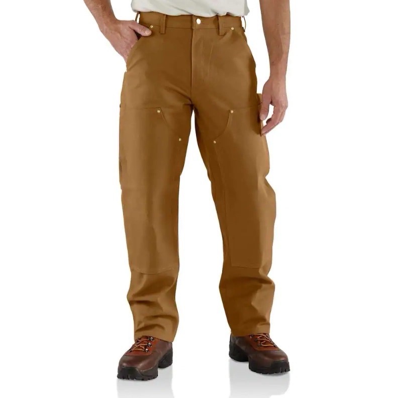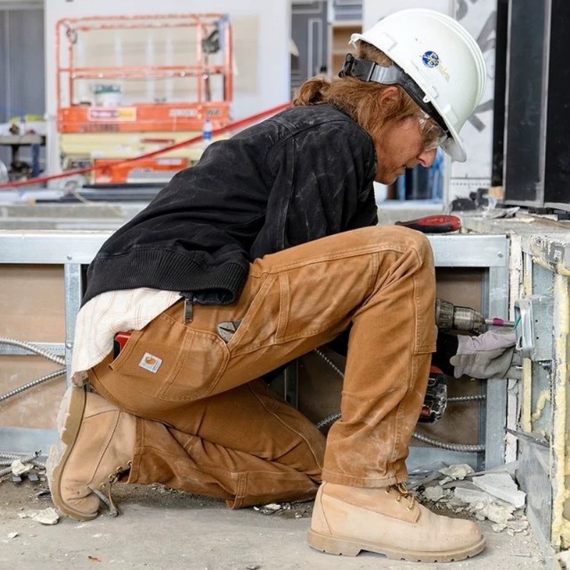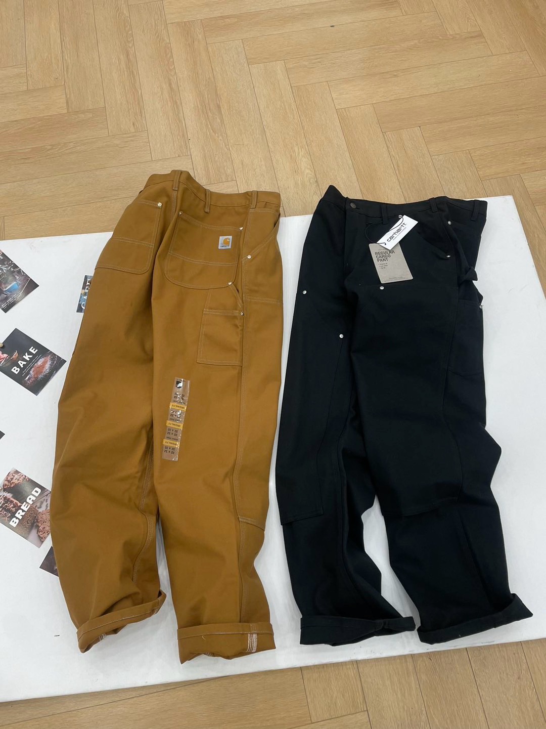 卡哈特最经典版型、海王/杰森/莫玛同款、 Carhartt2025新品WIP经典LOGO标签多口袋双膝布工装裤,中腰直筒裤型,定义为loose fit宽松版型,恰到好处的剪裁,上身后非常显精神,主要为伐木工人所使用,所以也称为伐木裤,采用12盎司100%棉原生帆布,未脱浆面料,面料较硬,随穿着和洗涤会逐渐变软合身,不但能防风防水,长年累月的穿着还留下生活的痕迹,这便是卡哈特成为经典的基础,细节上有着牢固的车线,膝盖处有大块的双层帆布,并且各个点位有加固的铆钉,力量感和装饰感拉满的硬核裤子,双插口袋和后背的两侧尾袋开口相当大,满足于频繁使用的工作需求,尾袋下方各有小插袋,一侧带袢子用于放榔头,一侧放扳手,细节到位,整体具有防护属性,并且帅气好看,无论在工装圈还是潮流圈都很火爆,面料做工和设计风格都围绕着硬朗、有型、耐穿,特别是又硬又厚反而符合经典的一切要求。