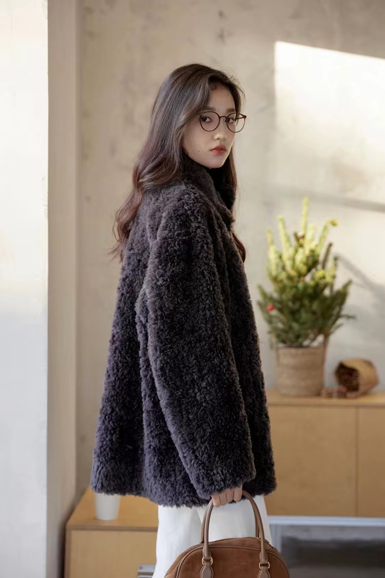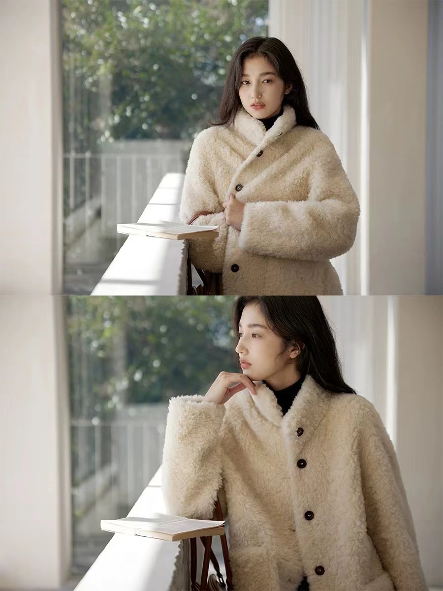 冬季轻盈高保暖立领单排扣羊羔毛高质感毛毛外套谁能拒绝一件质感满满的羊羔毛外套啊!立领+拼棕色纽扣的设计复古又精 致,毛绒绒的触感软乎乎的,保暖度直接拉满~内搭简单打底衫,下身配深蓝色阔腿牛仔裤,再挎个棕色包,休闲中带着糕级感!日常出街或者上班穿都很合适,温柔又大气,这个秋冬就靠它打造温柔松弛感啦!它是H型微廓剪裁,肩线做了自然落肩的弧度,既能藏住肩颈的小肉感,又不会像oversize款那样压个子;衣长在70左右,微长一点,很保暖!领口是立领设计,立领能牢牢裹住脖颈挡风;单排扣门禁设计,简单又大方!两边有做立体口袋,能随手放手机,放口红之类的小物件,袋口边缘用了同色系缝线收边,和绒毛融为一体,不破坏整体的干净感。面料含羊毛,摸起来软fufu的,不易掉毛也不易起球,是很高的一款毛毛外套~