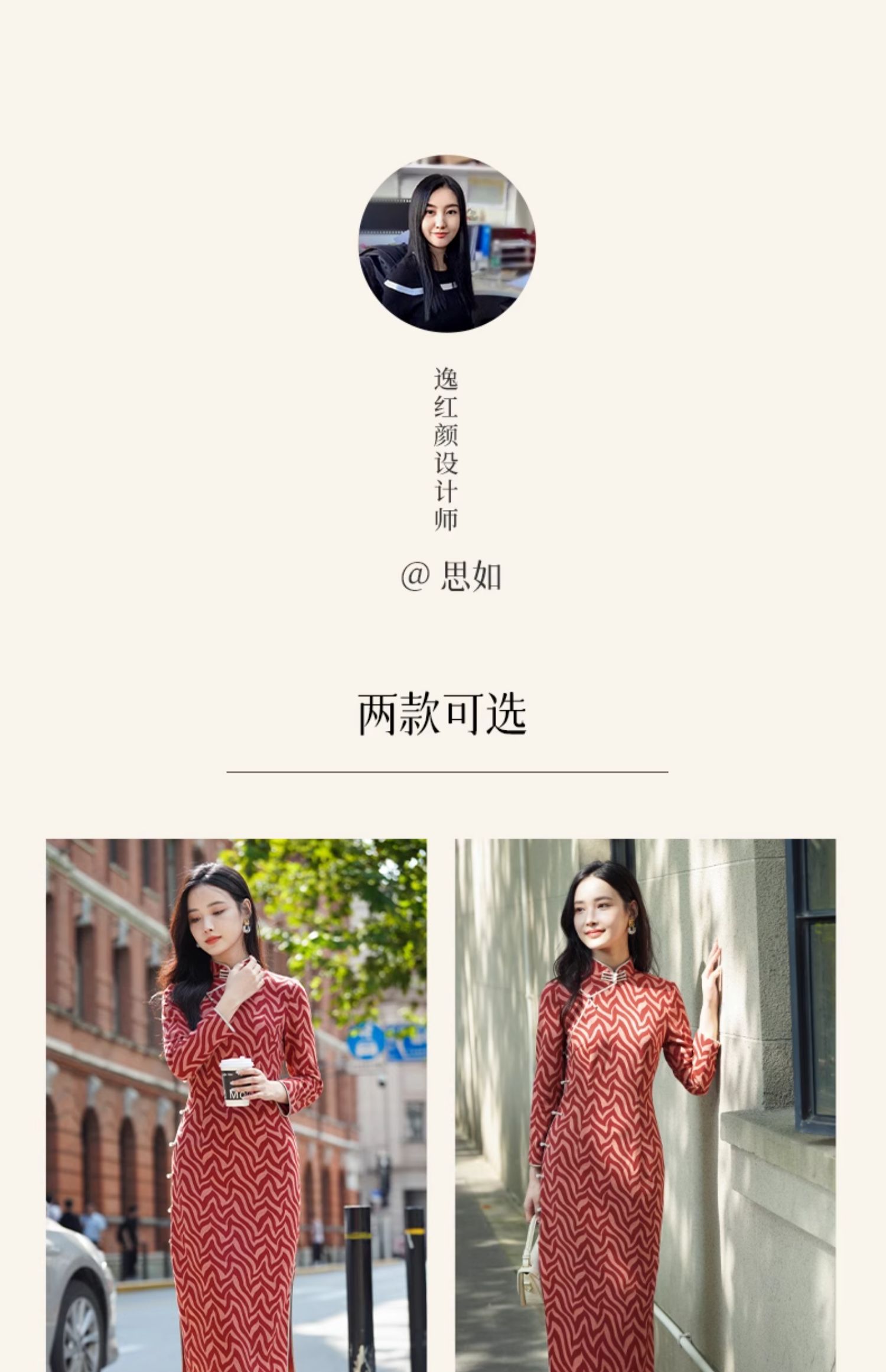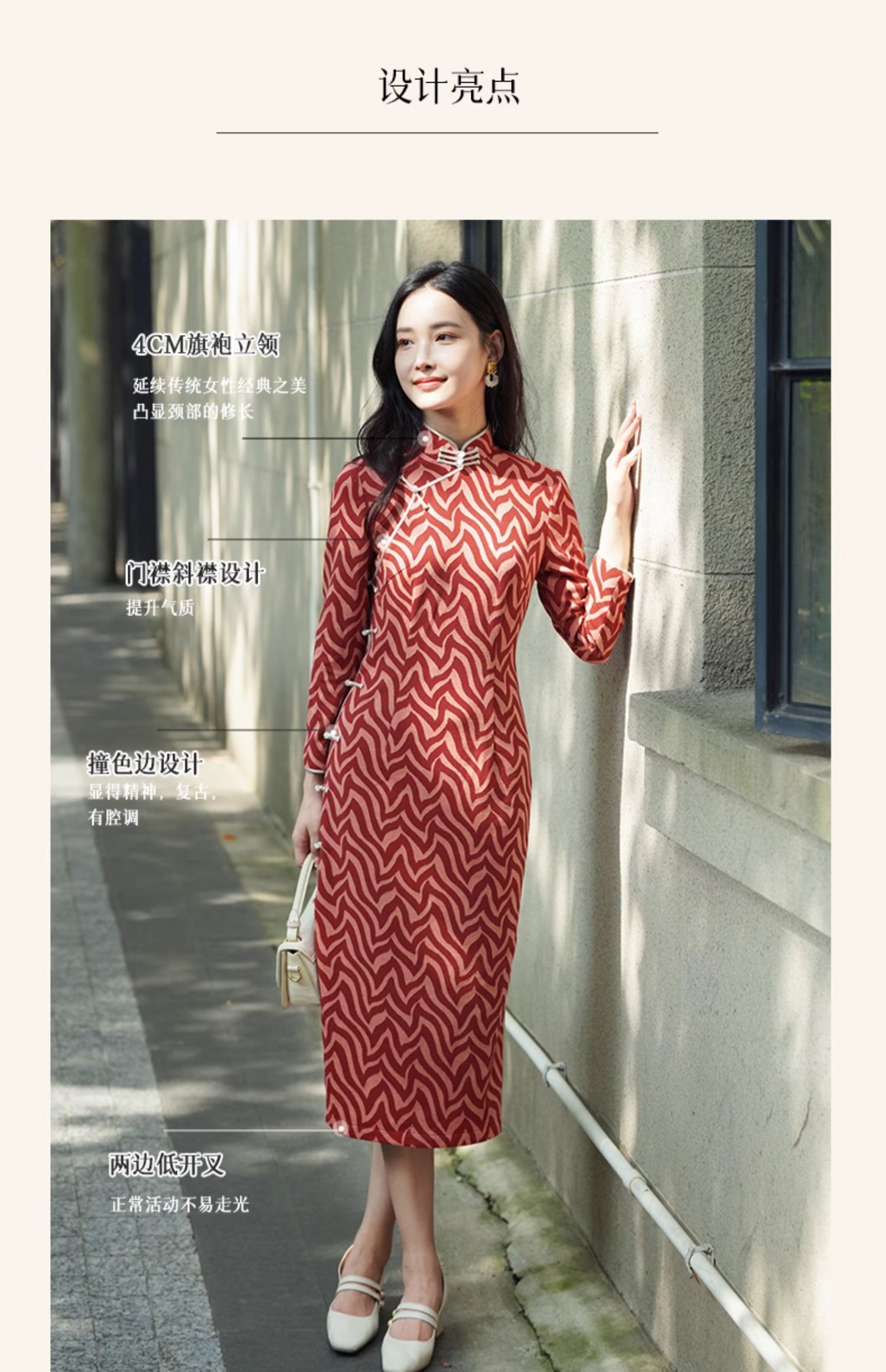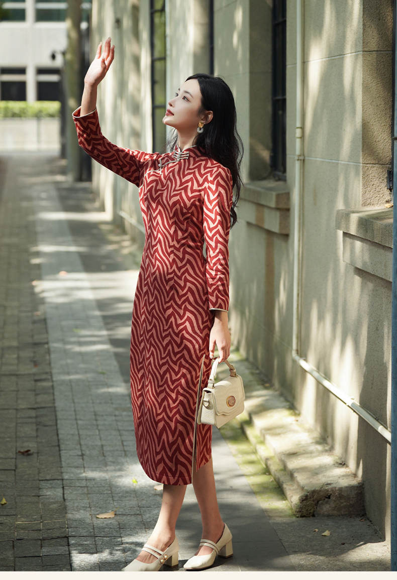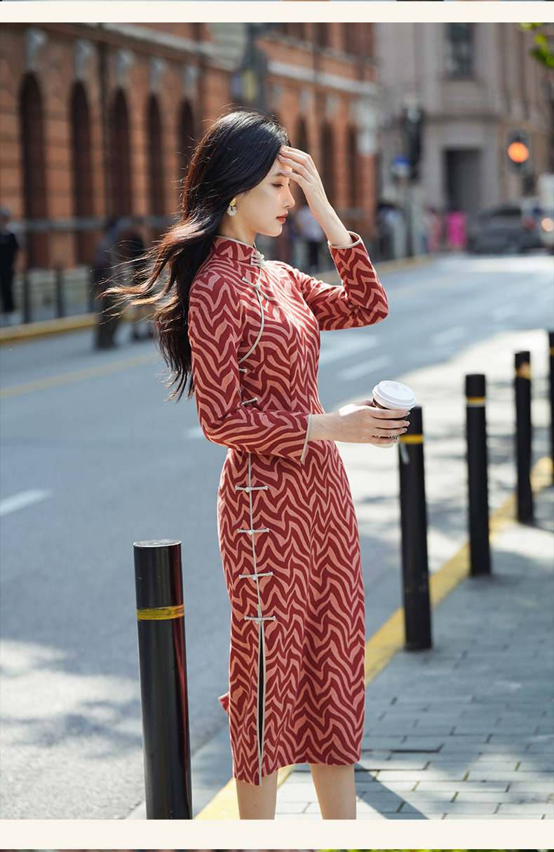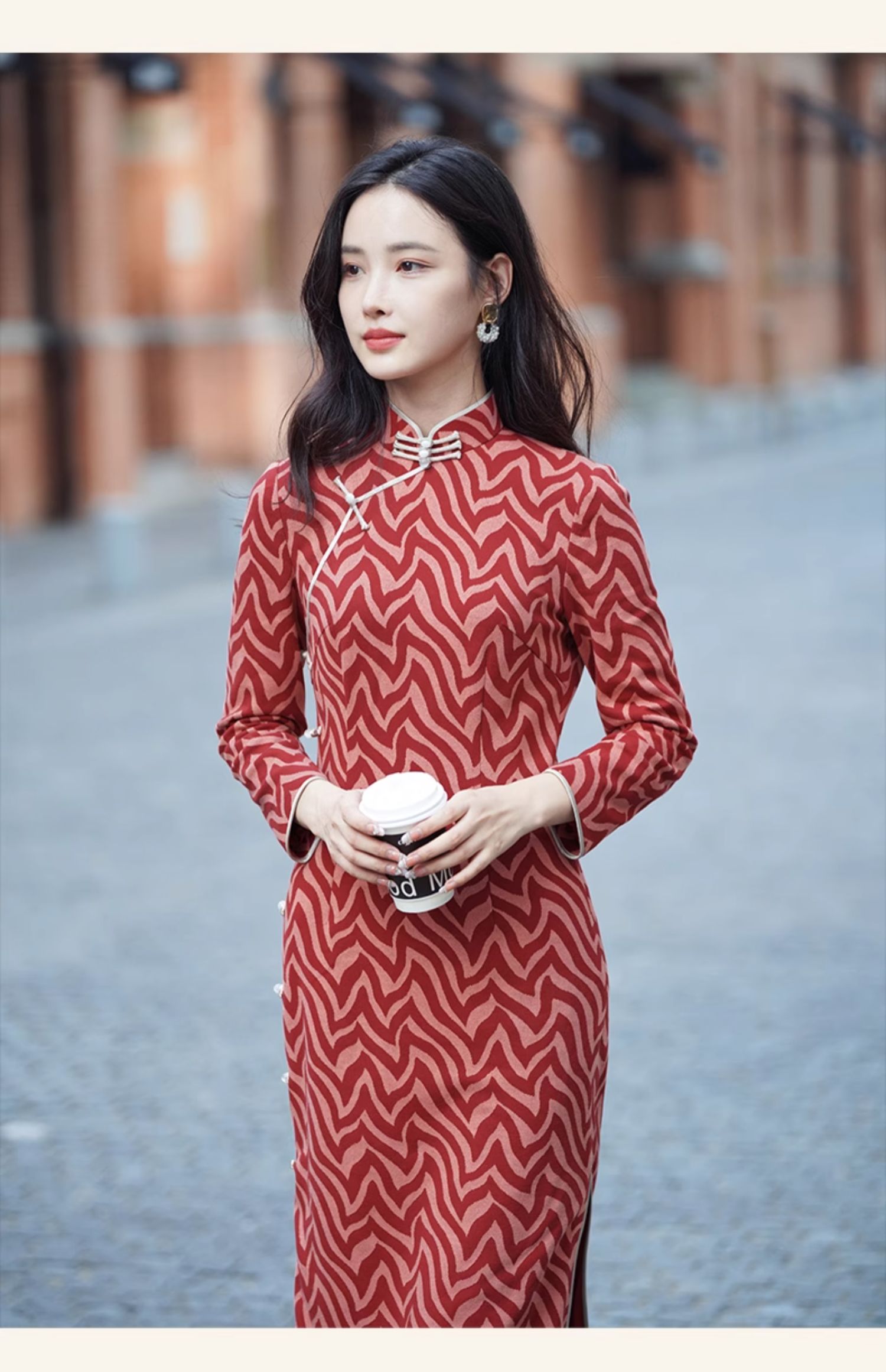 上海逸红颜海悦2025年冬季针织旗袍改良版连衣裙女长袖珊瑚红条纹
