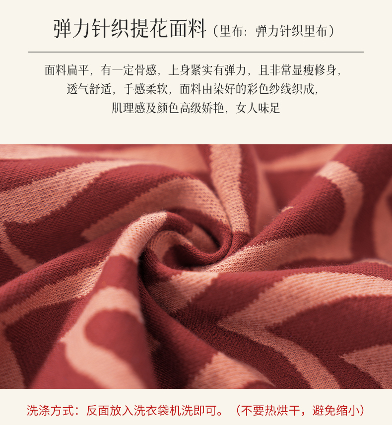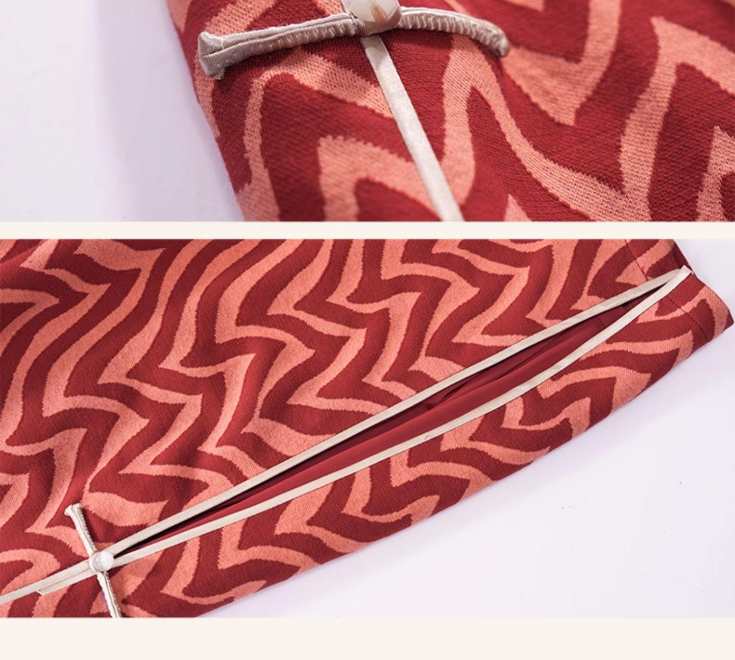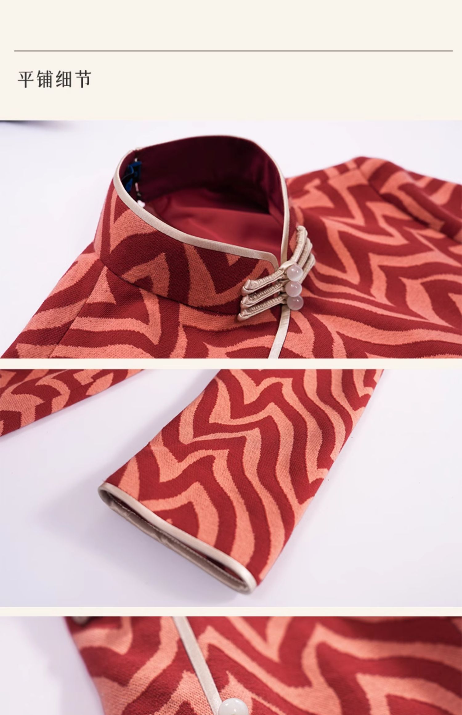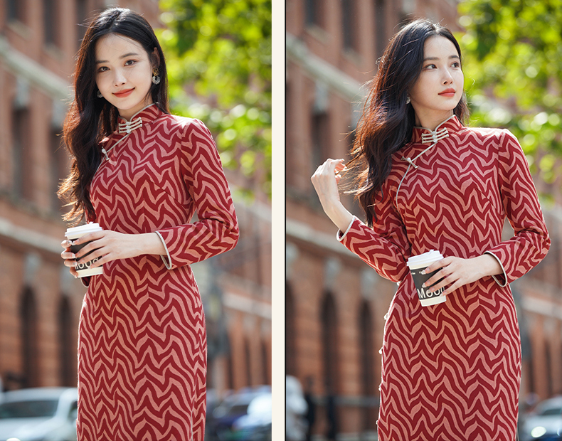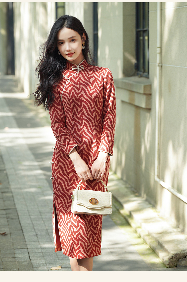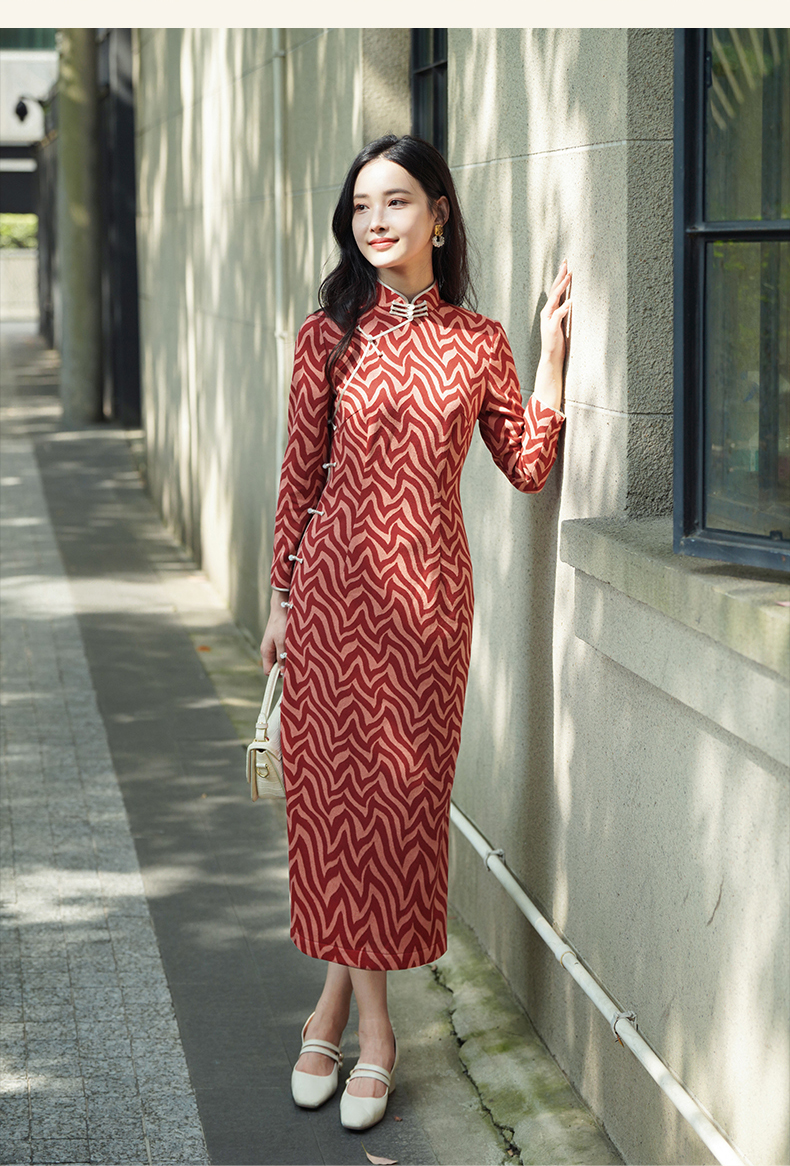 上海逸红颜海悦2025年冬季针织旗袍改良版连衣裙女长袖珊瑚红条纹