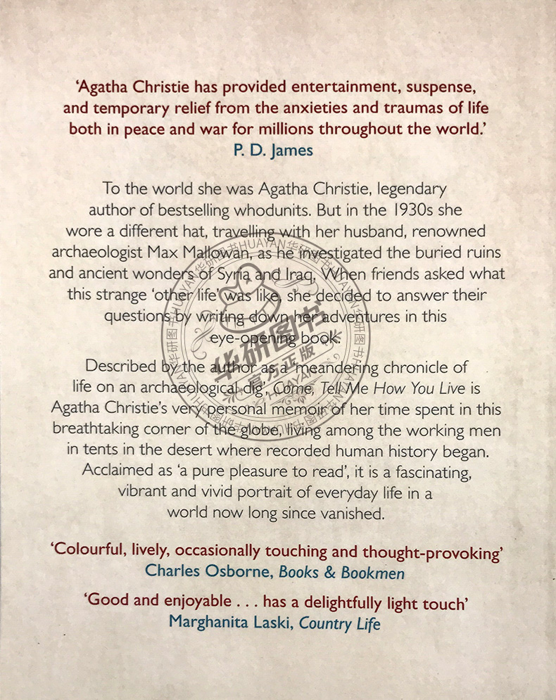 当年阿婆风华正茂,踏上叙利亚新婚之旅;这是阿加莎·克里斯蒂的一部游记,献给一生挚爱。 “历经四年战乱,我对叙利亚的念想越来越强烈。我爱那片平静肥沃的土地,上帝保佑,让我再回到那片土地,保佑我爱的这一切不会从世间消失……”——阿加莎·克里斯蒂 如今战火纷飞的叙利亚,曾经是一片宁静的乡野,那里盛开着金盏菊,白胡子老者跋涉在驴子后,浑然不知远方的战争。那里的人民纯朴、悠闲、快活,知道如何大笑和享受生活。 如果说阿加莎克里斯蒂在侦探小说中略去了人物刻画,在这本书Come, Tell Me How You Live《说吧,叙利亚/情牵叙利亚》里,她寥寥几笔便将一个个体描绘得栩栩如生。这是一部充满温情、谐趣的“爱的劳作”,此行挖掘的真正宝藏是她笔下的酋长、厨子、司机、工匠、农夫、护身符雕刻师、屠夫、烤饼师傅、烛台匠人…… Agatha Christie’s personal memoirs about her travels to Syria and Iraq in the 1930s with her archaeologist husband Max Mallowan, where she worked on the digs and wrote some of her most evocative novels. Think you know Agatha Christie? Think again! To the world she was Agatha Christie, legendary author of bestselling whodunits. But in the 1930s she wore a different hat, travelling with her husband, renowned archaeologist Max Mallowan, as he investigated the buried ruins and ancient wonders of Syria and Iraq. When friends asked what this strange ‘other life’ was like, she decided to answer their questions by writing down her adventures in this eye-opening book. Described by the author as a ‘meandering chronicle of life on an archaeological dig’, Come, Tell Me How You Live is Agatha Christie's very personal memoir of her time spent in this breathtaking corner of the globe, living among the working men in tents in the desert where recorded human history began. Acclaimed as ‘a pure pleasure to read’, it is an altogether remarkable and increasingly poignant narrative, a fascinating, vibrant and vivid portrait of everyday life in a world now long since vanished. Review ‘Perfectly delightful… colourful, lively and occasionally touching and thought-provoking’ --Charles Osborne, Books & Bookmen ‘Good and enjoyable… she has a delightfully light touch’--Marghanita Laski, Country Life ‘Agatha Christie has provided entertainment, suspense, and temporary relief from the anxieties and traumas of life both in peace and war for millions throughout the world.’--P. D. James ‘Christie’s witty account of her yearly expeditions in Syria in the 1930s … is at once a captivating depiction of quotidian life at archaeological digs and a romantic portrait of adventurers and scholars in the interwar Middle East. Her relaxed narrative of the organization and effort in archaeological investigation and of the landscape and people in the region is engrossing―but what makes this book bewitching is the nostalgic glamour that infuses it.” --The Atlantic (US)