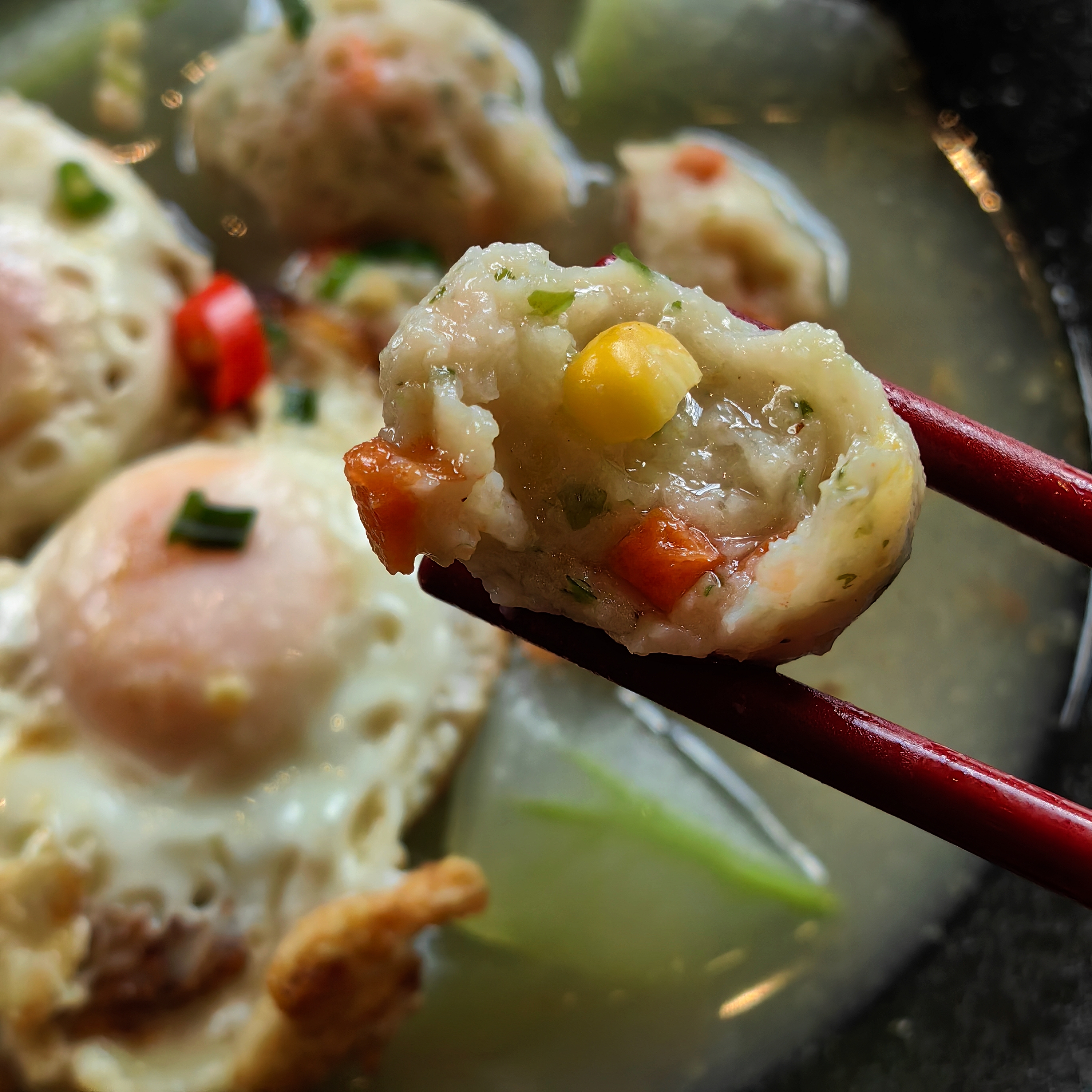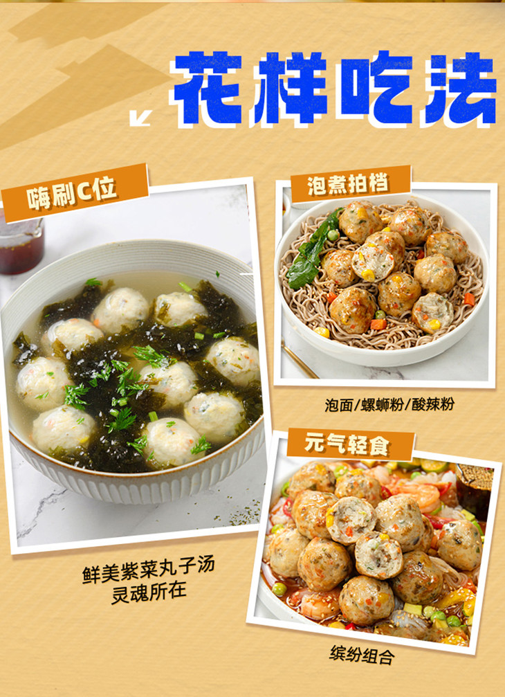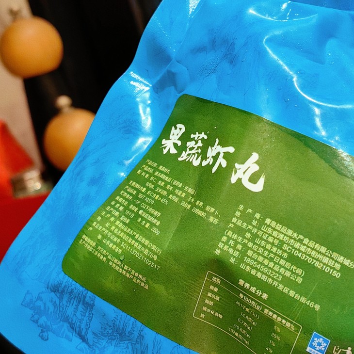 果蔬虾丸,精选新鲜纯正的北海青虾大虾仁,制作时保留了虾仁的大颗粒,每一口都是海洋的味道。同时,也特别添加鱼肉和鸡肉,以及丰富的果蔬,提升口感的同时,营养也更均衡。现采的马蹄香气四溢,脆甜多汁;新鲜水果玉米粒,甜鲜脆嫩;胡萝卜富含膳食纤维;海苔则含有甘露醇!这些天然食材不仅为虾丸增添了独特的口感,更提升了营养价值,并严格遵循健康、安全的原则,不添加任何香精、色素、防腐剂等食品添加剂,老人和孩子也都可以放心吃!