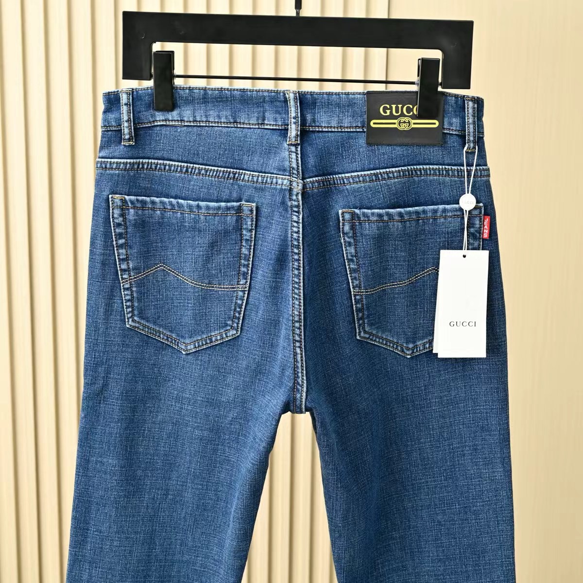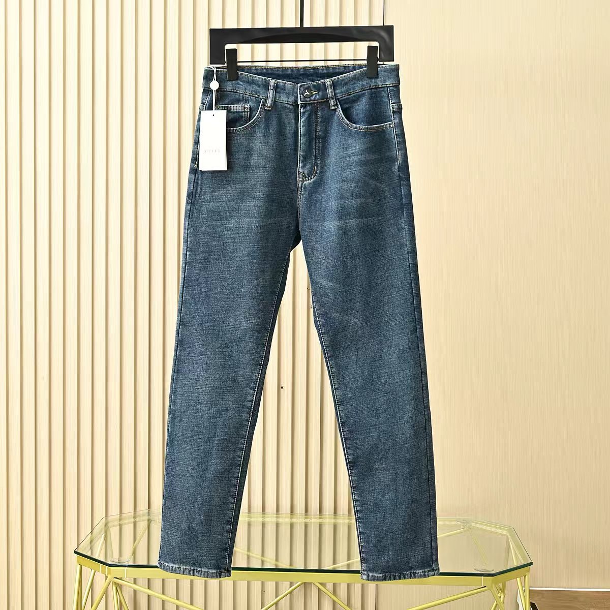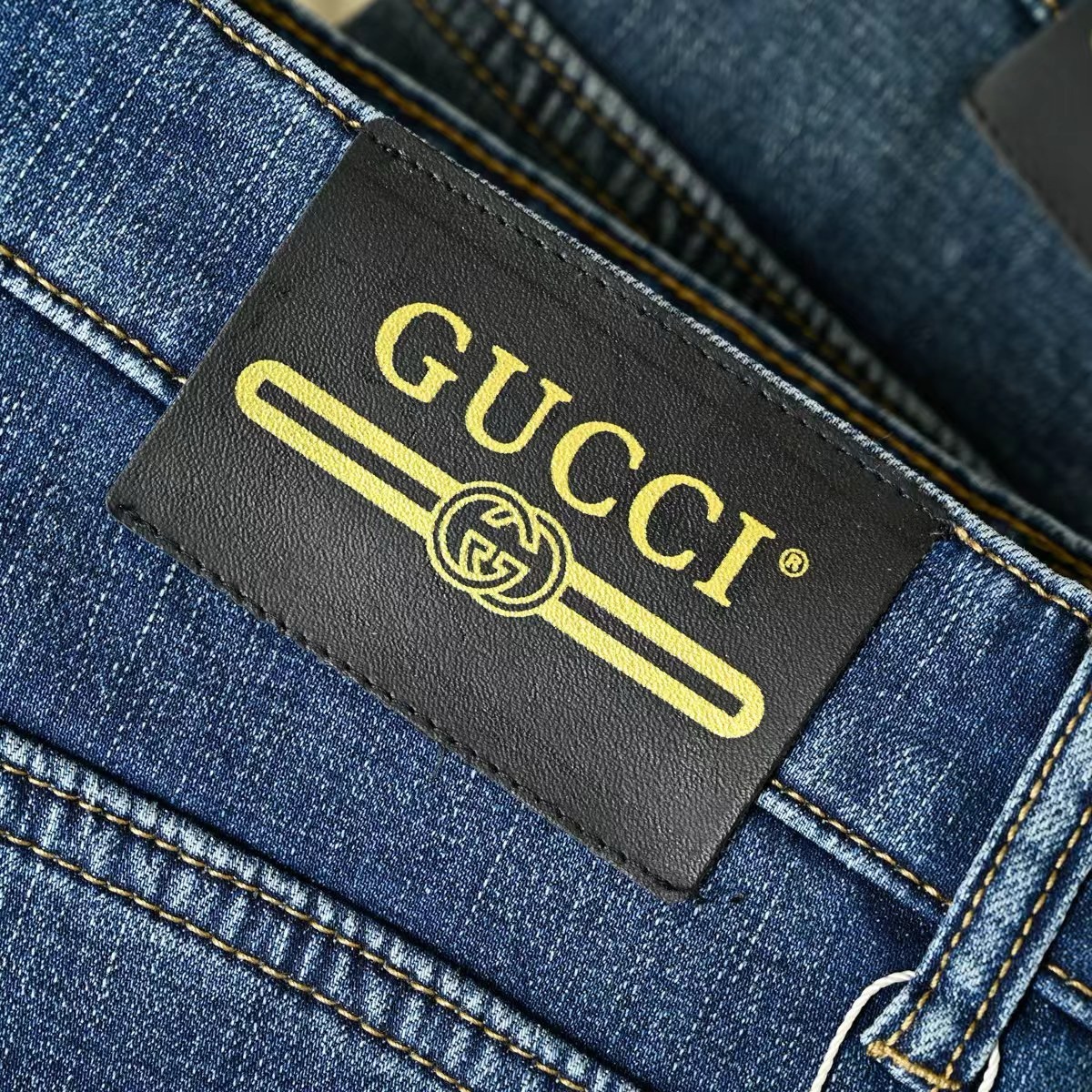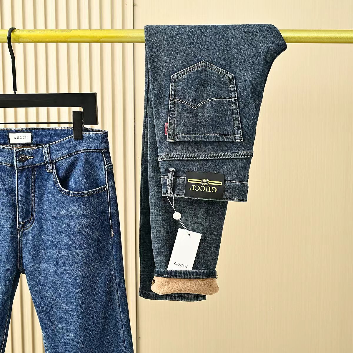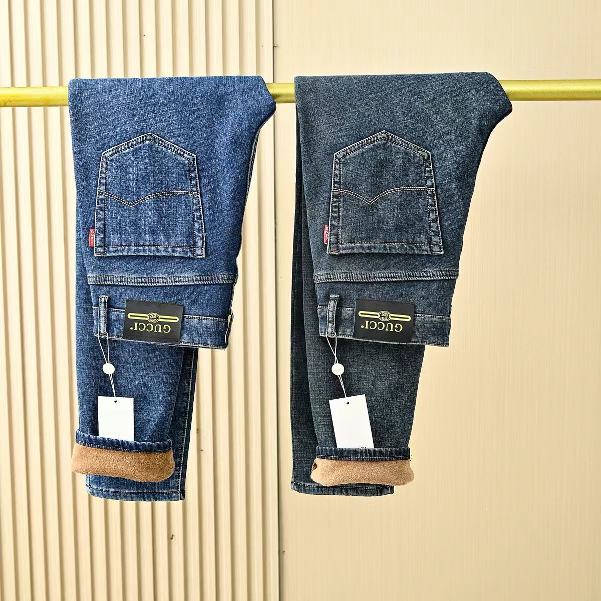Gucci古驰秋冬新款字母皮标加绒加厚商务休闲弹力直筒牛仔裤。