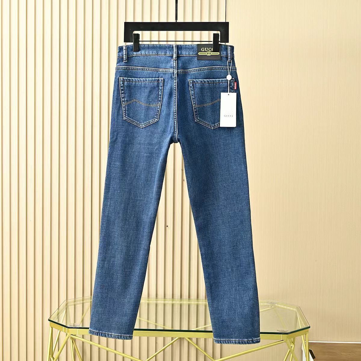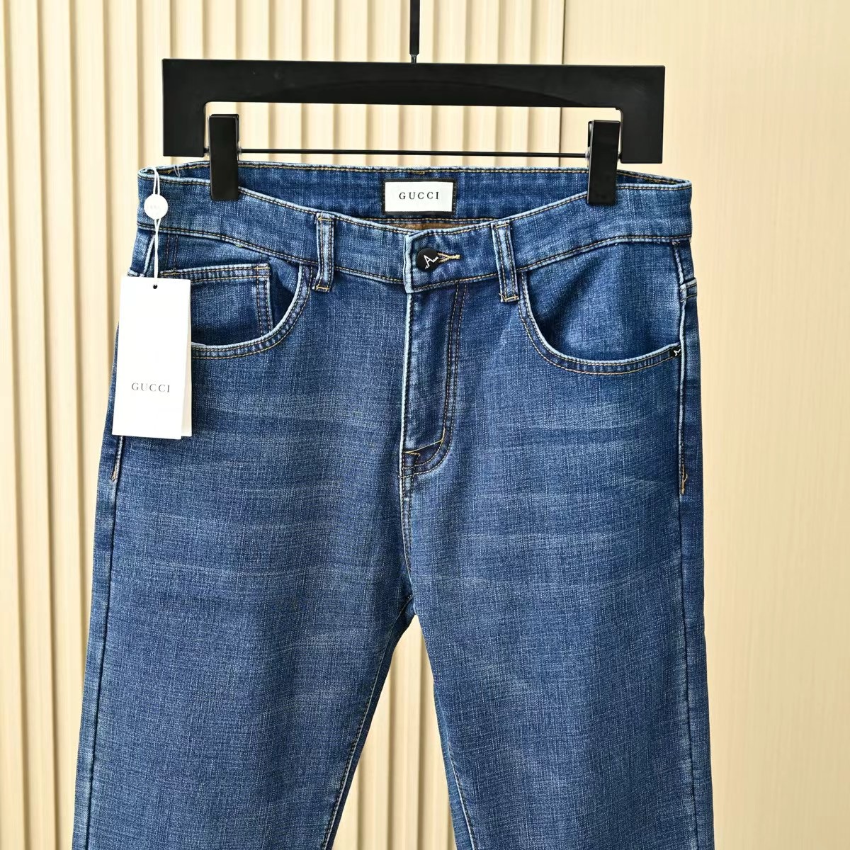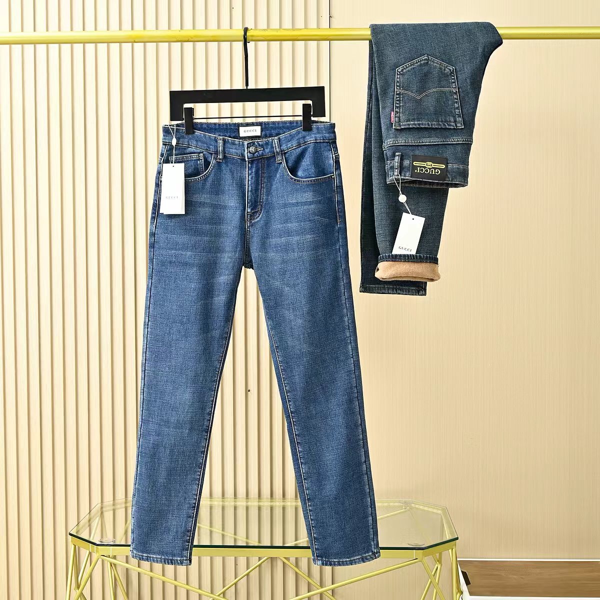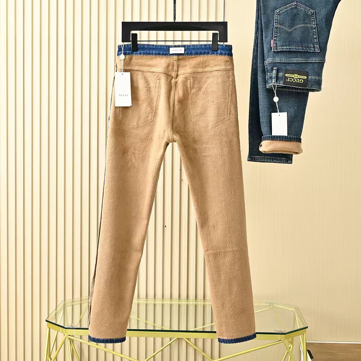 Gucci古驰秋冬新款字母皮标加绒加厚商务休闲弹力直筒牛仔裤。