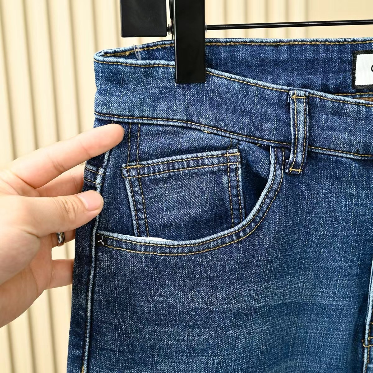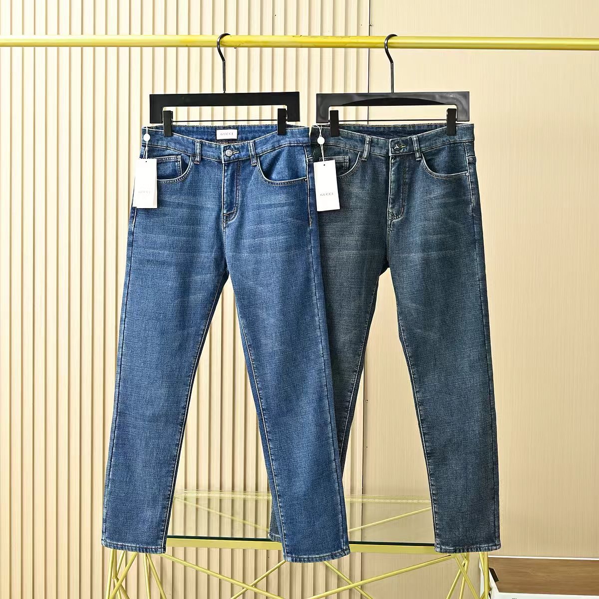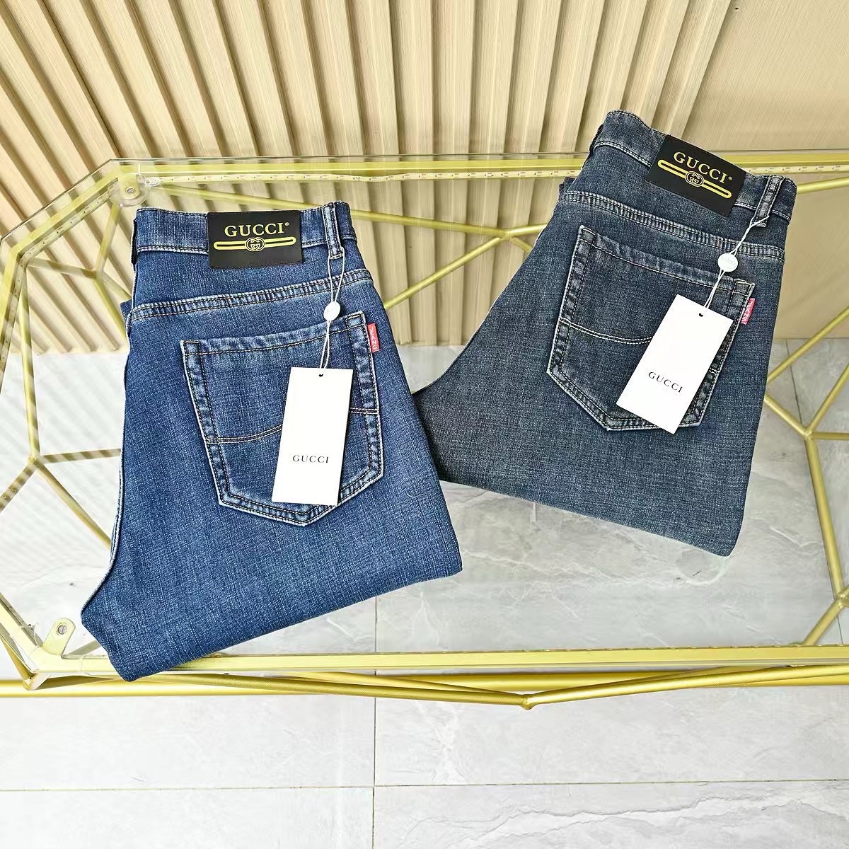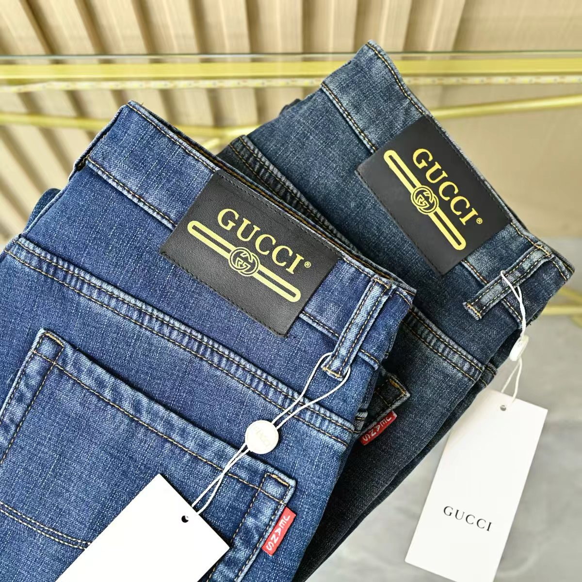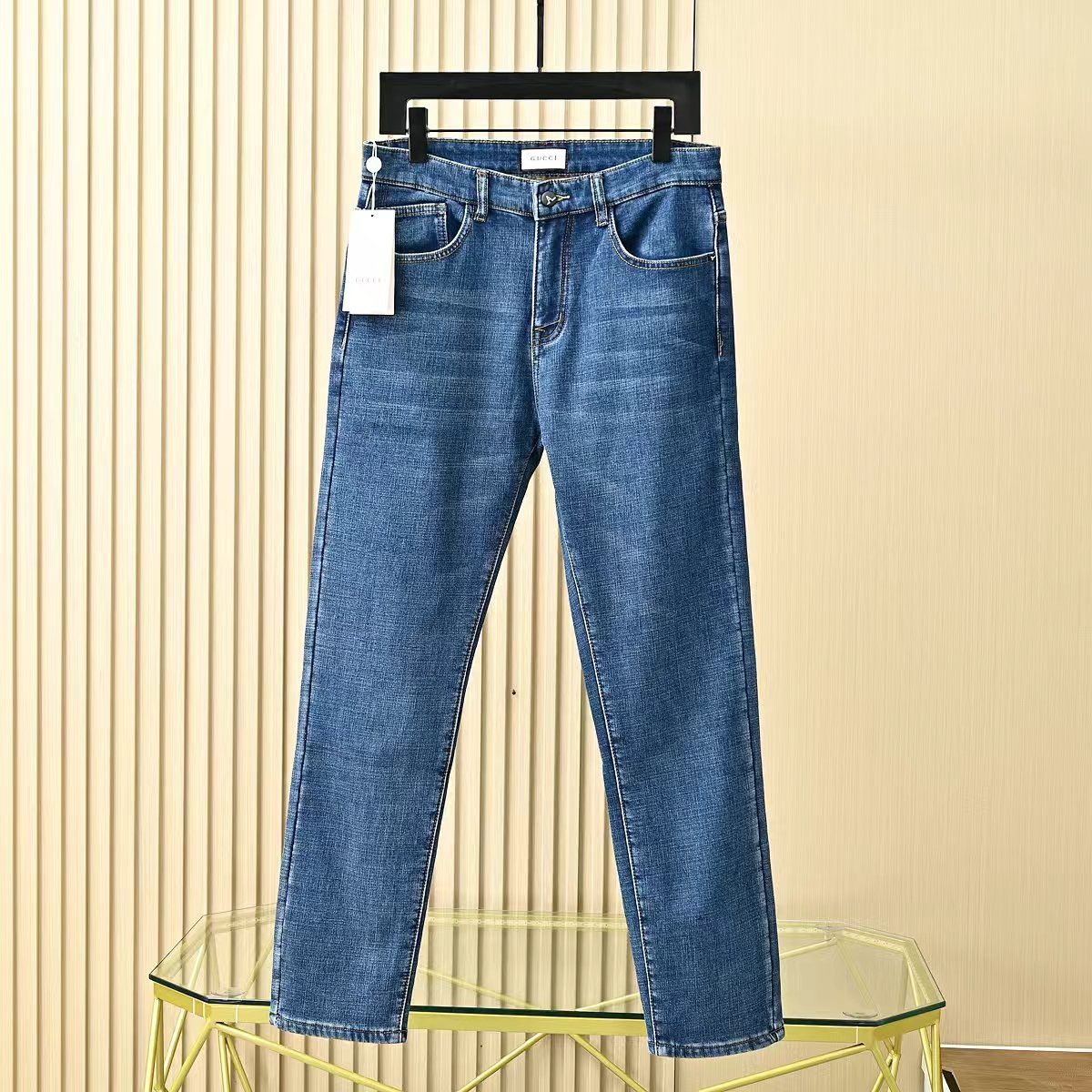 Gucci古驰秋冬新款字母皮标加绒加厚商务休闲弹力直筒牛仔裤。
