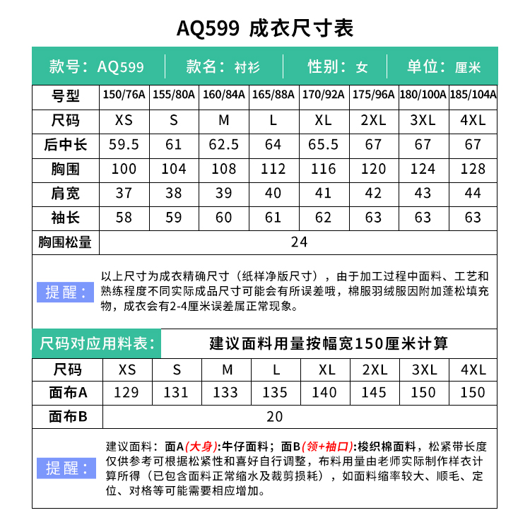 裁缝学苑AQ599正肩牛仔衬衫纸样女装新款复古叠穿外套上衣打板裁剪图