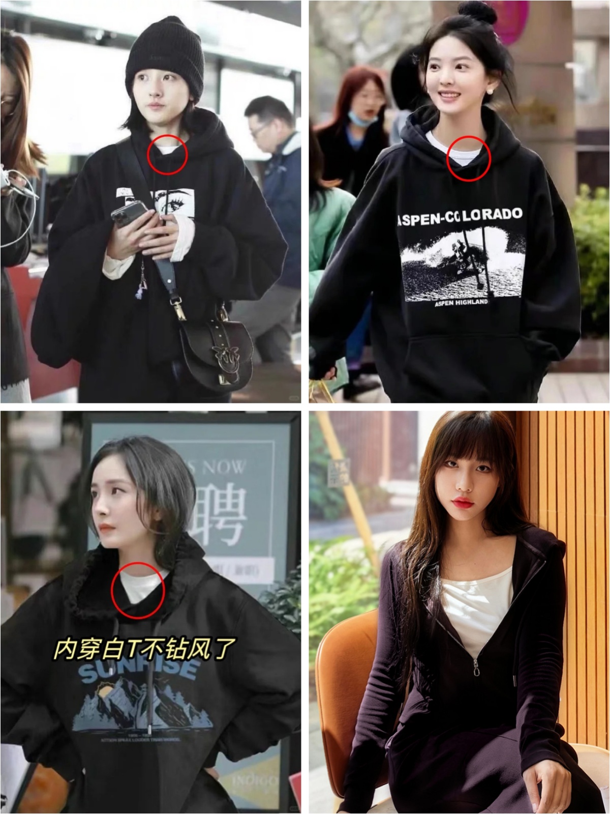 衣里面穿什么!钻风啊,空空的特别冷,有没有?这不,我发现了明星穿卫衣的秘诀,这个穿搭公式大家学起来!那就是卫衣里面穿白T,显得好干净温暖啊!