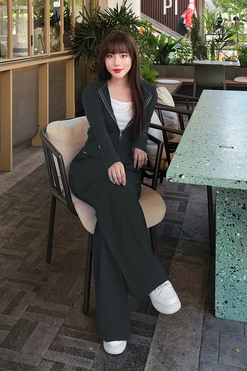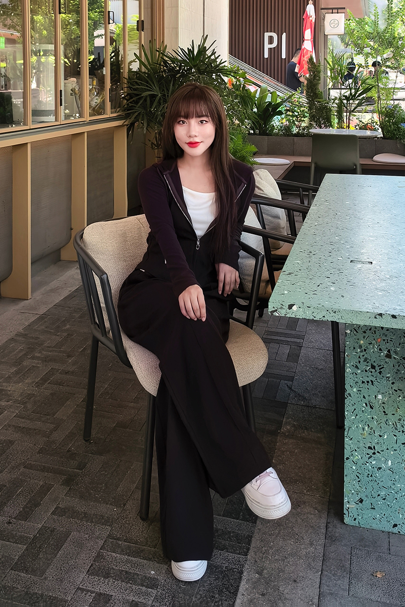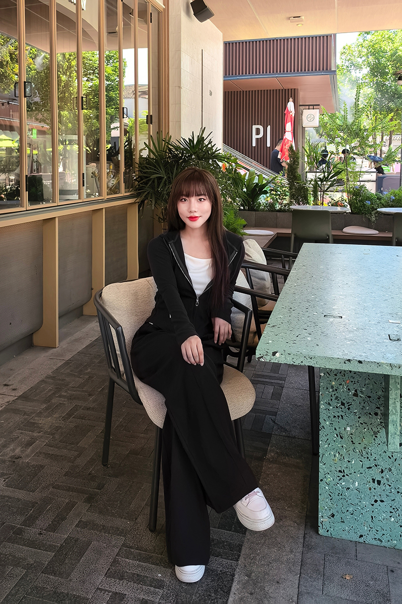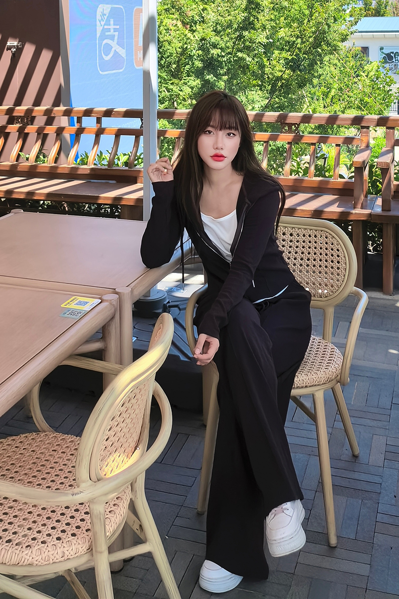 里面直接穿一件运动内衣就行了,白T底下边边还做了加长设计,拉链拉起来露出一条白边,松弛又自然。