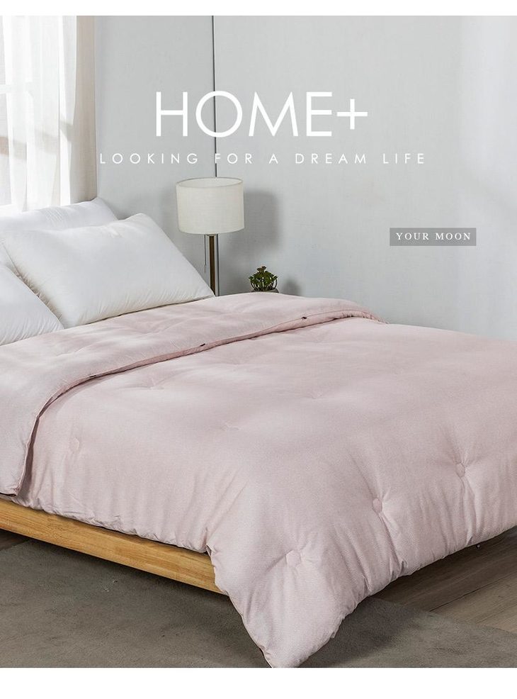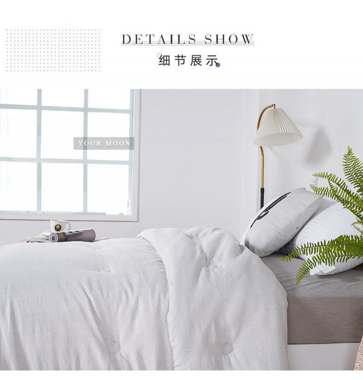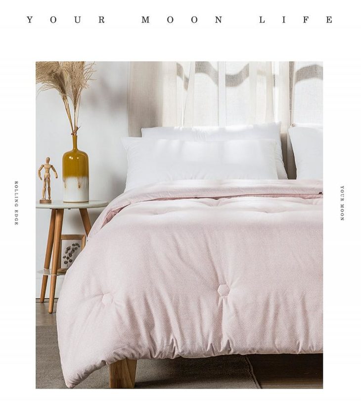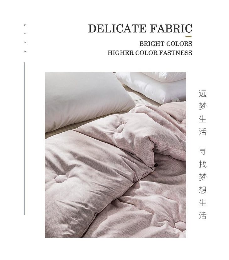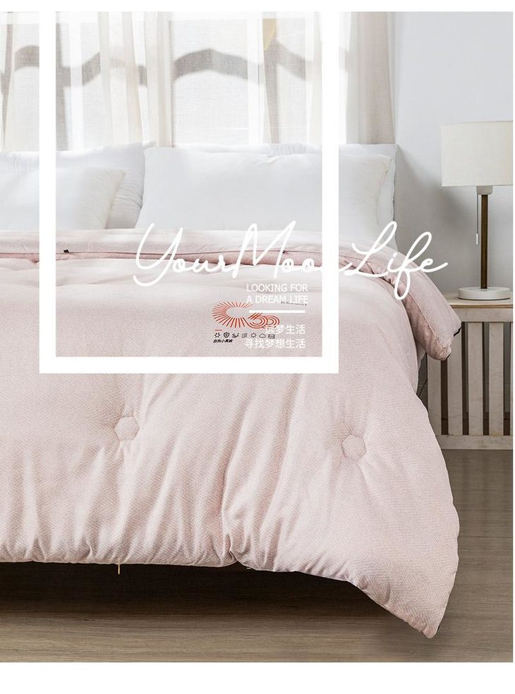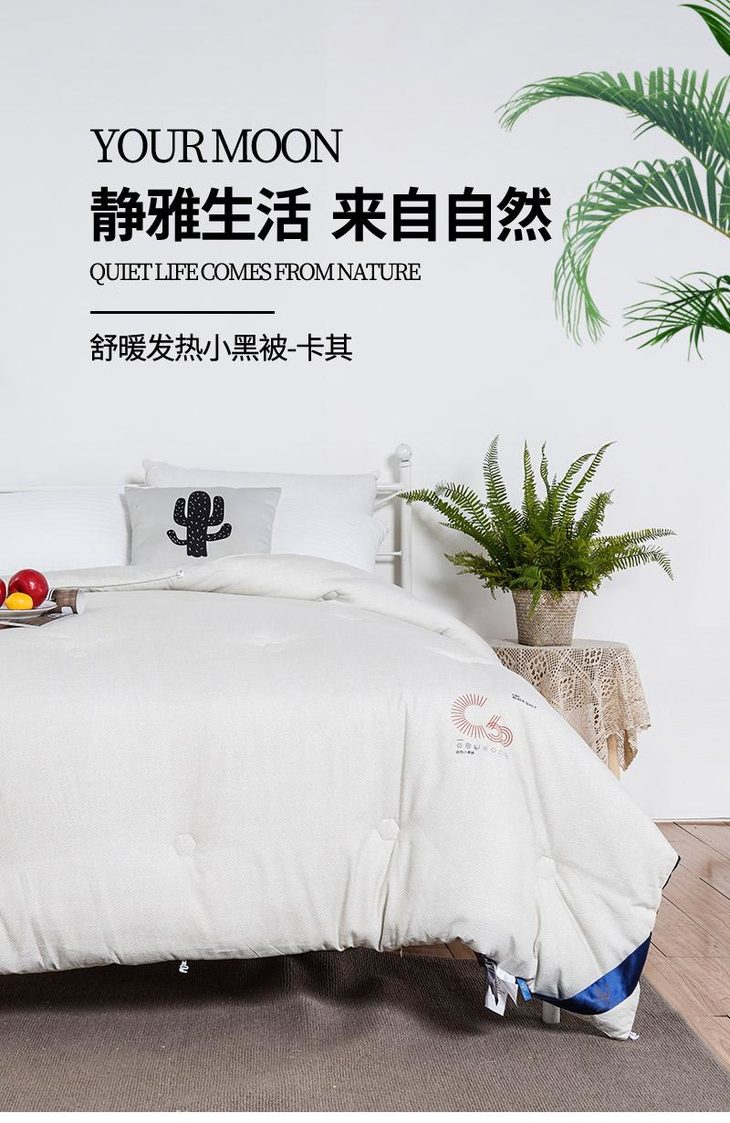 b.【暖阳绒面料】面料采用柔软亲和的暖阳绒面料,纤维绒感长,接触即暖,给肌肤带来轻柔触感,盖着它,就像被窝里的小太阳。面料花型设计为简约的商标图案,朦胧的肌理纹搭配素色底,使得被面温馨净雅,适合各种风格的家装。超柔暖芯纤维填充,细腻柔软,畅享睡眠。