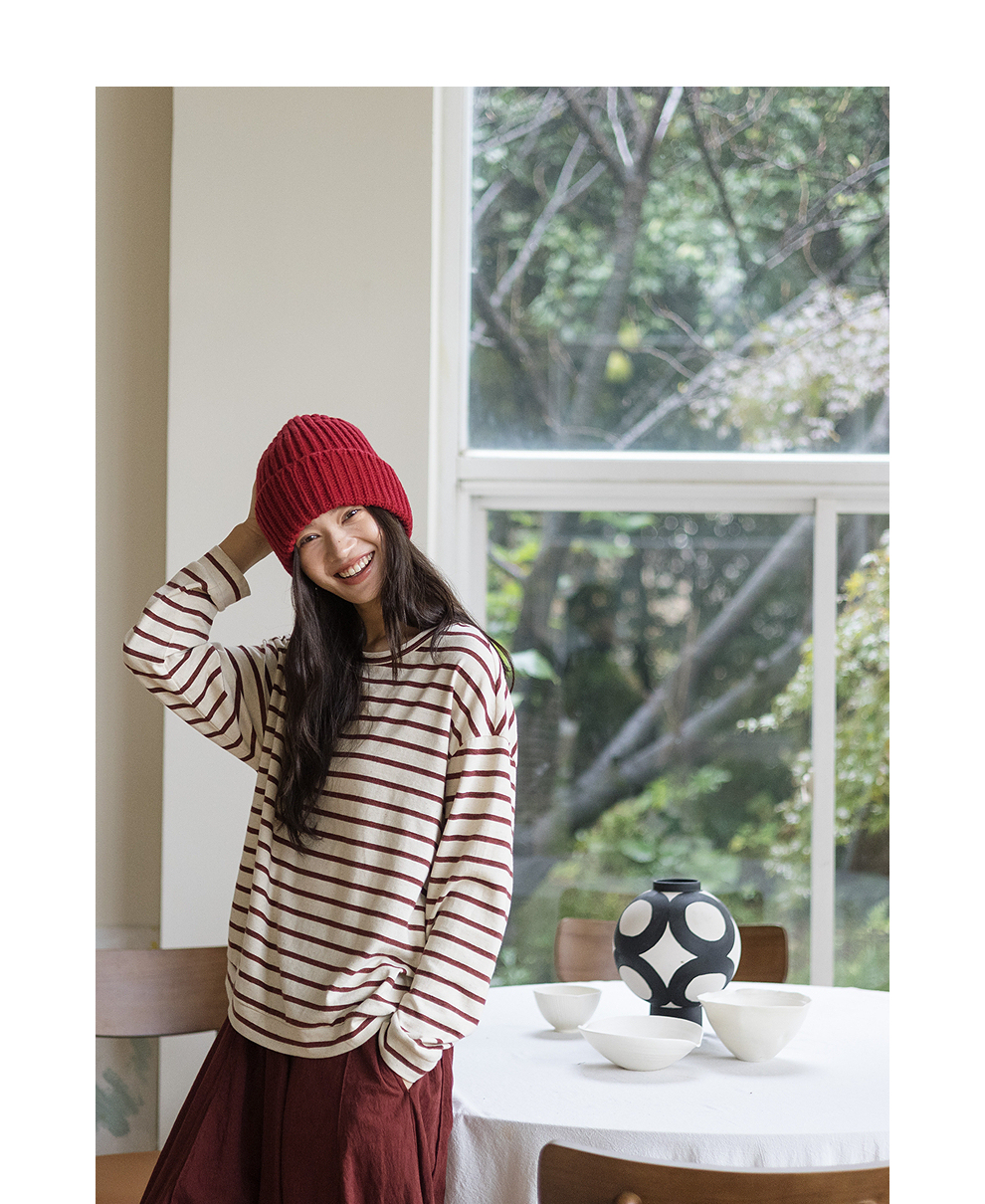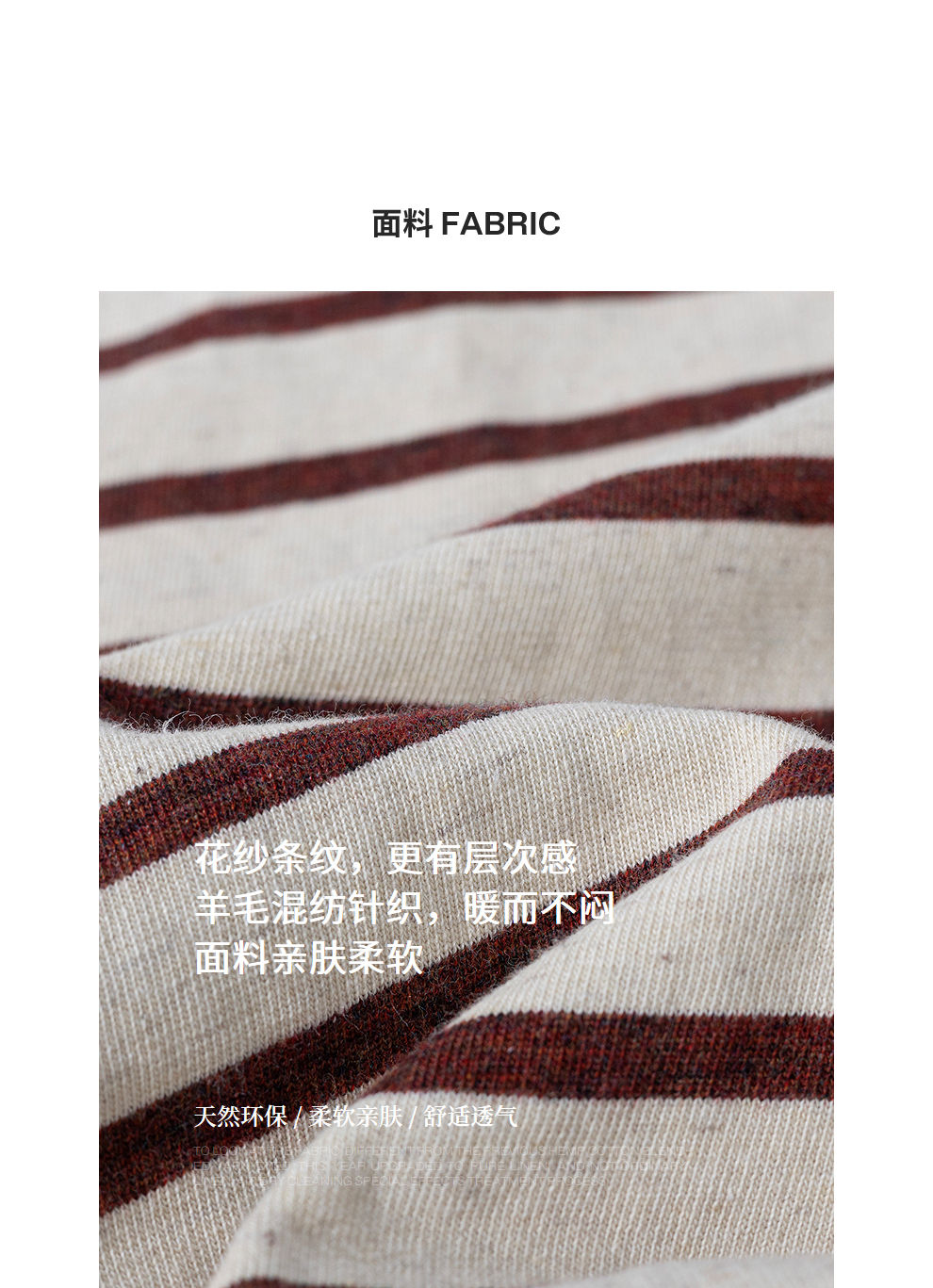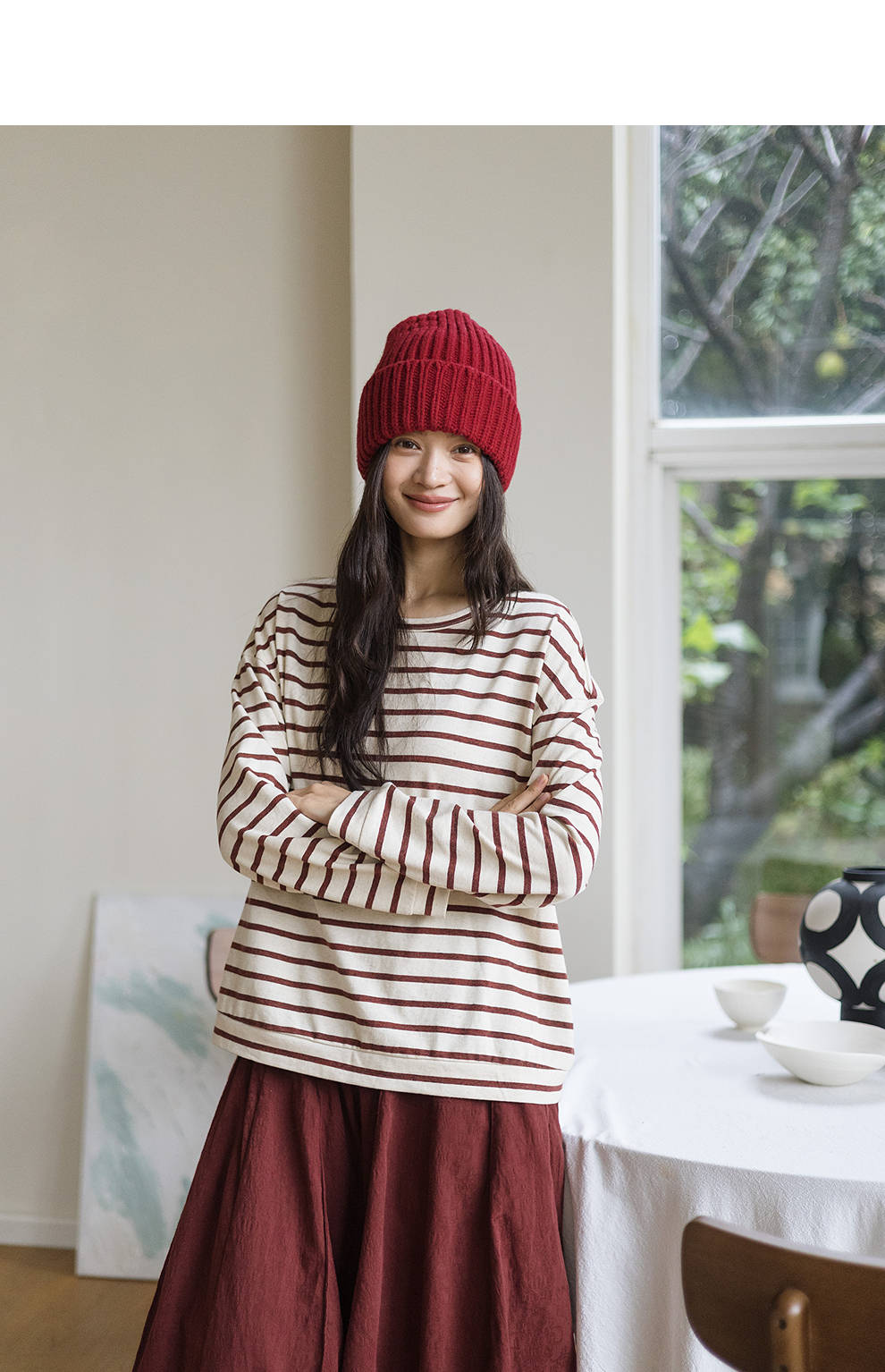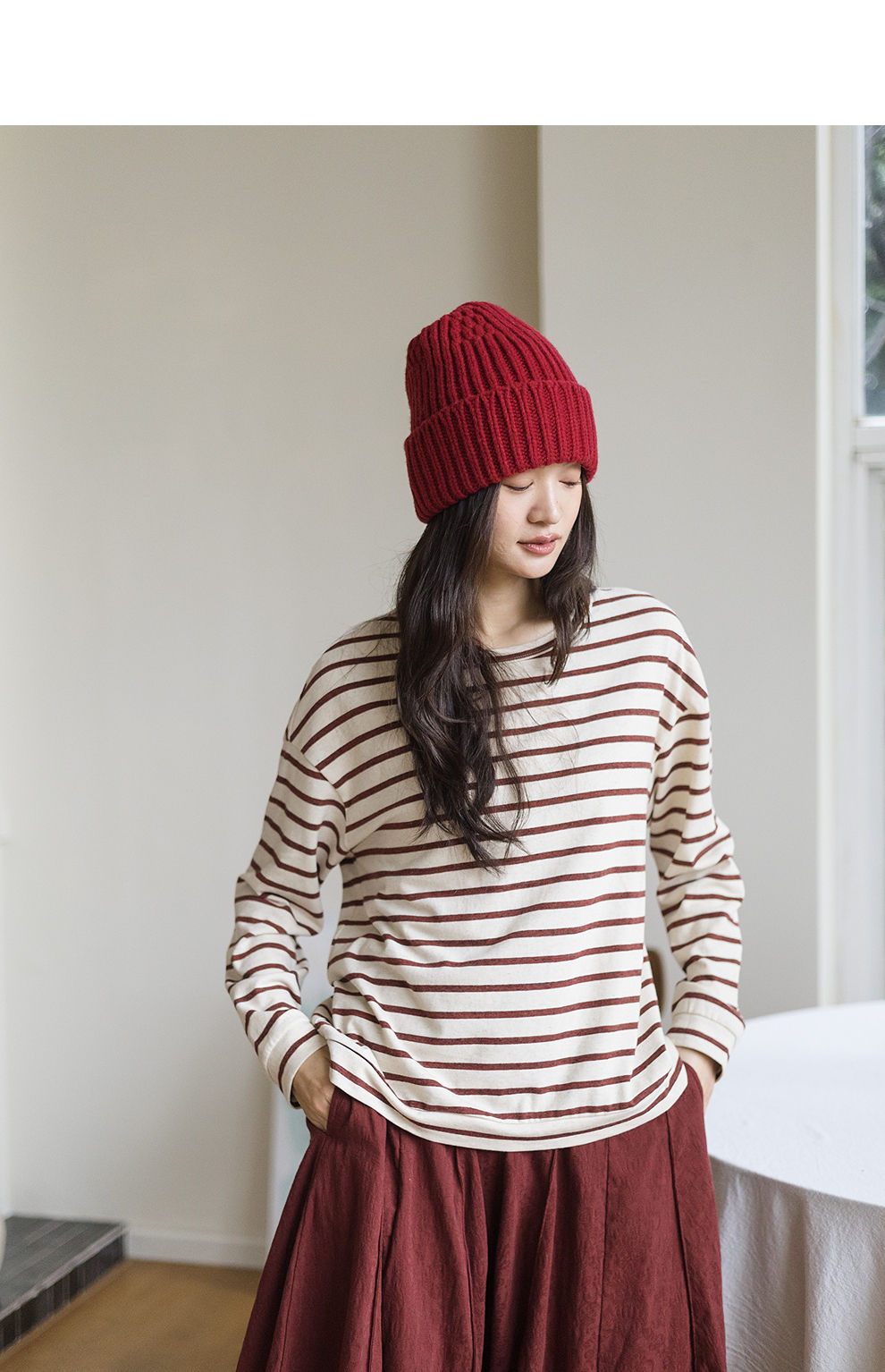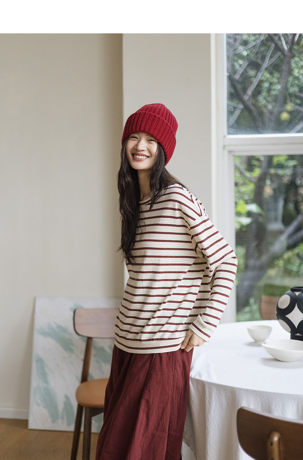 绽放816朵/羊毛汉麻棉色纺纱圆领落肩条纹长袖T恤女冬打底衫内搭