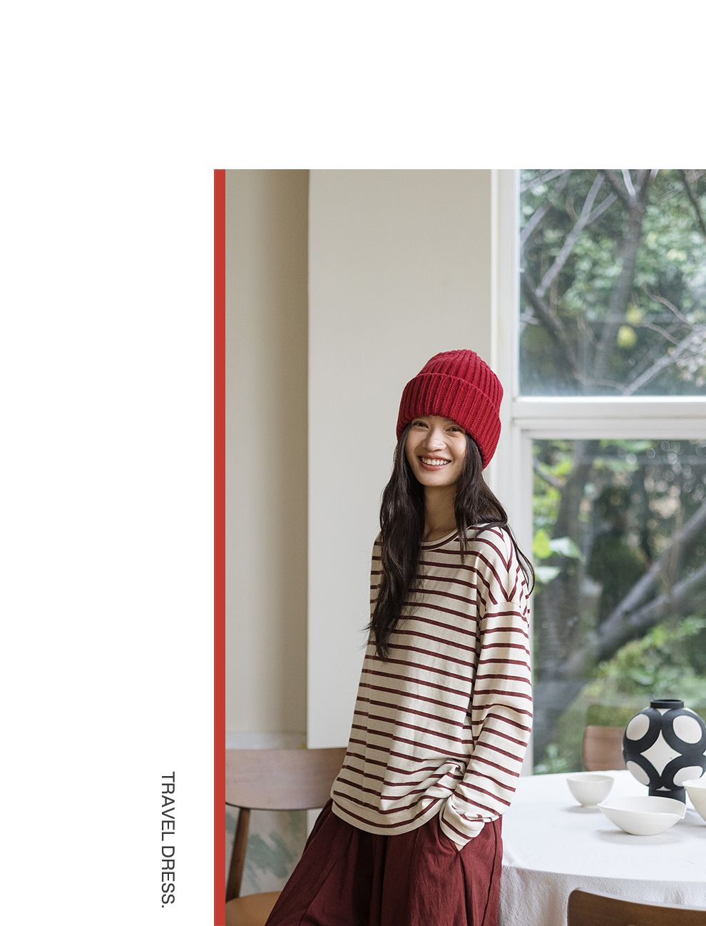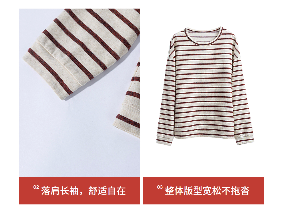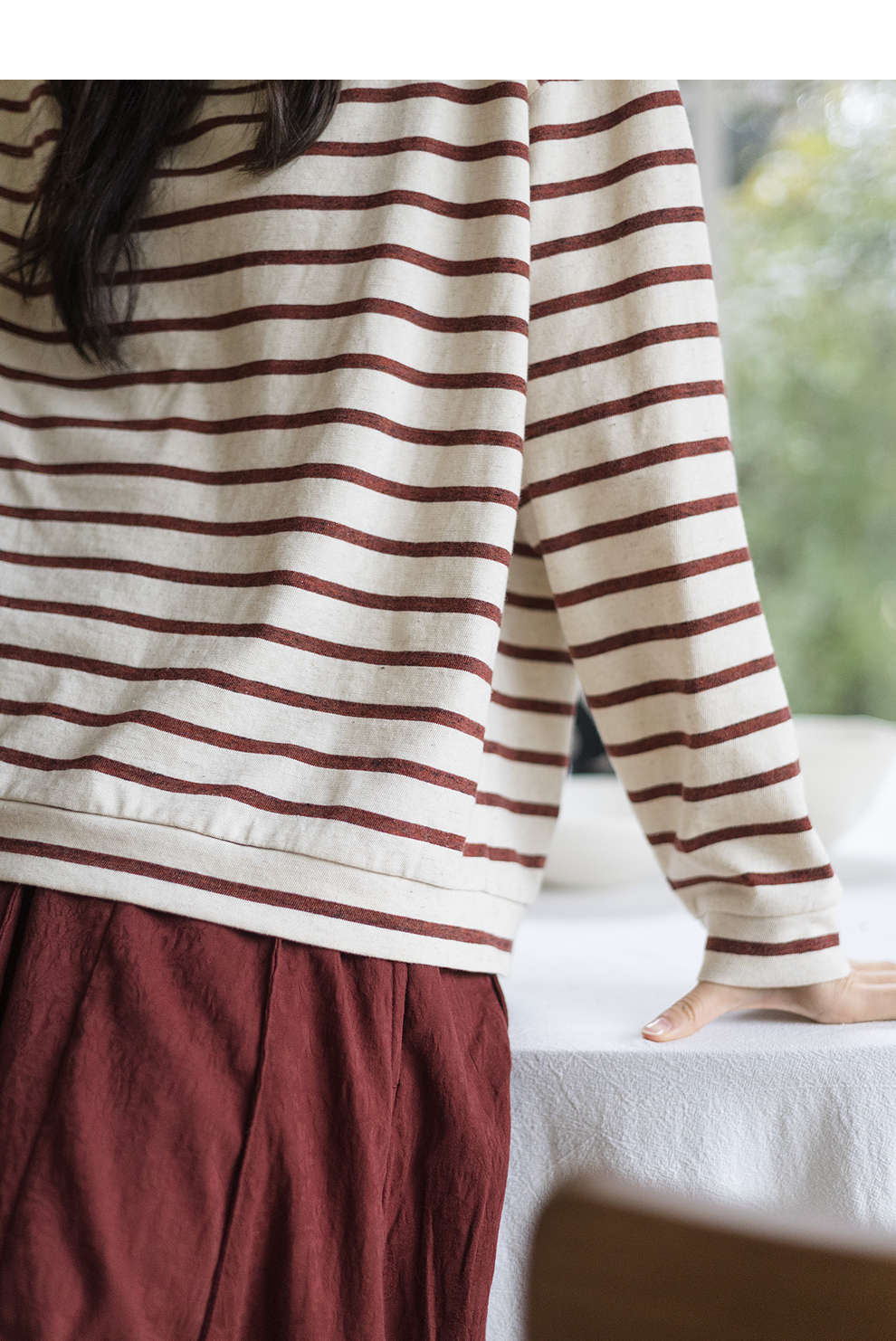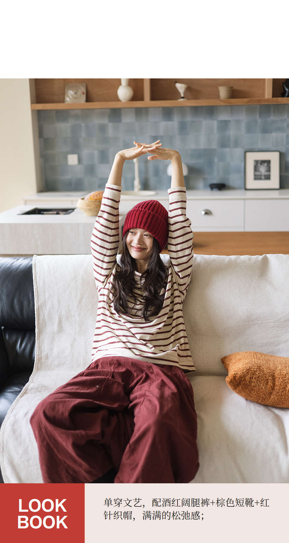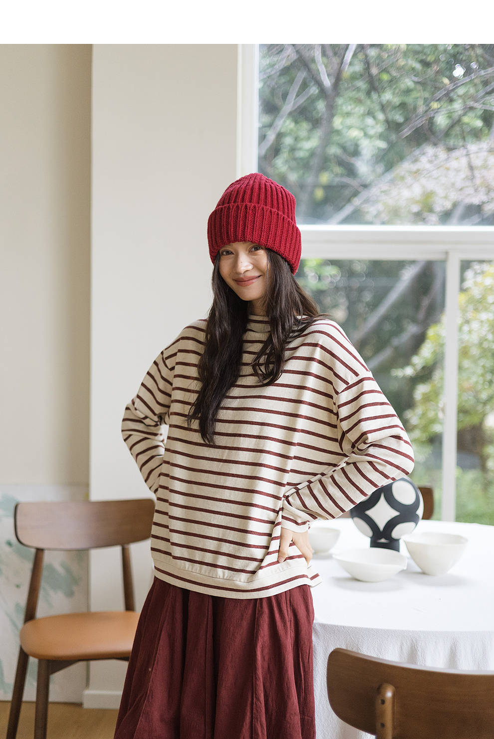 绽放816朵/羊毛汉麻棉色纺纱圆领落肩条纹长袖T恤女冬打底衫内搭