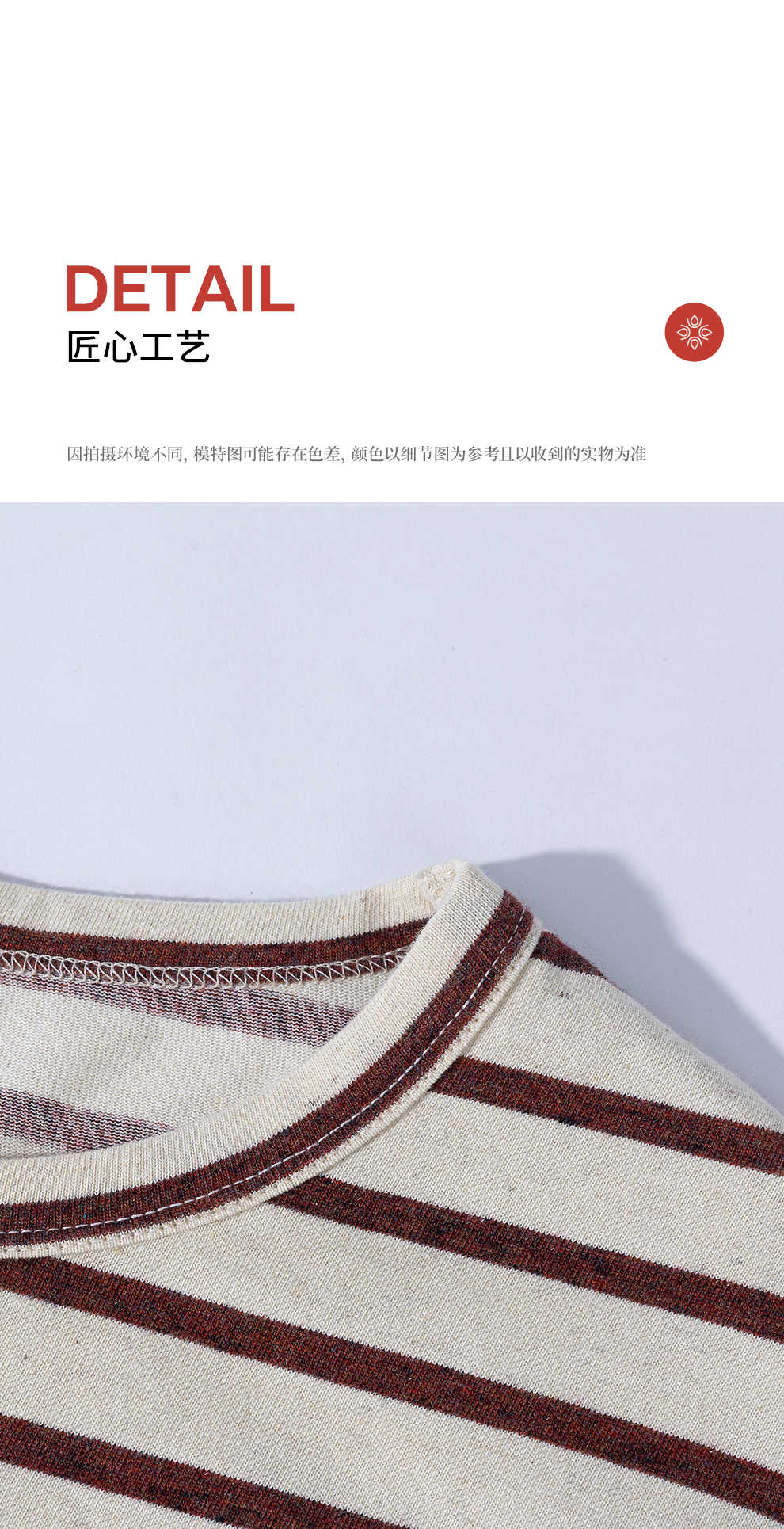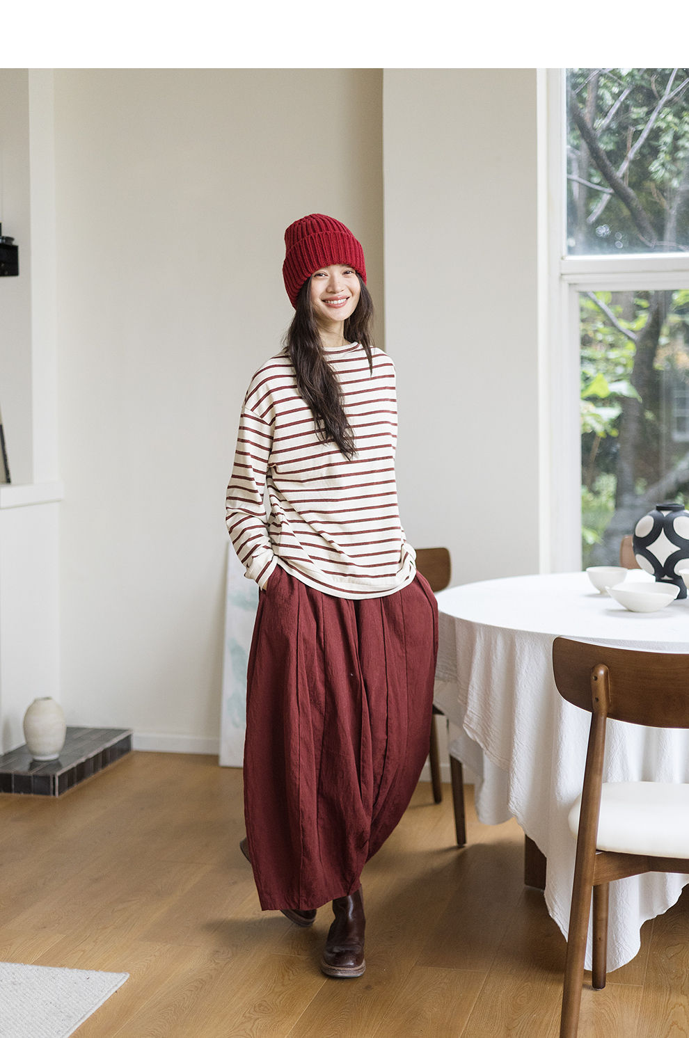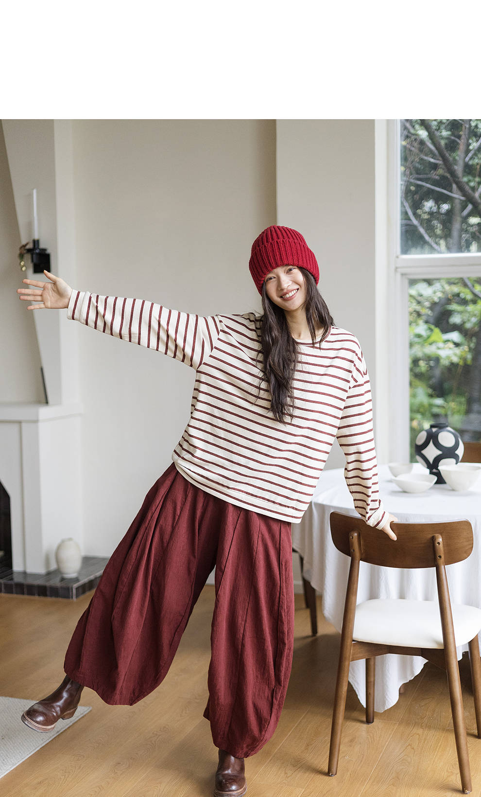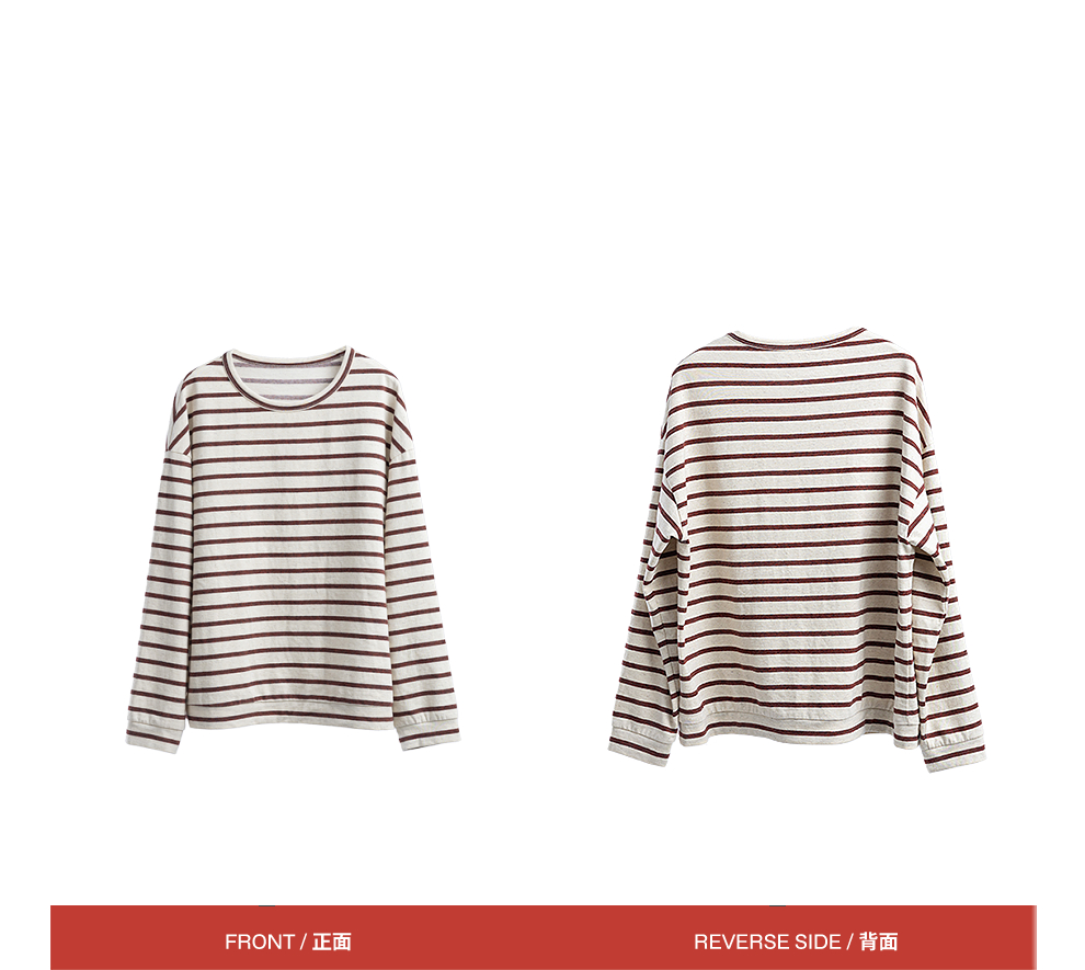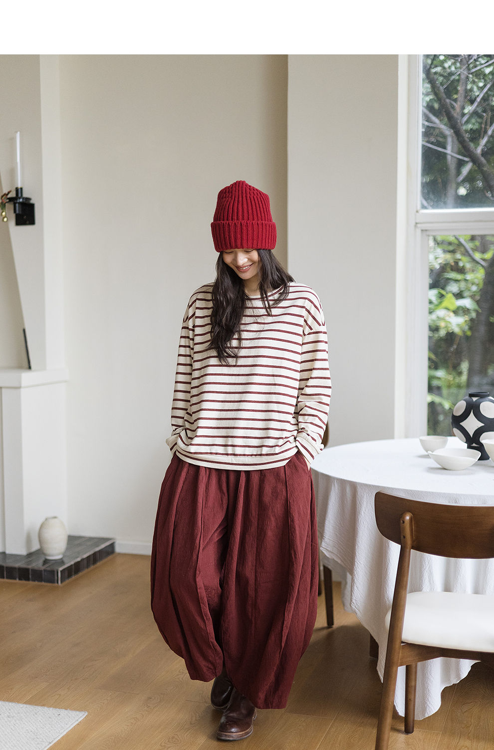 绽放816朵/羊毛汉麻棉色纺纱圆领落肩条纹长袖T恤女冬打底衫内搭