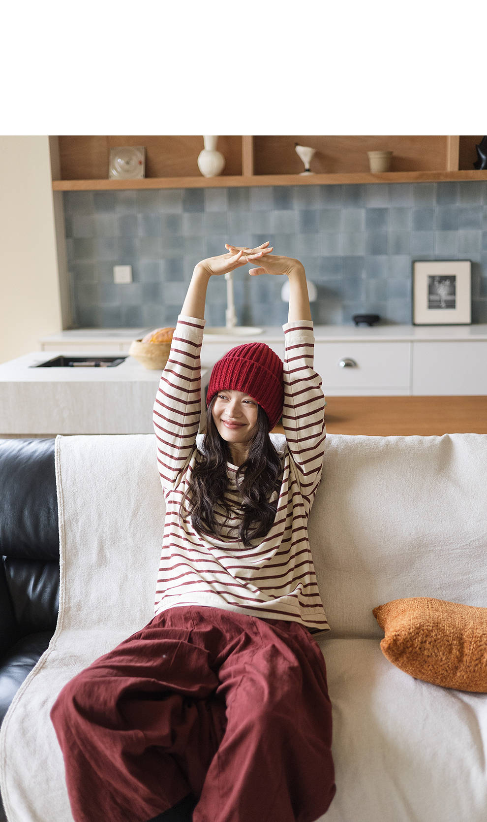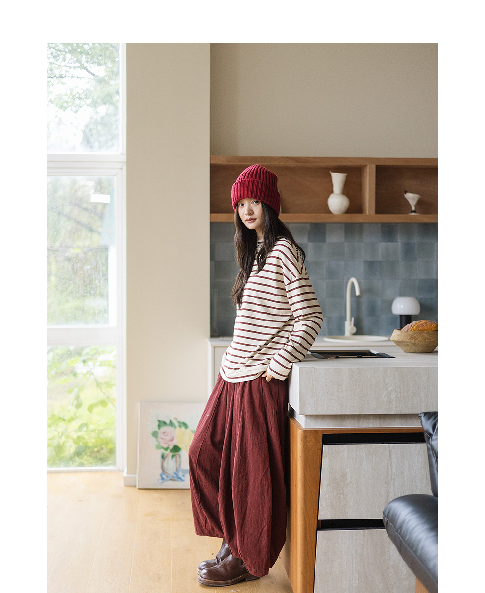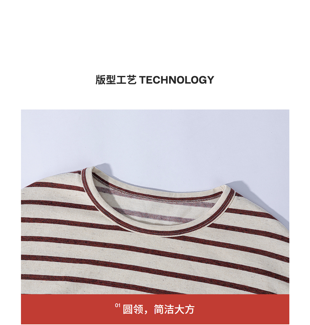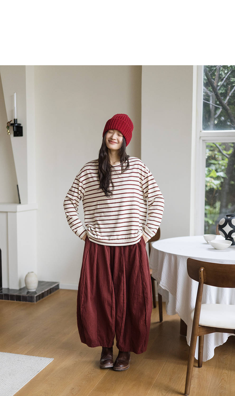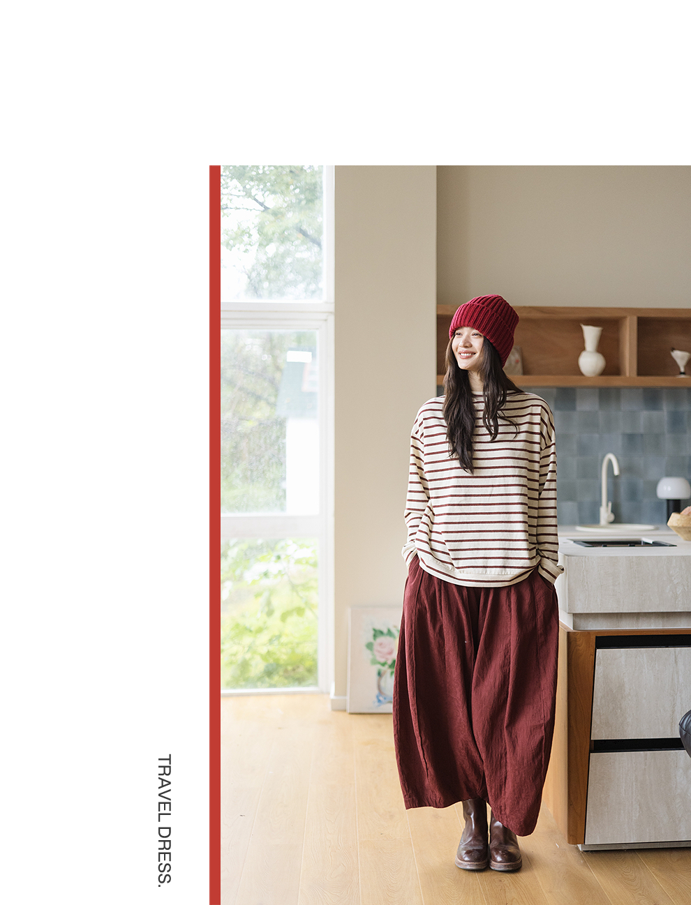 绽放816朵/羊毛汉麻棉色纺纱圆领落肩条纹长袖T恤女冬打底衫内搭