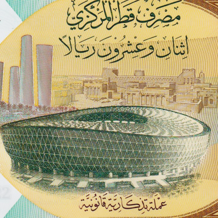 卡塔尔世界杯纪念钞,钞票正面主景图案为举办本次世界杯的主体育场——卢塞尔球场,接下来的决赛将会在此举办,冠军也将从这里诞生!