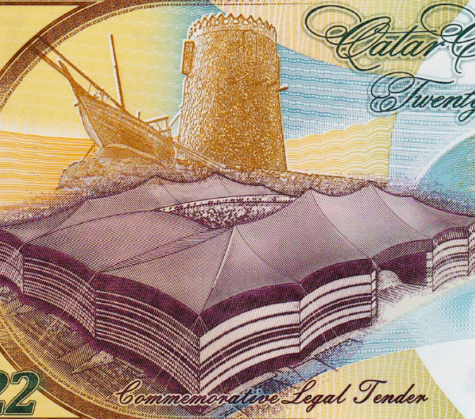 钞票背面则是卡塔尔的海湾体育场,设计灵感来自海湾地区游牧民族使用的传统帐篷。