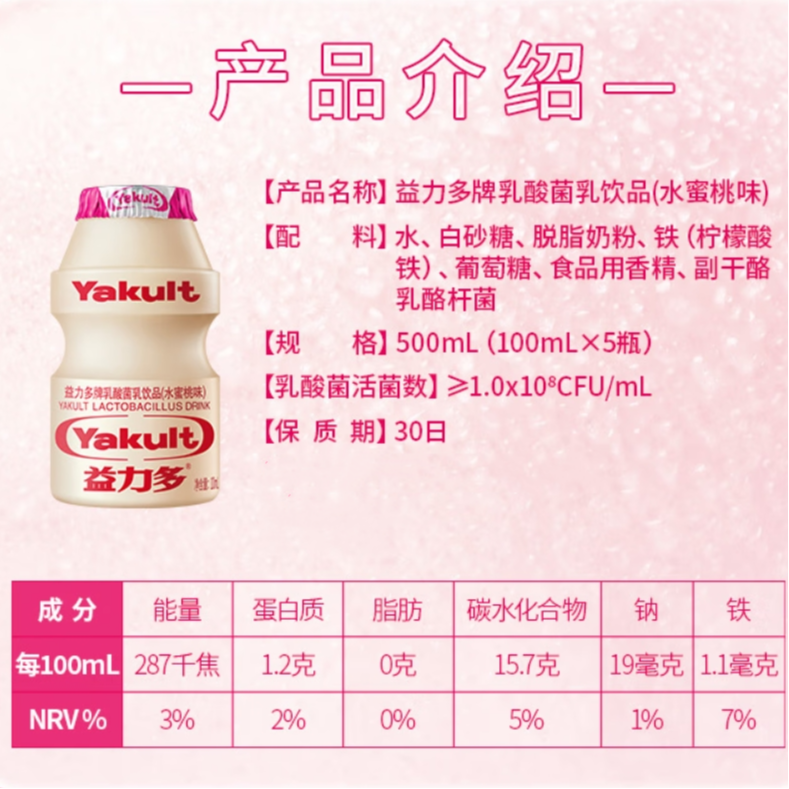 益力多乳酸菌乳饮品(水蜜桃味)100ml*5瓶(排装)