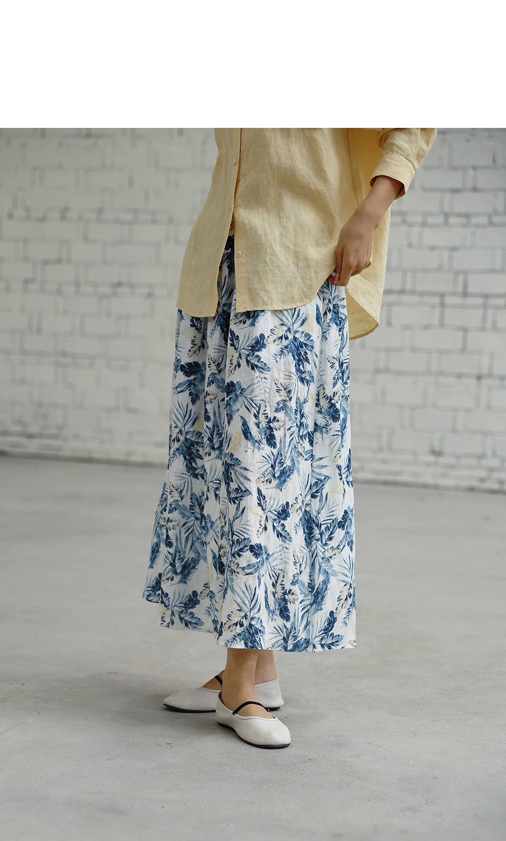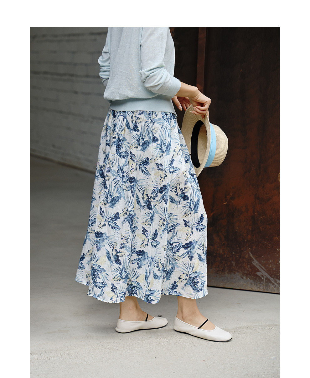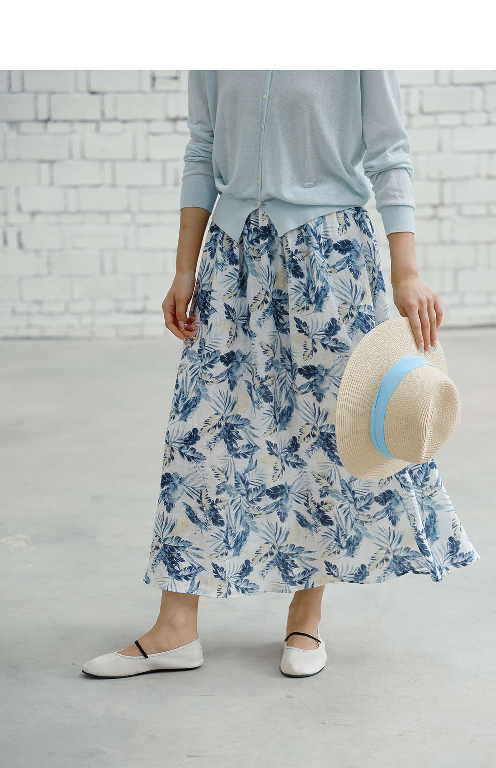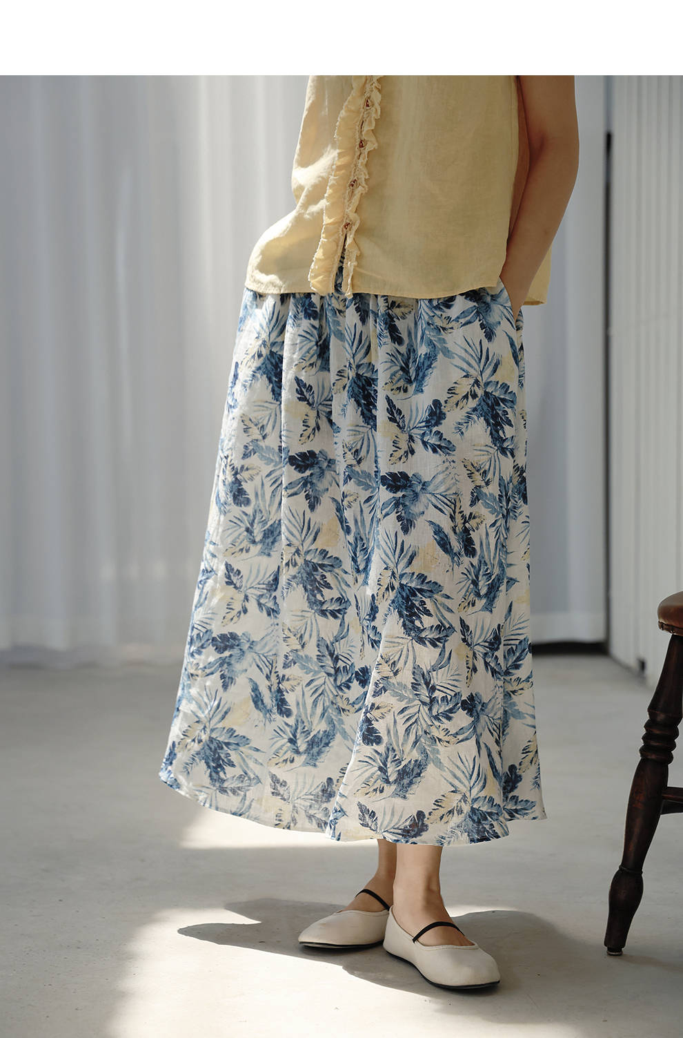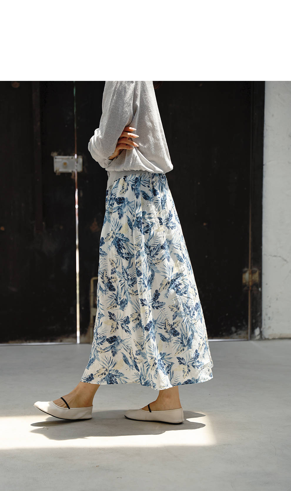 绽放女装411朵/【莫兰迪系列】双支数亚麻底布印花松紧腰半身裙女