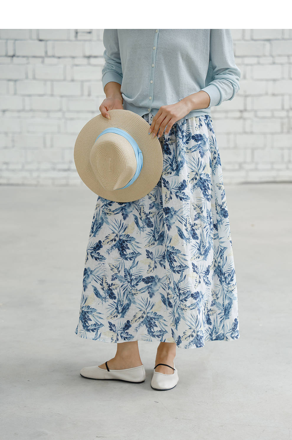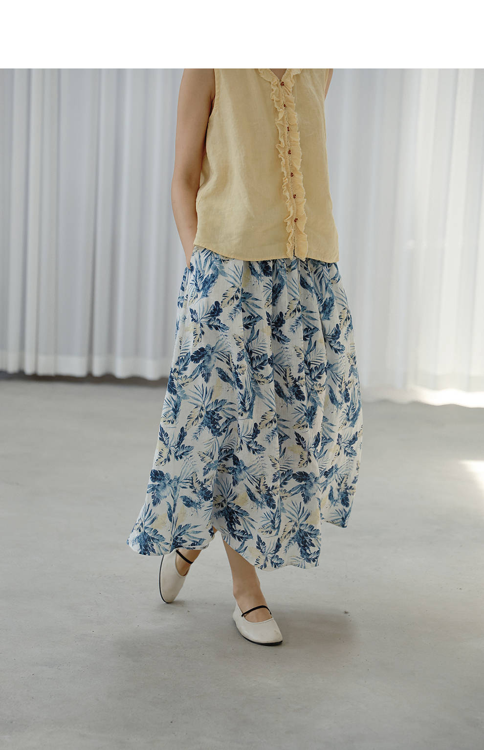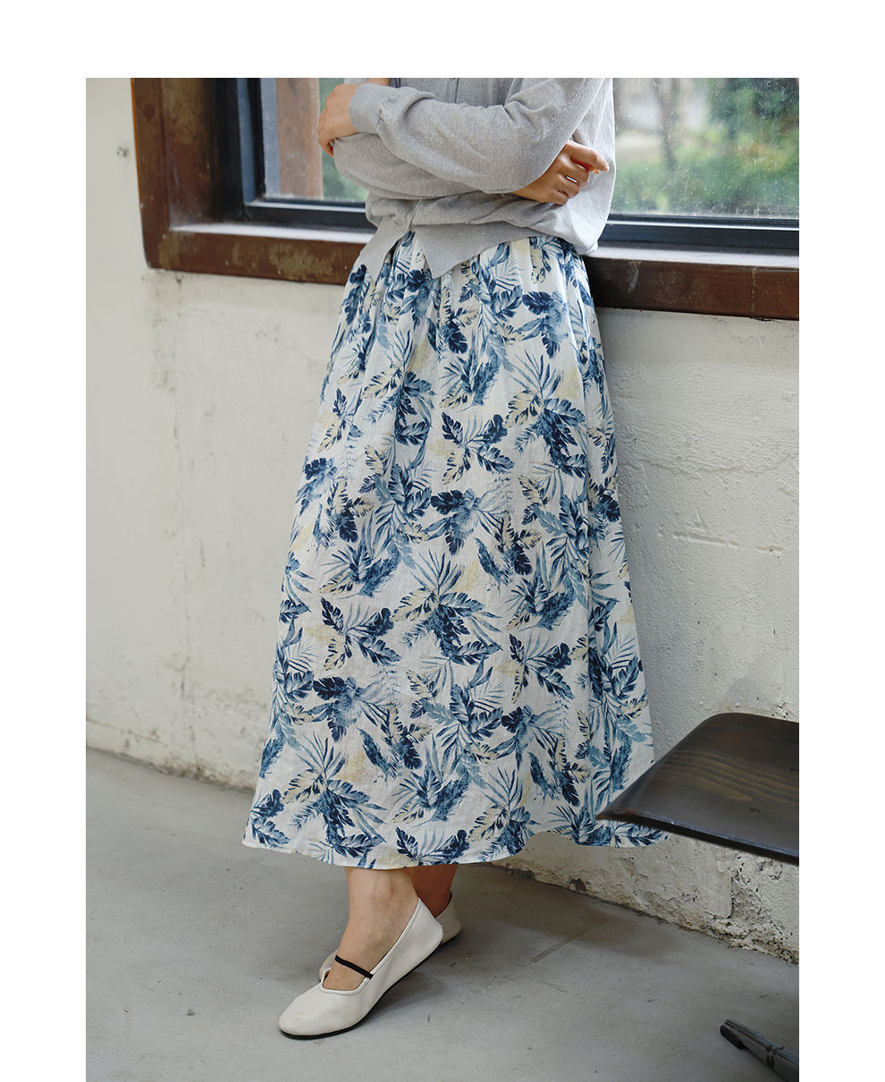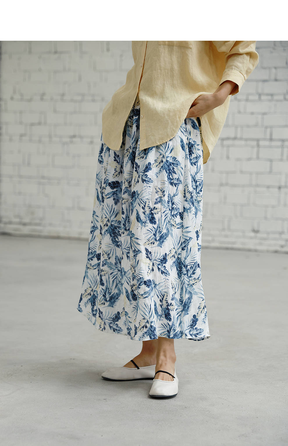 绽放女装411朵/【莫兰迪系列】双支数亚麻底布印花松紧腰半身裙女