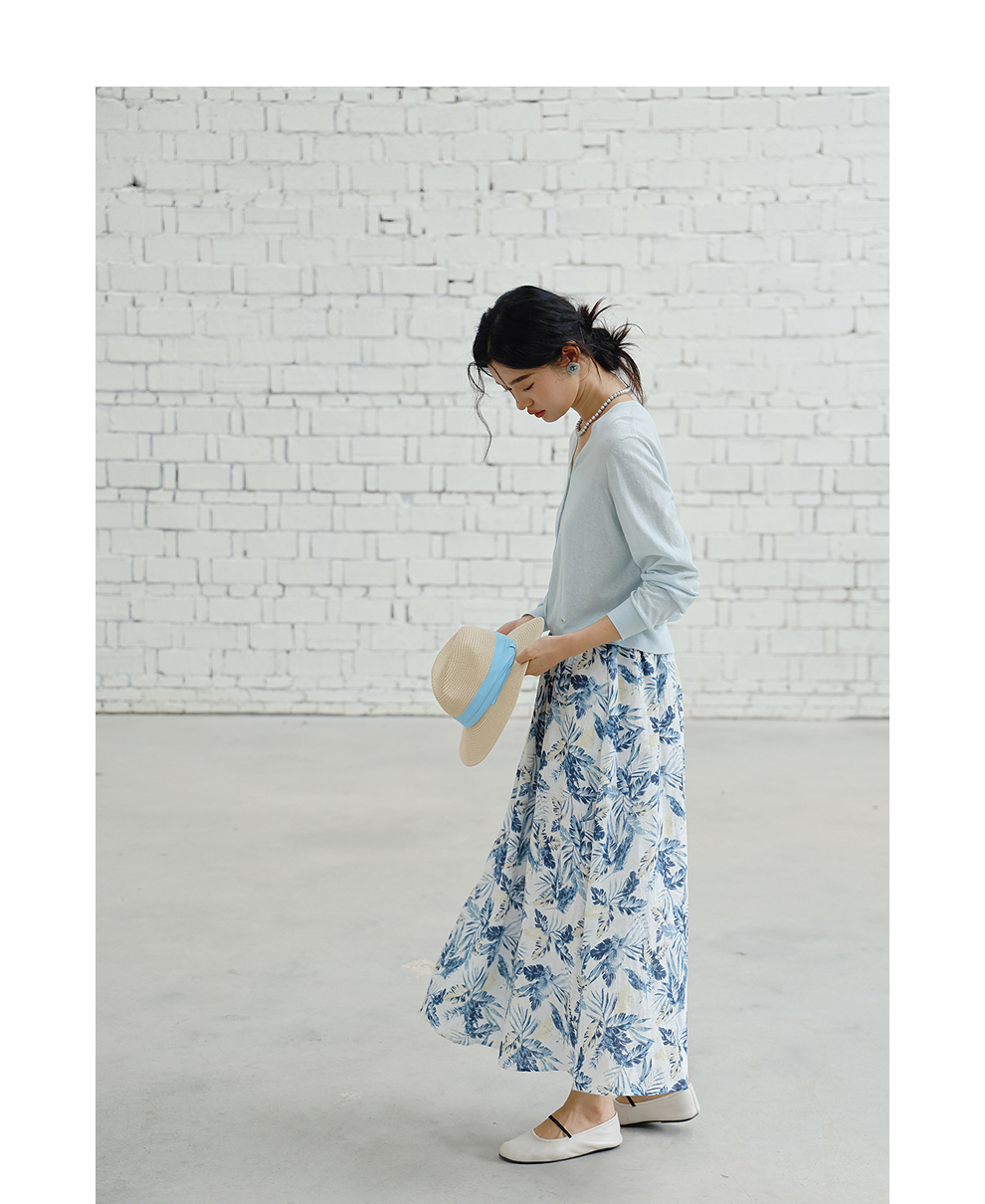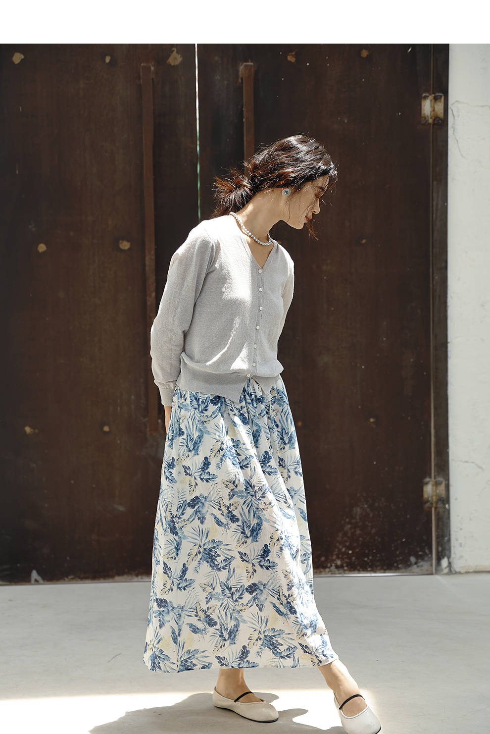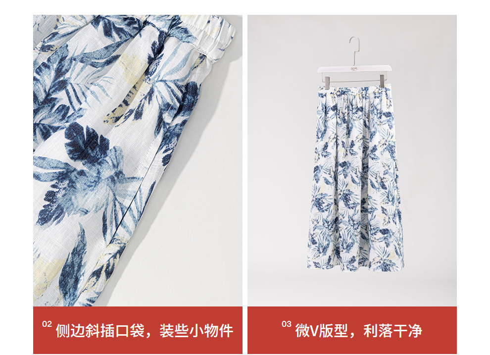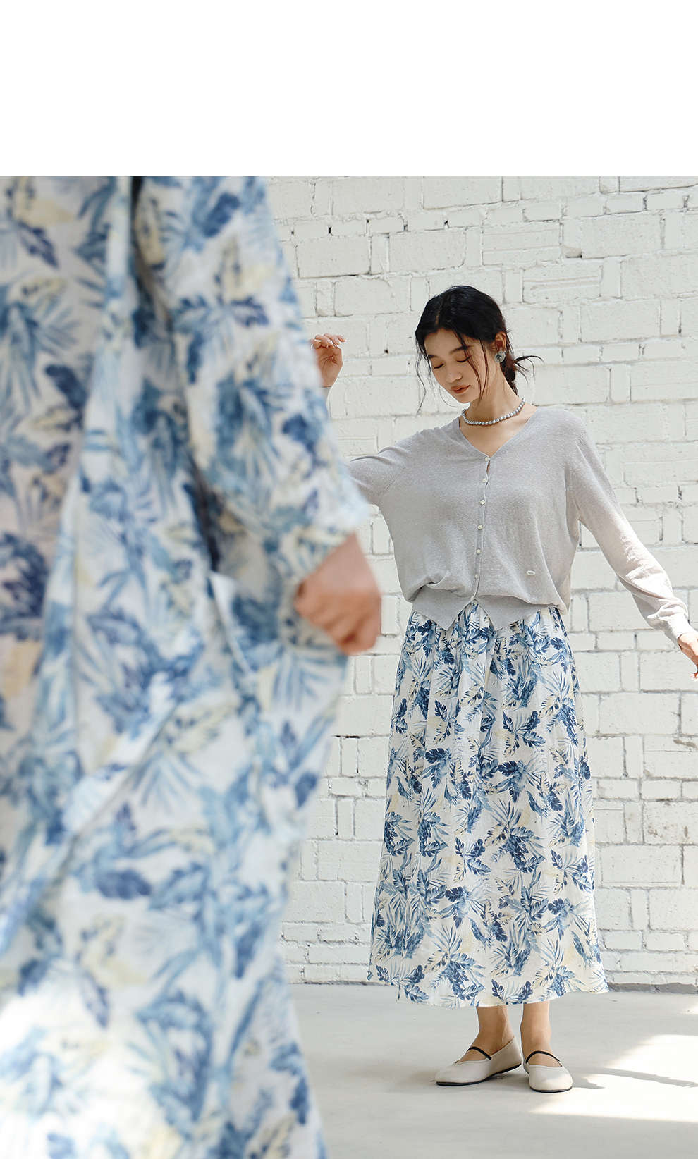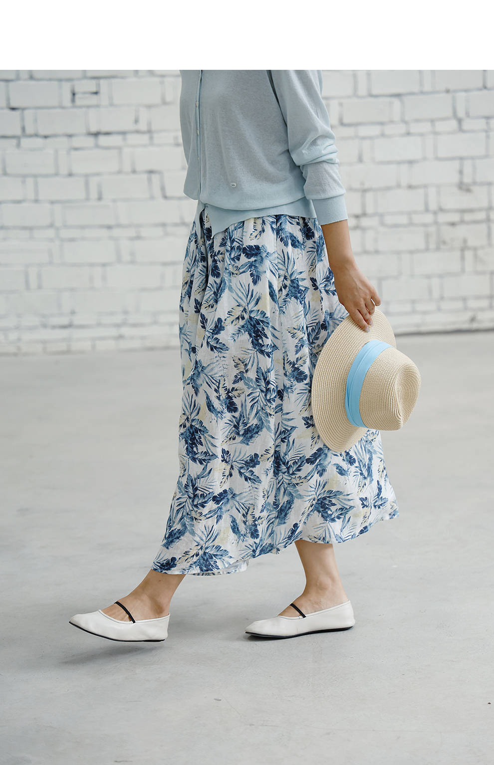 绽放女装411朵/【莫兰迪系列】双支数亚麻底布印花松紧腰半身裙女