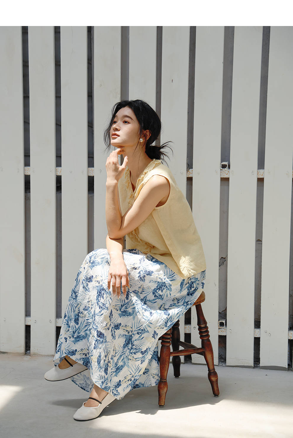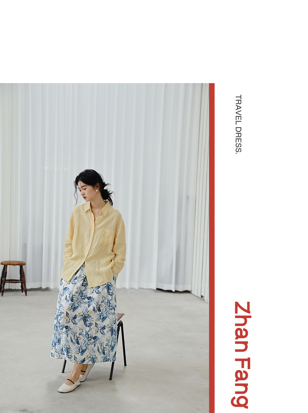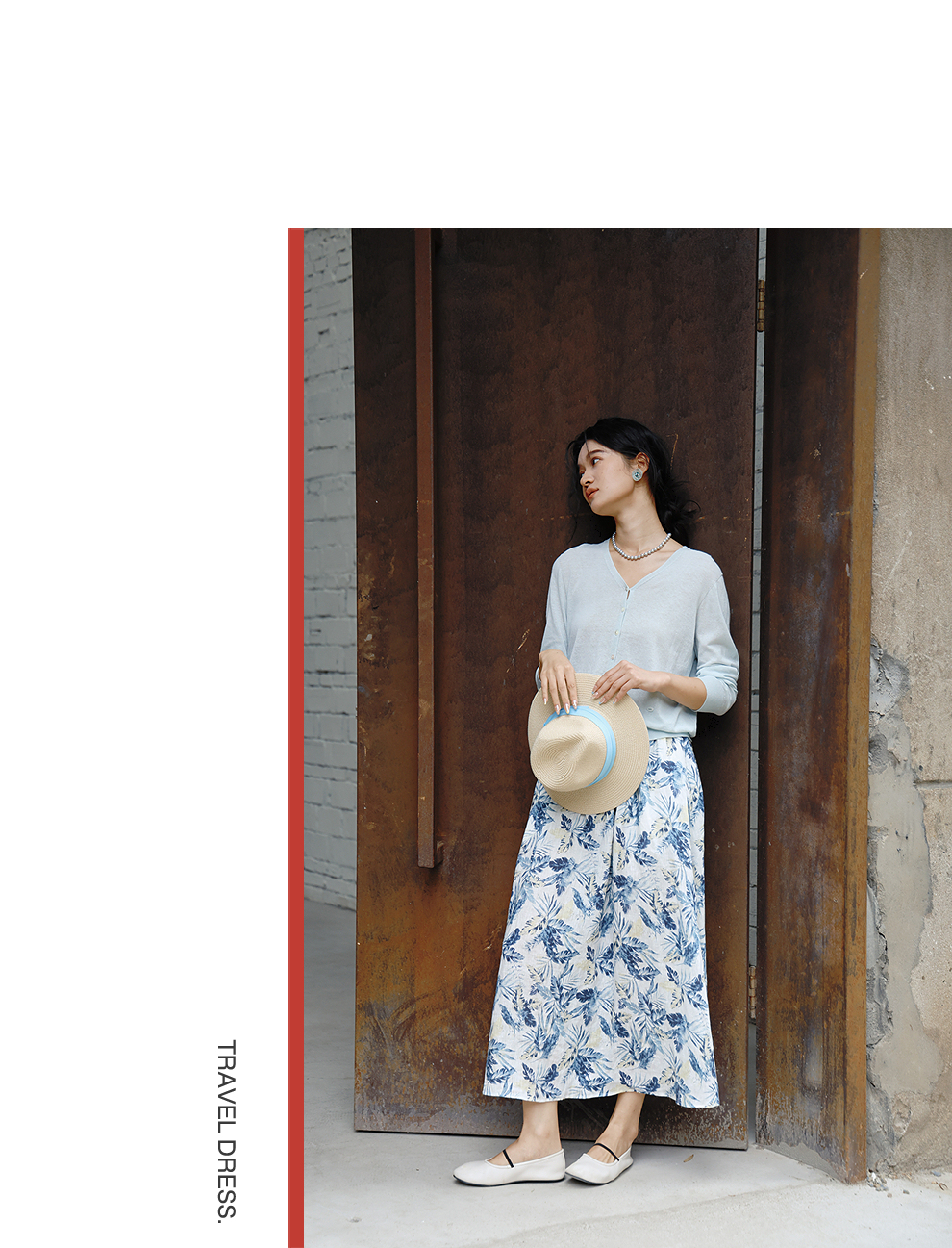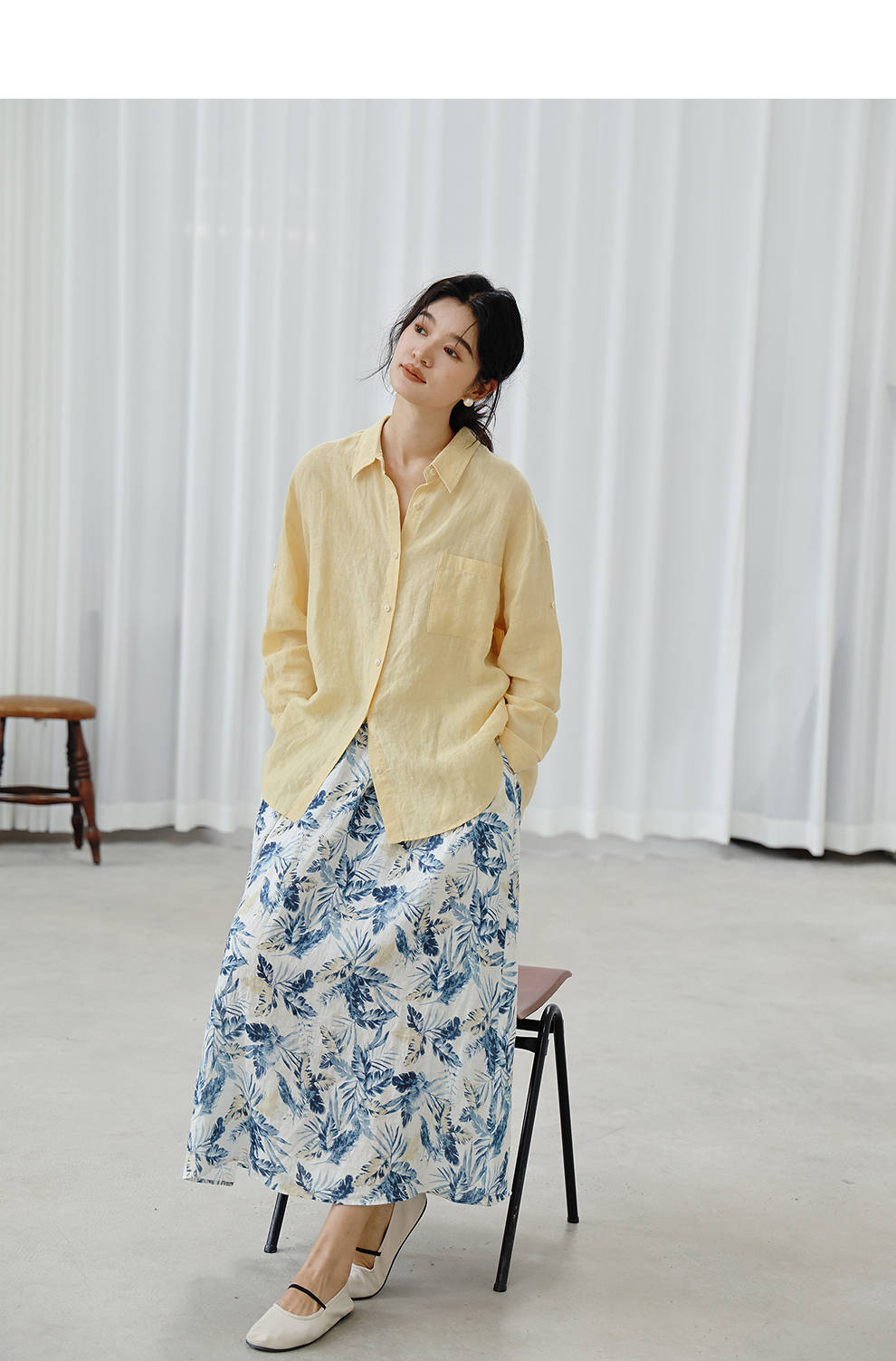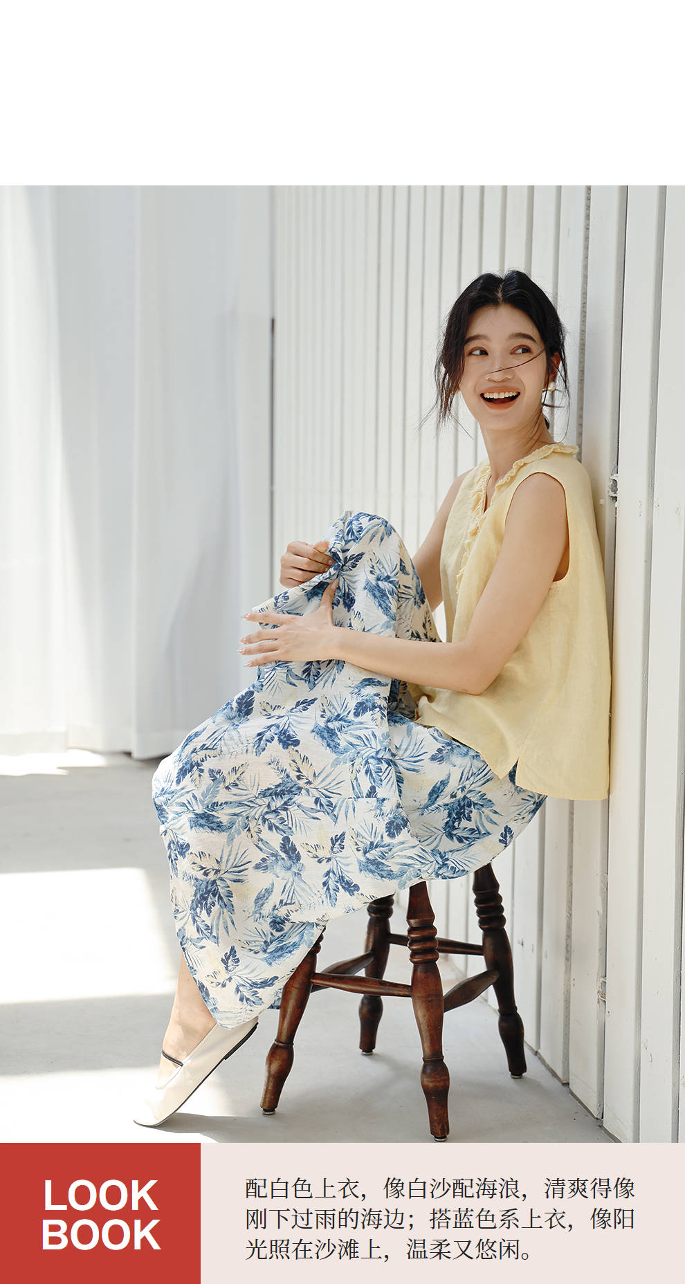 绽放女装411朵/【莫兰迪系列】双支数亚麻底布印花松紧腰半身裙女