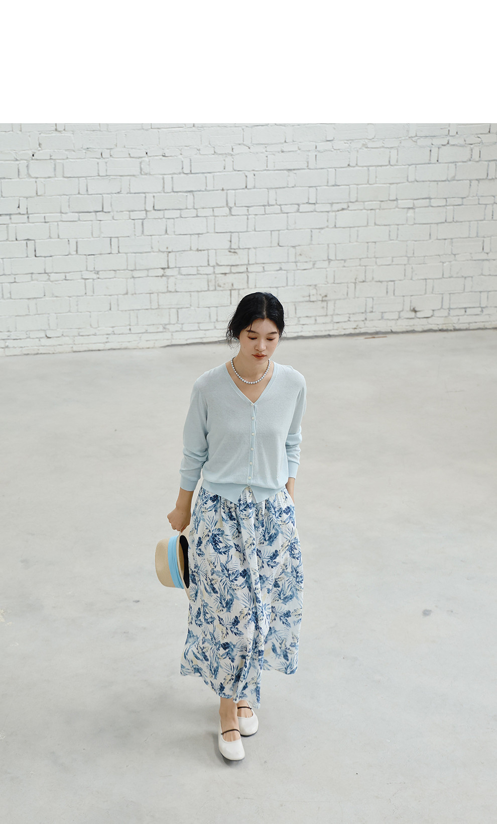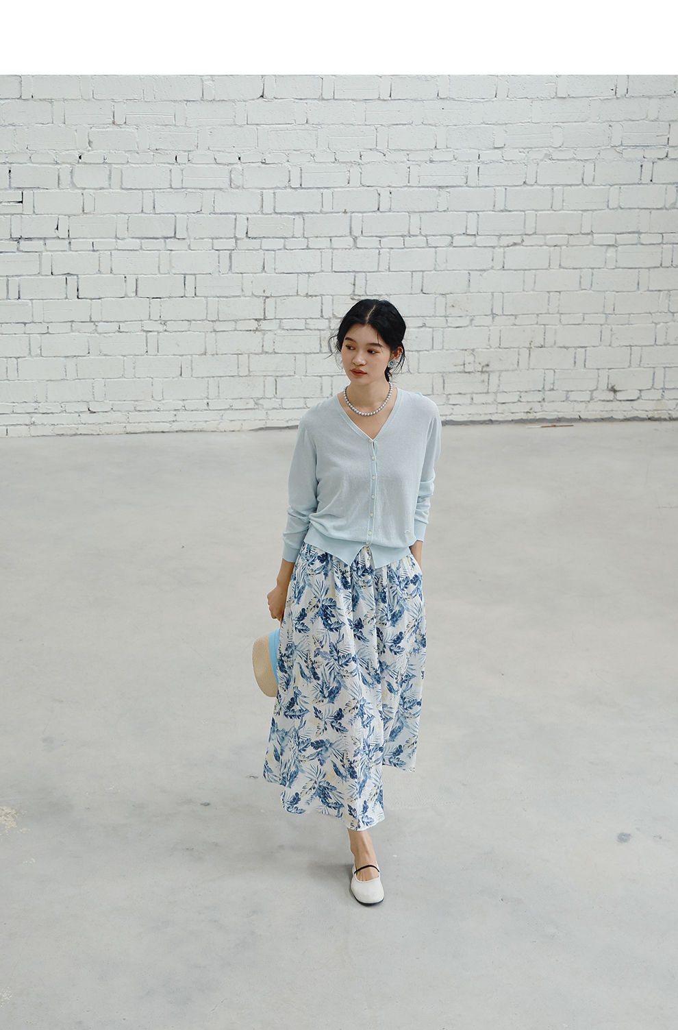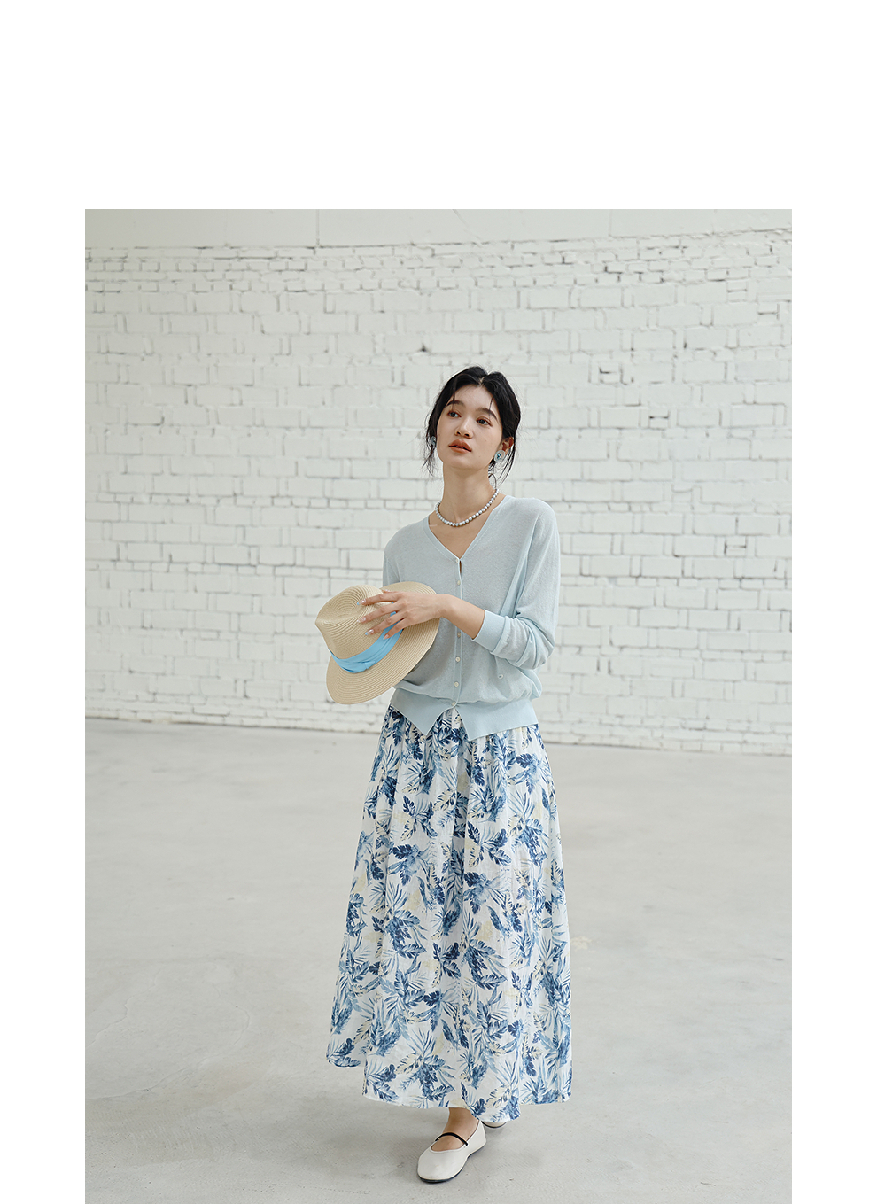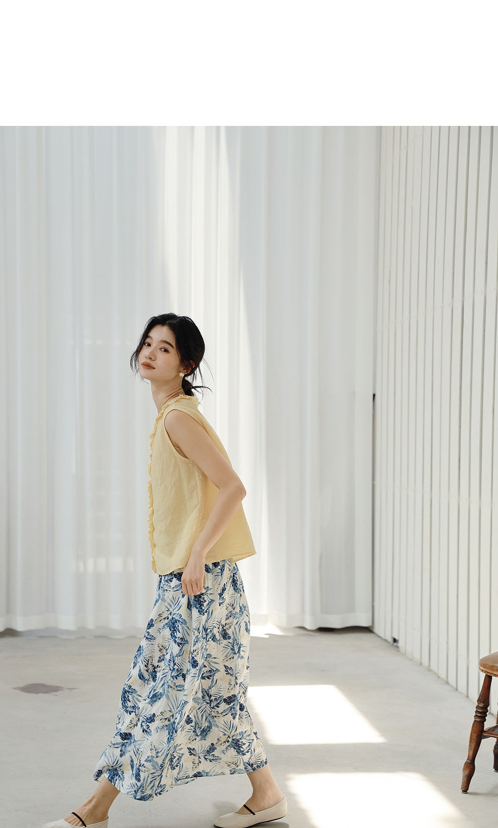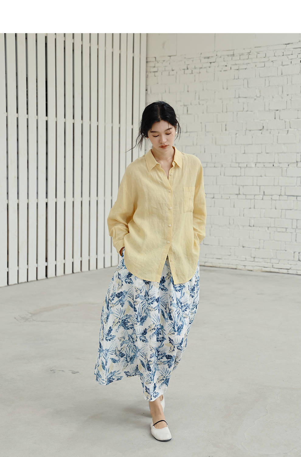 绽放女装411朵/【莫兰迪系列】双支数亚麻底布印花松紧腰半身裙女