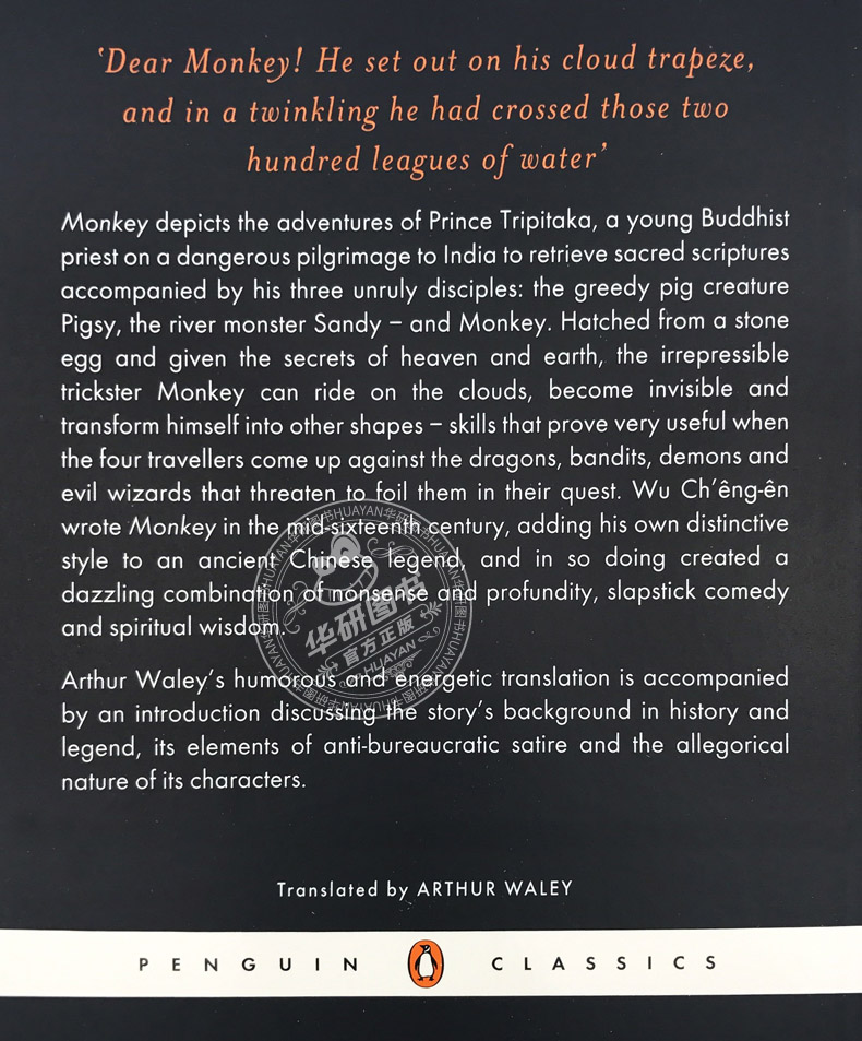 Also known as Journey to the West, Wu Ch'êng-ên's Monkey is one of the Four Great Classical Novels in Chinese literature, translated by Arthur Waley in Penguin Classics.