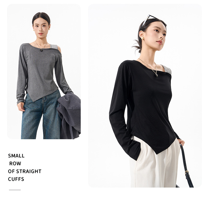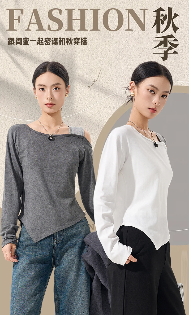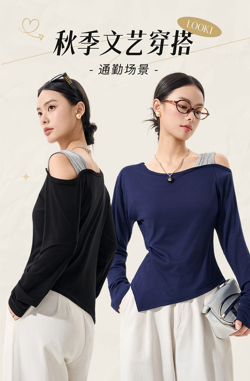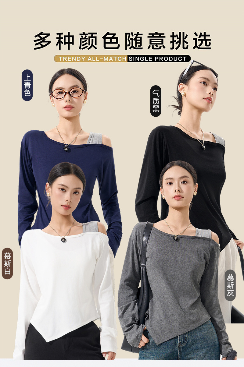 【79/任选2件 斜肩软软打底衫】早秋韩系设计感挂脖斜肩打底衫上衣时尚气质长袖宽松显瘦露肩打底