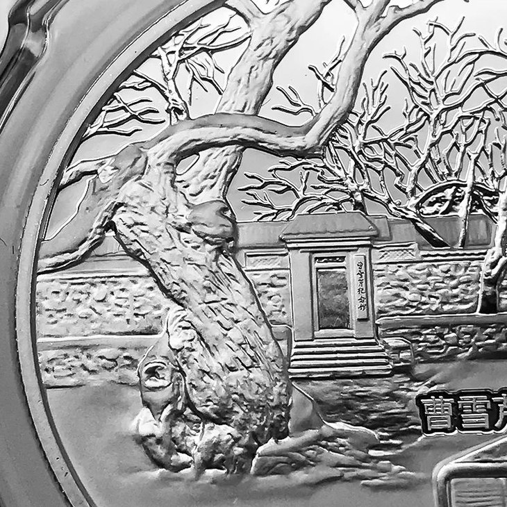银币背面主图是曹雪芹纪念馆前古槐树以及《红楼梦》线装书籍造型,画面古韵十足,简练而质朴。