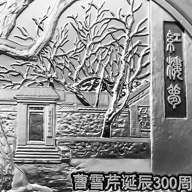 币面右侧篆印的《红楼梦》留白,则点明这是其创作之地。这枚银币内容丰富,布局紧密有序,线条错落有致,极具层次感。