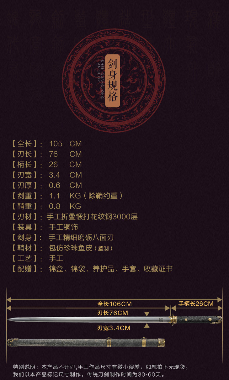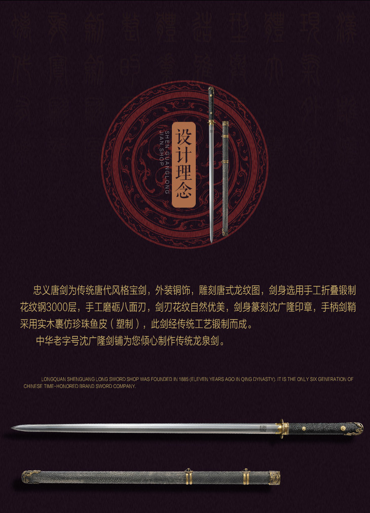 龙吟剑 花纹钢汉剑 龙泉沈广隆宝剑 礼品剑手工传统剑 工艺品 未开刃