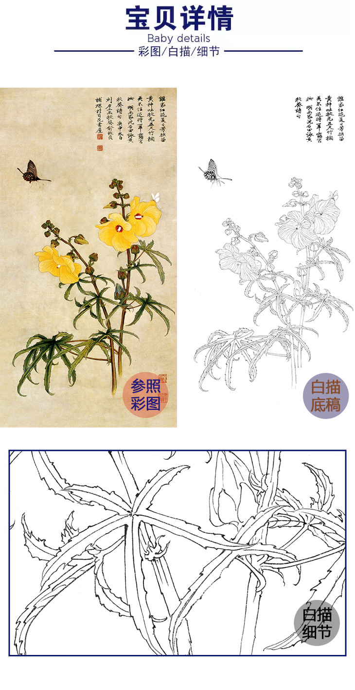 俞致贞竖幅工笔花鸟白描底稿-黄葵花蝴蝶-JV35