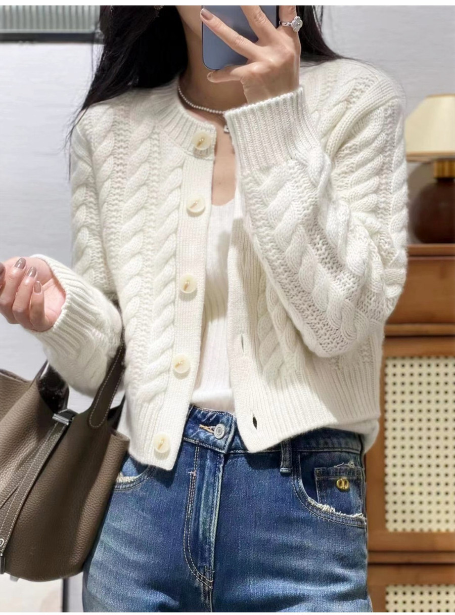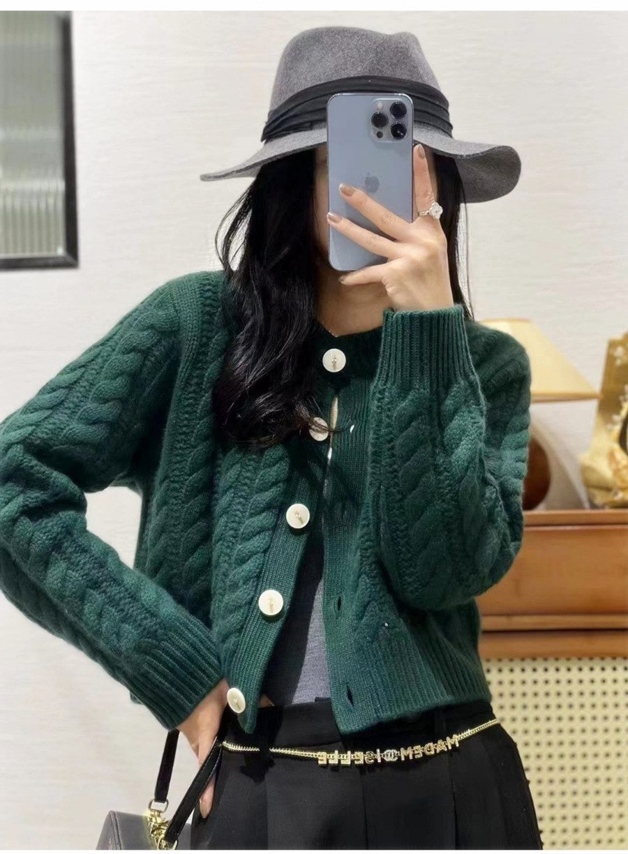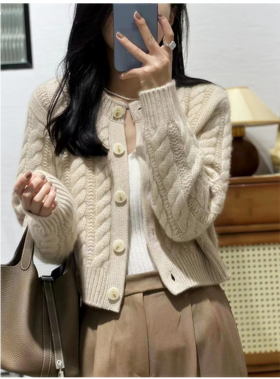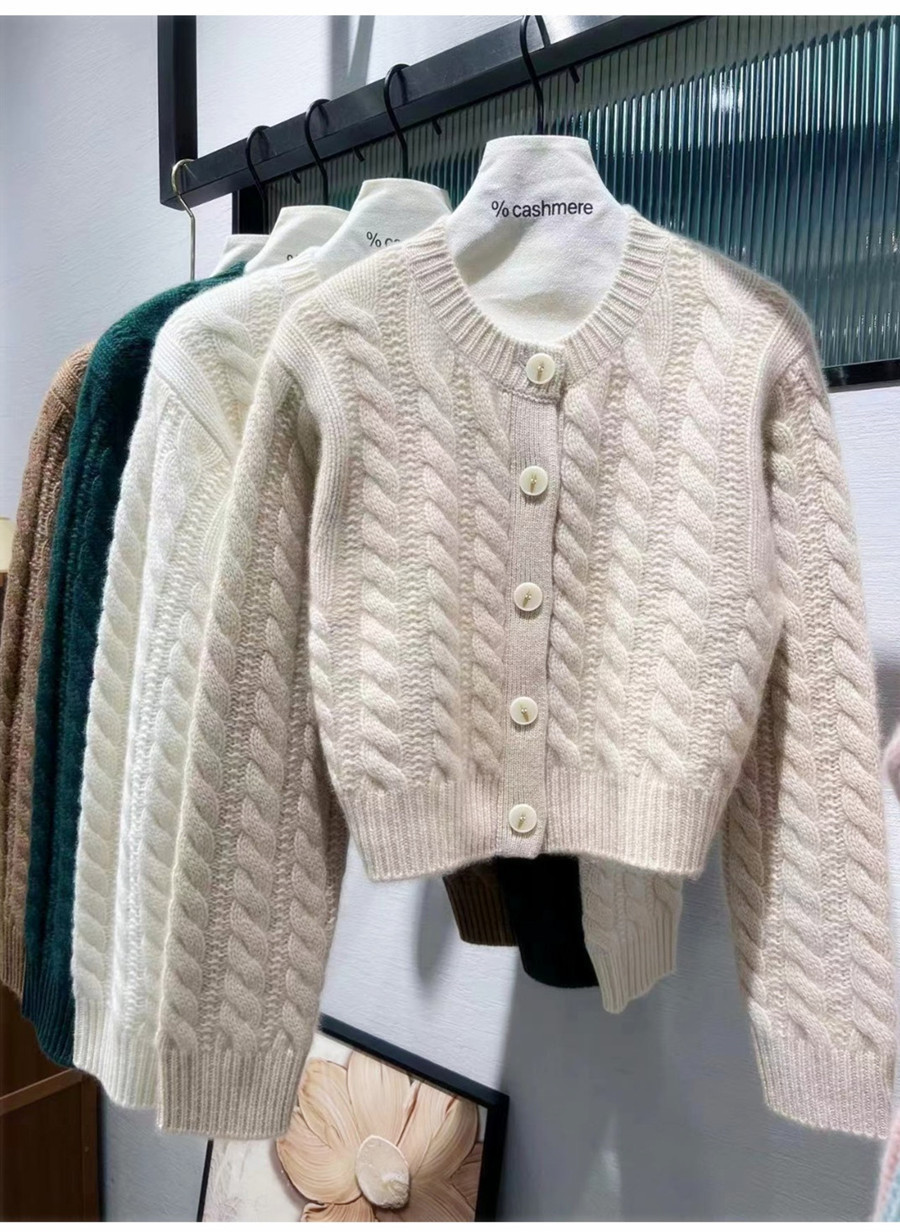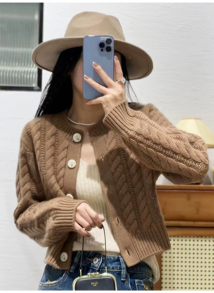 重磅加厚羊绒衫女圆领毛衣开衫麻花宽松慵懒短款羊毛针织上衣外套