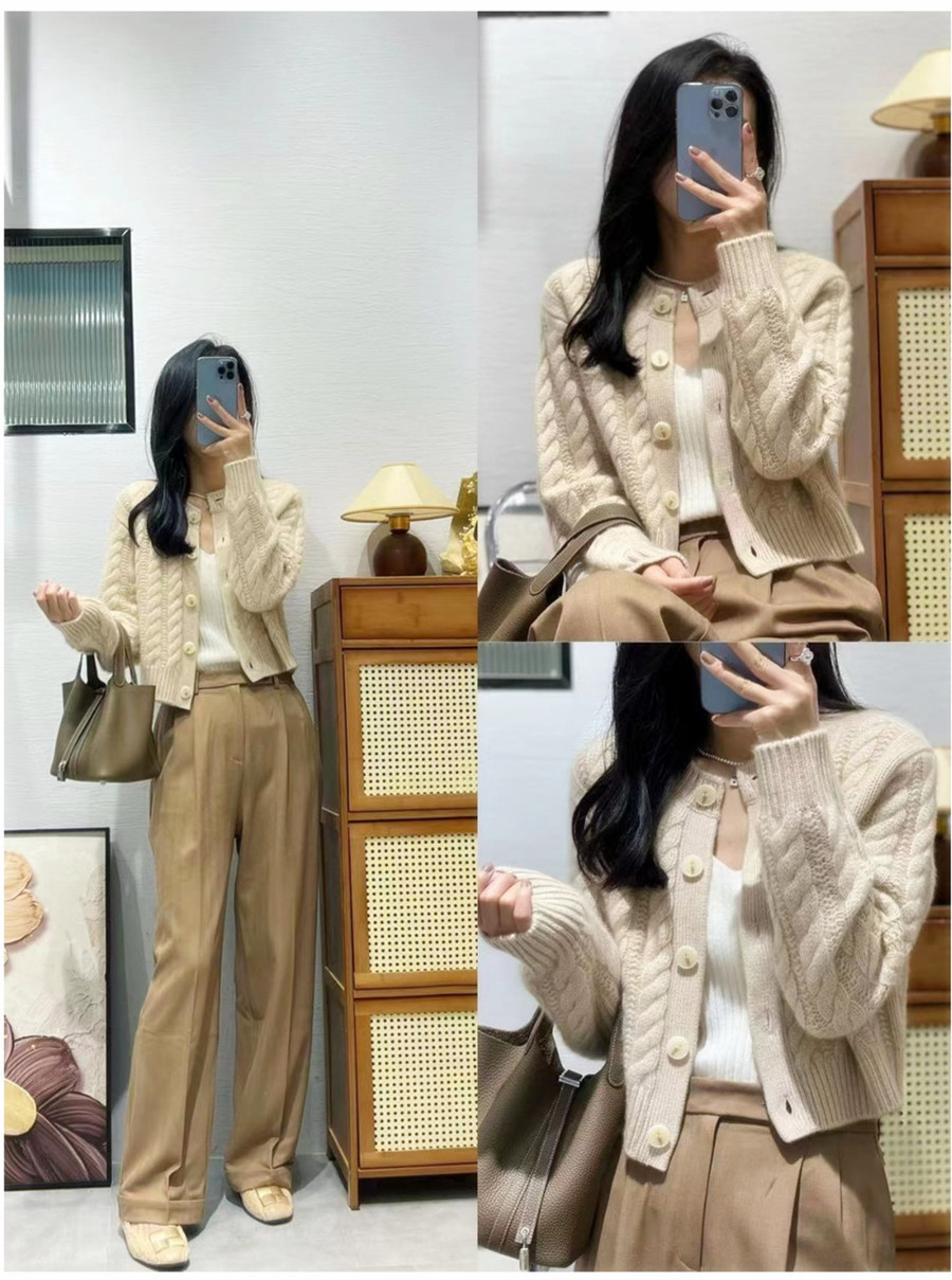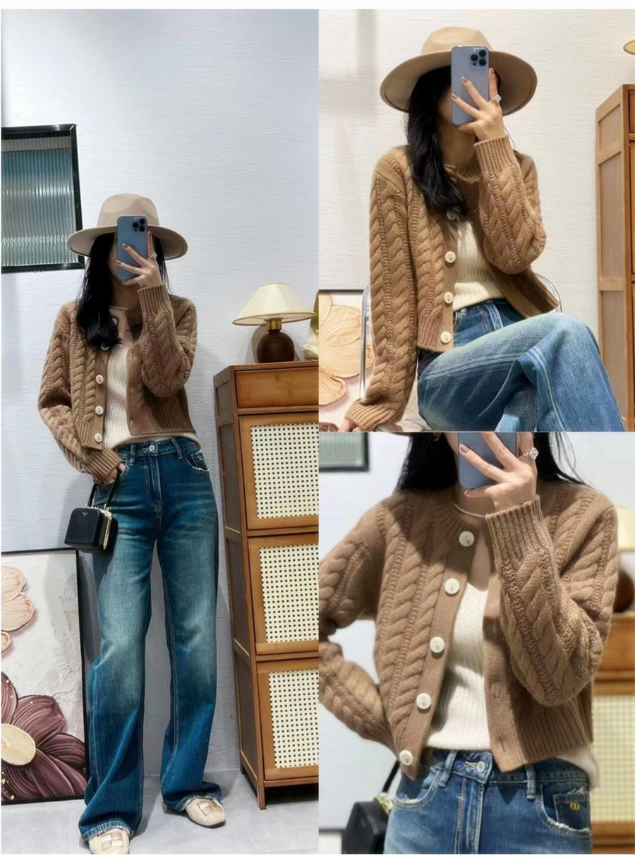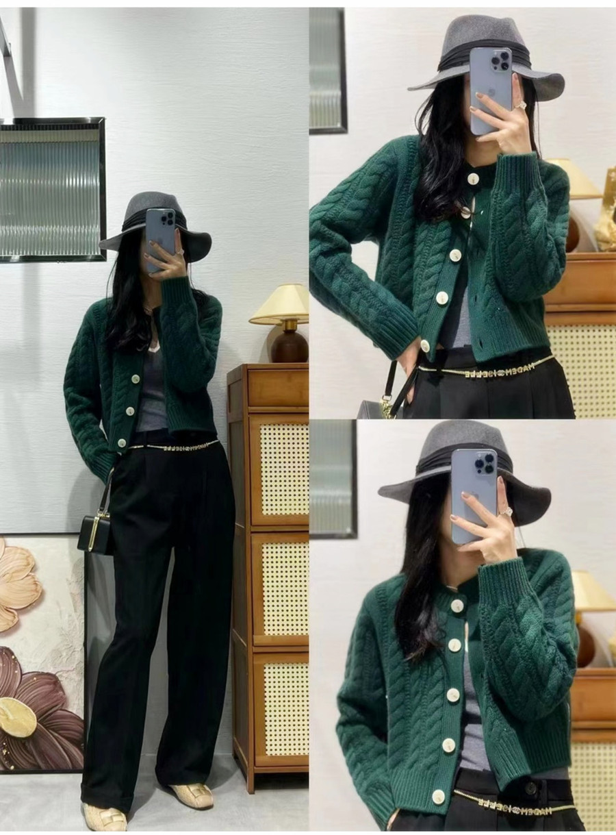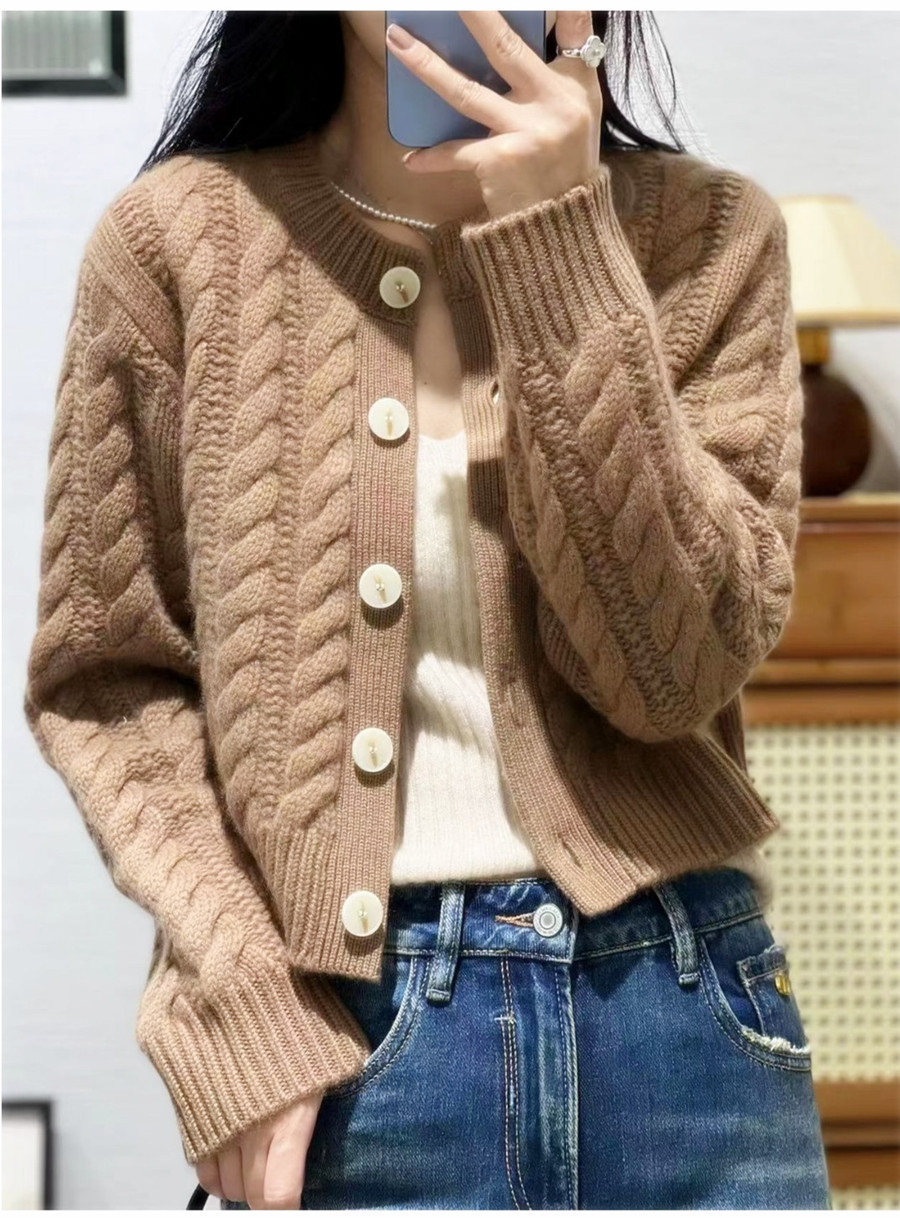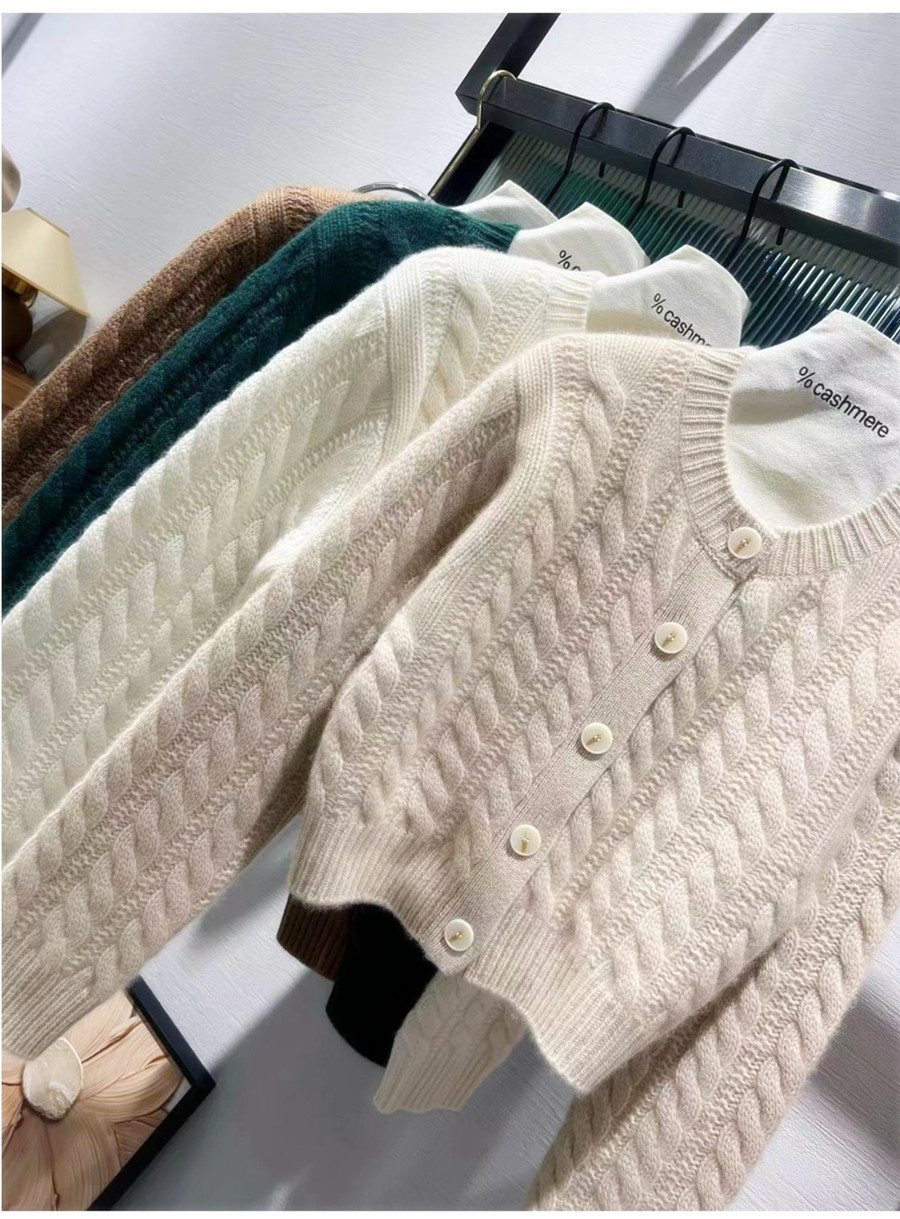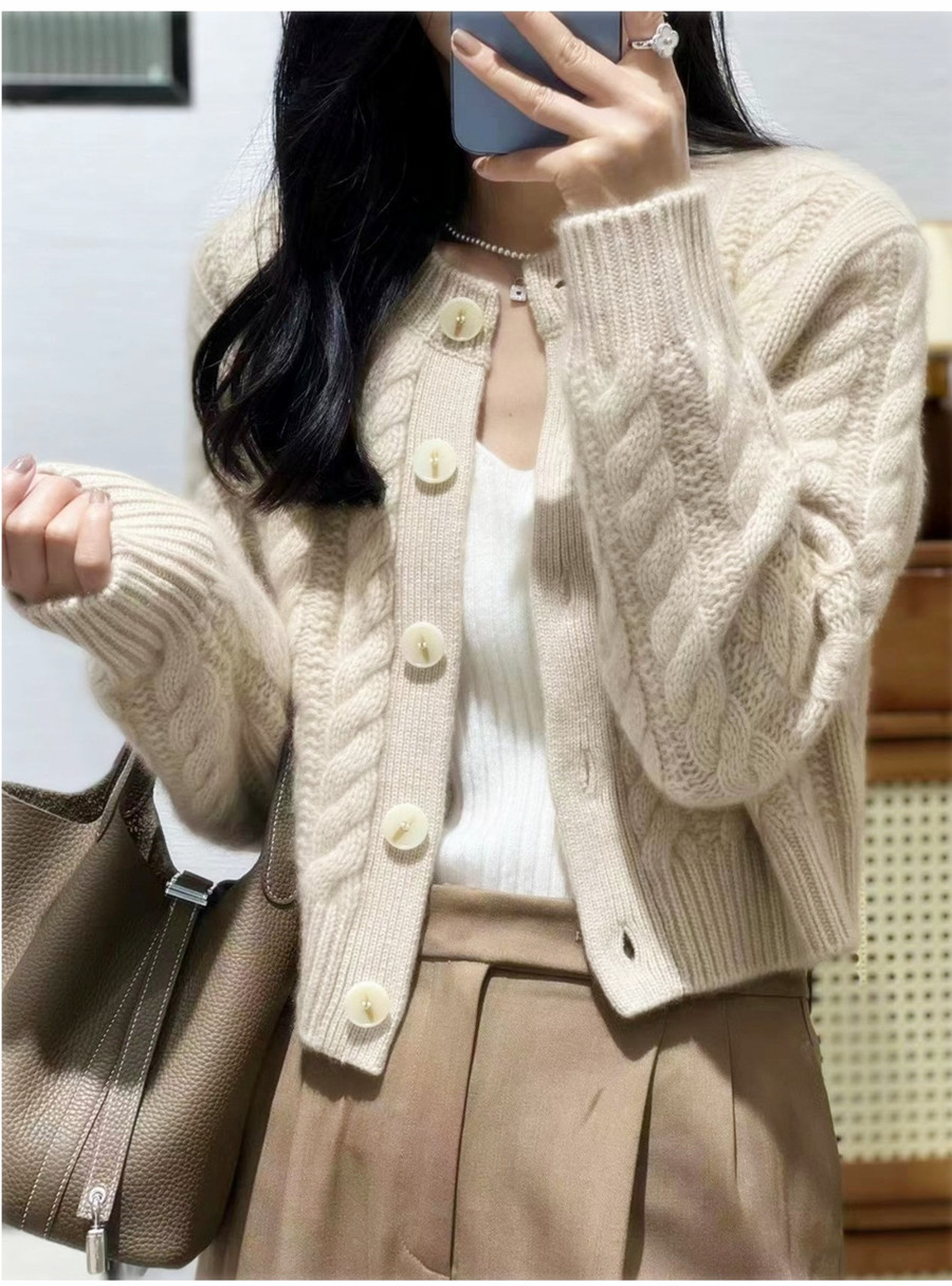 重磅加厚羊绒衫女圆领毛衣开衫麻花宽松慵懒短款羊毛针织上衣外套