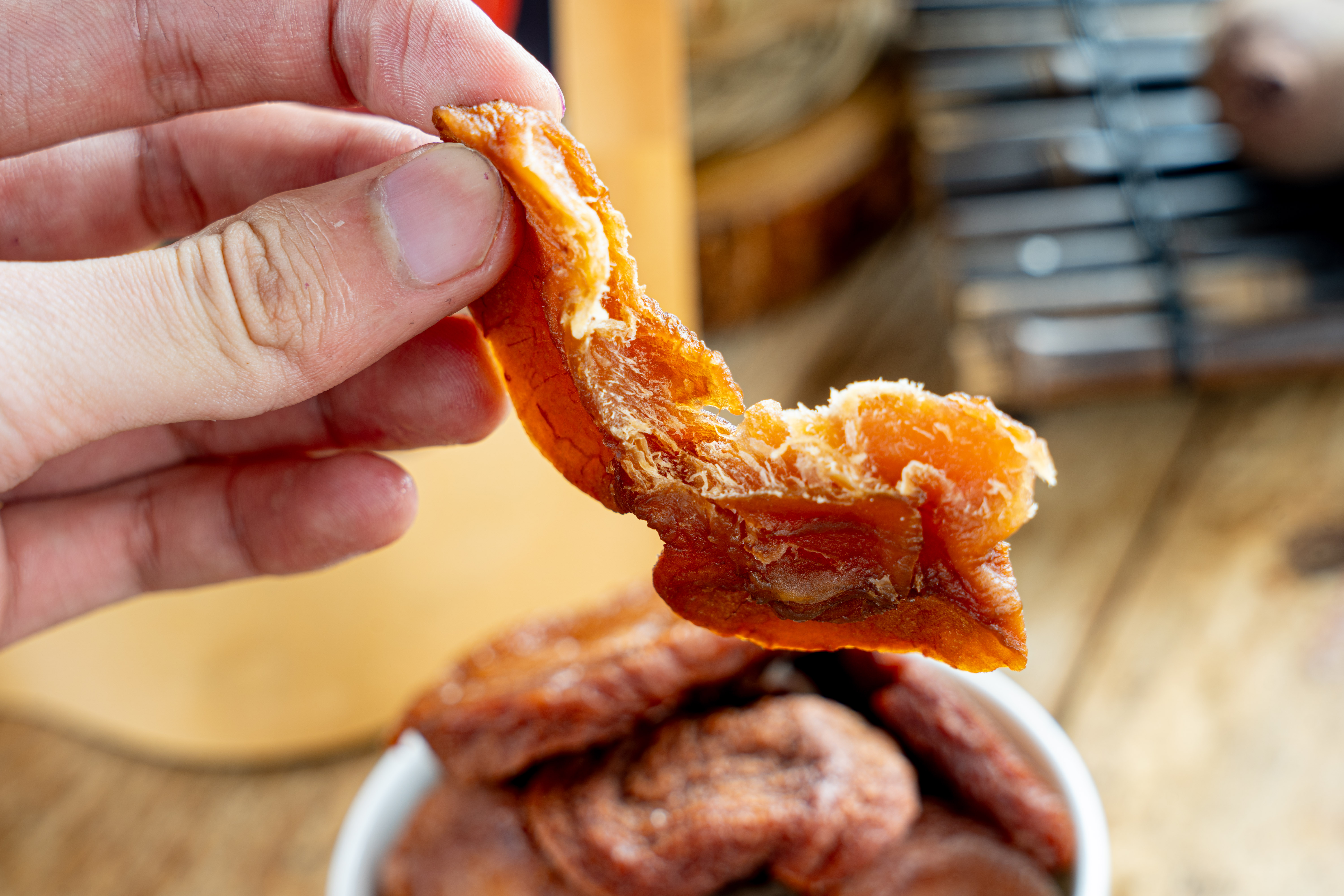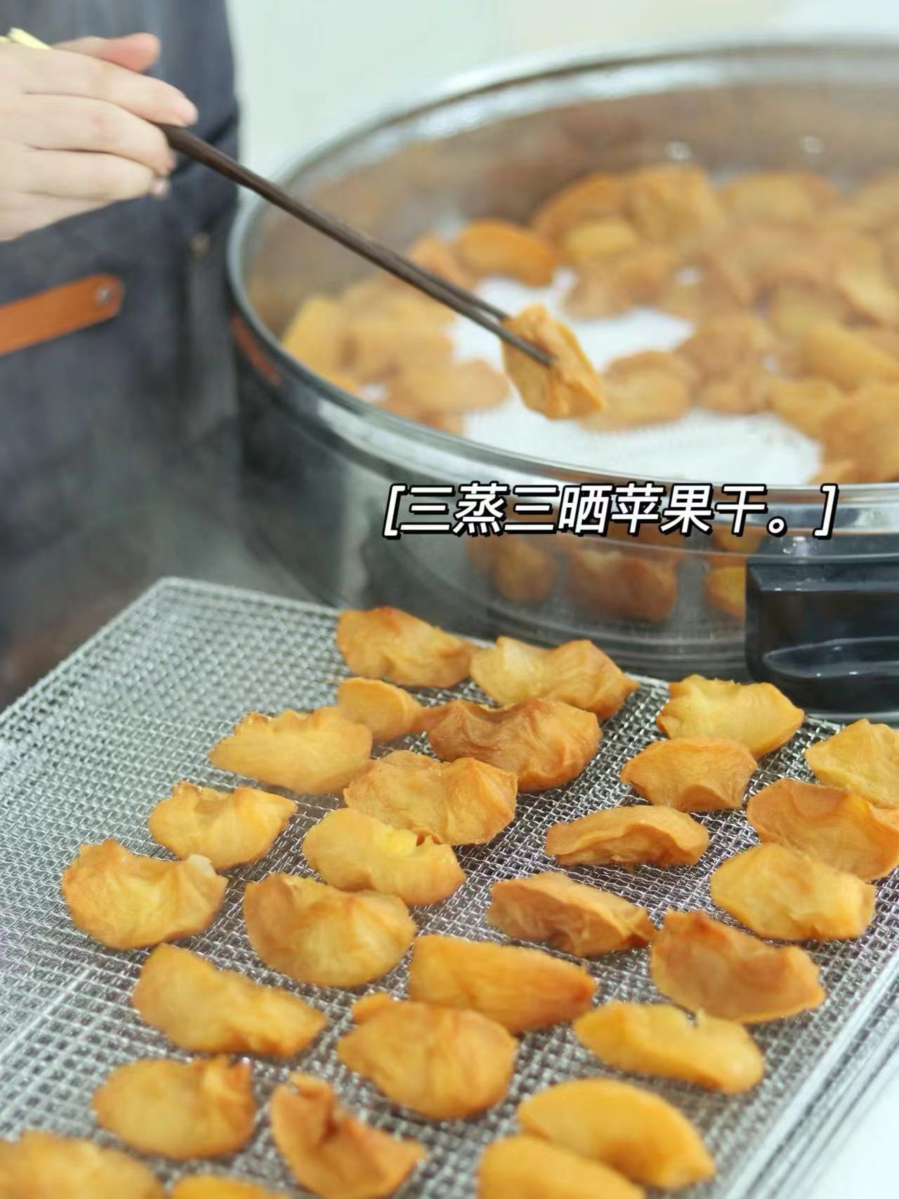 三蒸三晒是一种古法的食品加工方法,老祖宗传下来的方法总是那么有道理,只蒸一次晒干的苹果干,口感会偏硬,色泽也会偏淡。经历三次反复蒸晒后的果干,味道更香甜,口感软糯,颜色褐黄明亮。