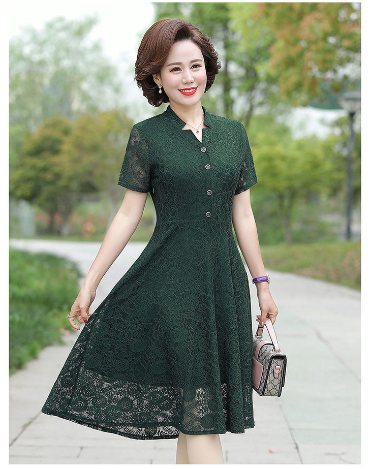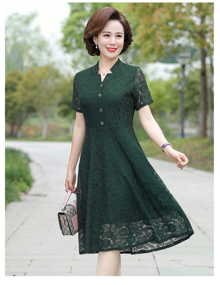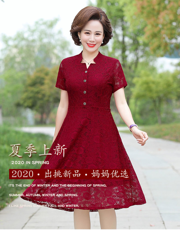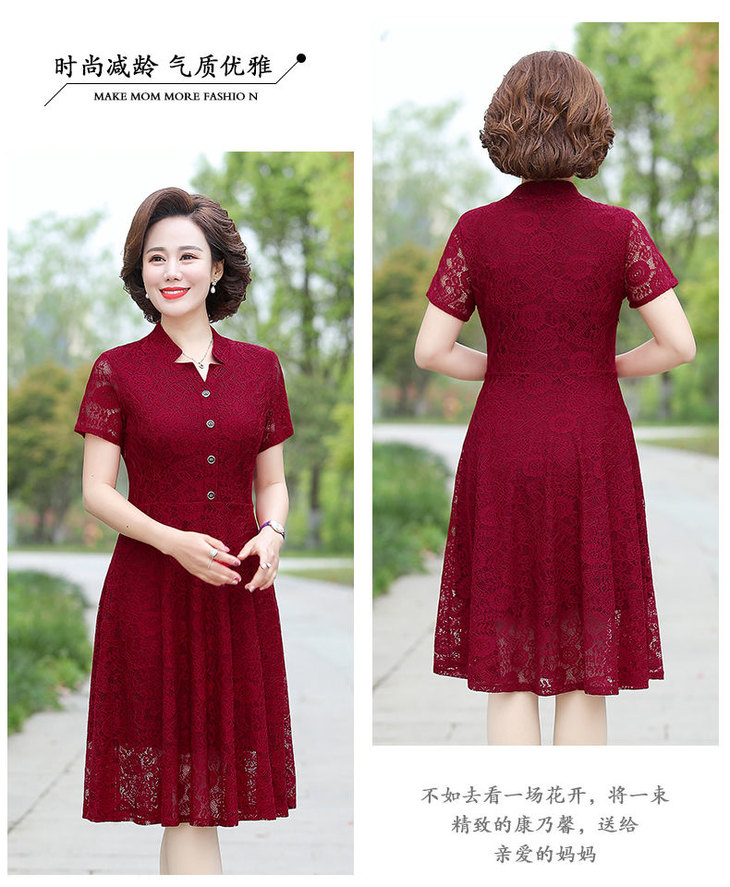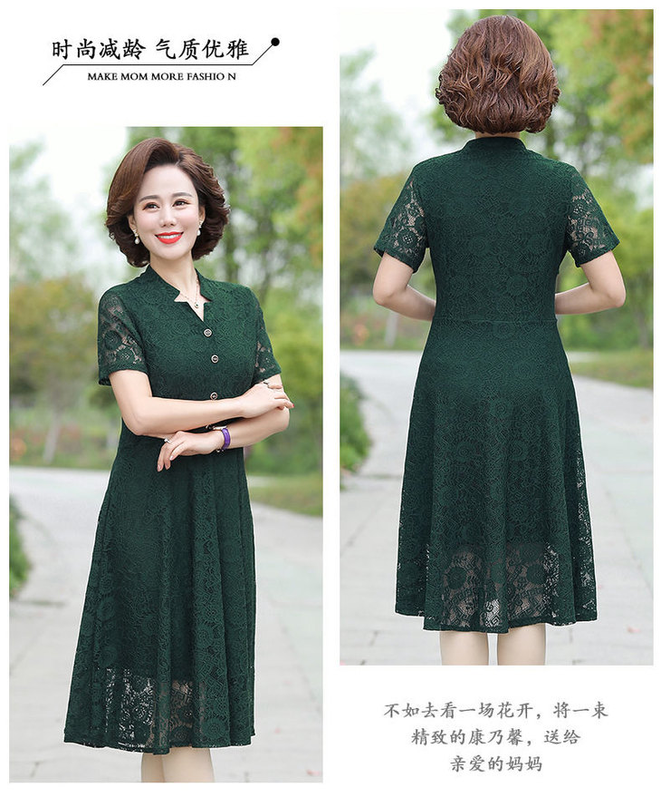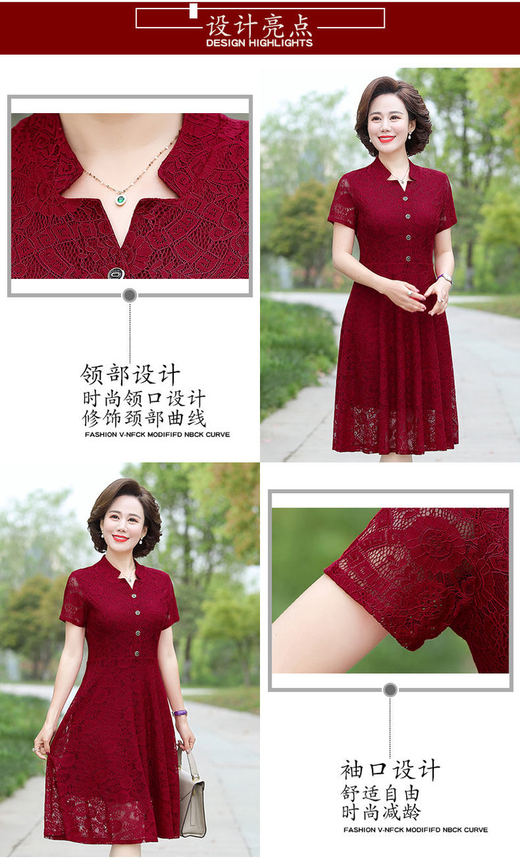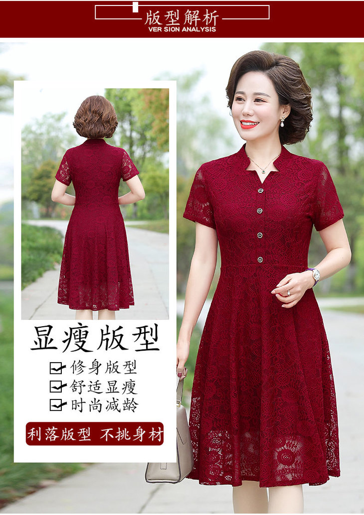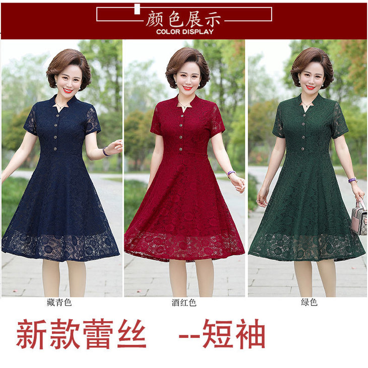 JXG-中年妈妈夏装短袖中长款网纱蕾丝纯色弹力修身裙
