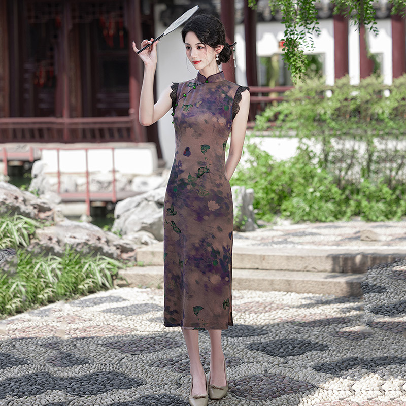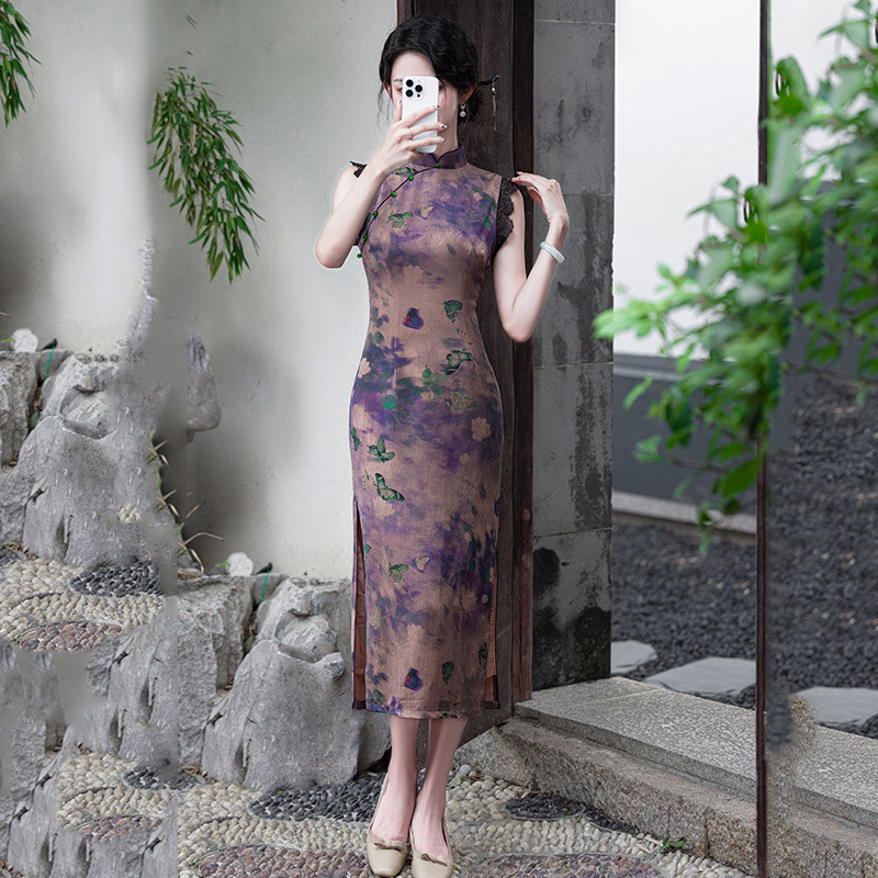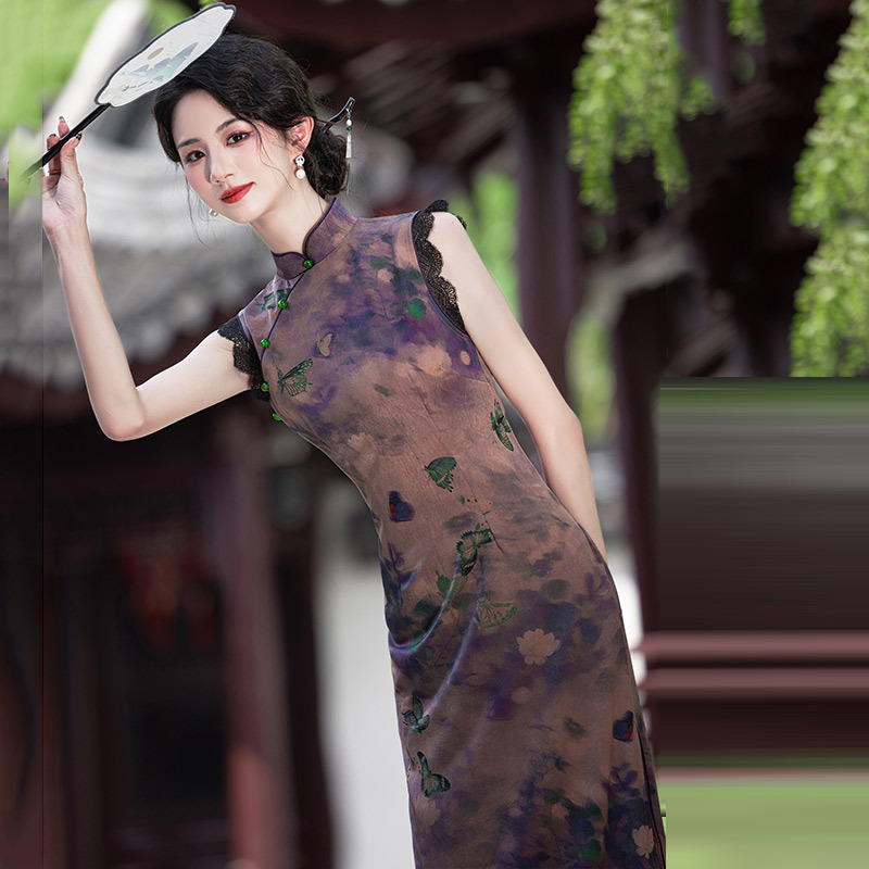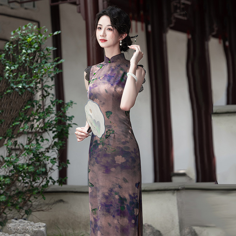 SC21780紫色显瘦国风新中式长款改良旗袍2025新款少女老上海复古修身夏季