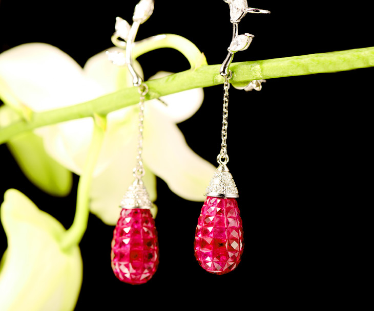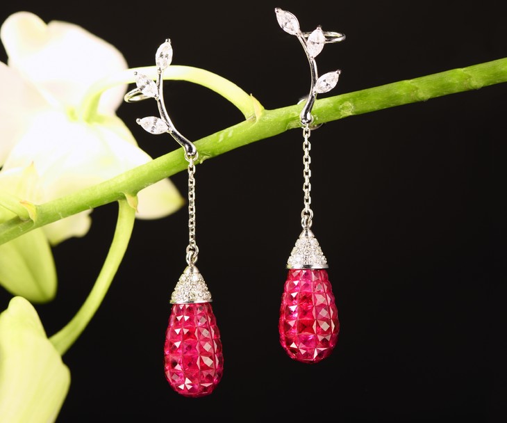 六粒马眼切割钻石0.75克拉,可作为耳钉单独配戴,沿耳廓攀升, 采用VS,F色钻石,亮白而闪烁,特立独行;下坠水滴形隐形镶嵌天然紅寶石共19克拉,隐形镶嵌,是宝石镶嵌技术的最高级别,每一粒天然宝石都要经过特别的切割,得以一粒粒推入贵重金属排成的凹槽,目前世界上仅有不超过20人掌握这项工艺。