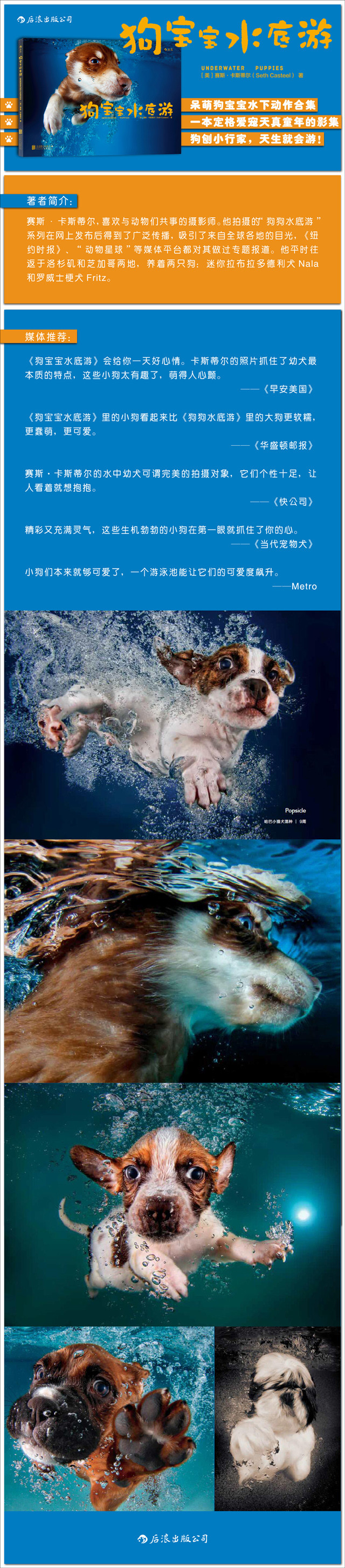 这是一本定格爱宠天真童年的影集。《狗宝宝水底游》是赛斯·卡斯蒂尔拍摄的水下幼犬照片的合辑,他以新颖的水下活动与互动形式捕捉到幼犬活泼、天真的一面,照片生动逗趣,会让读者发自内心地微笑。