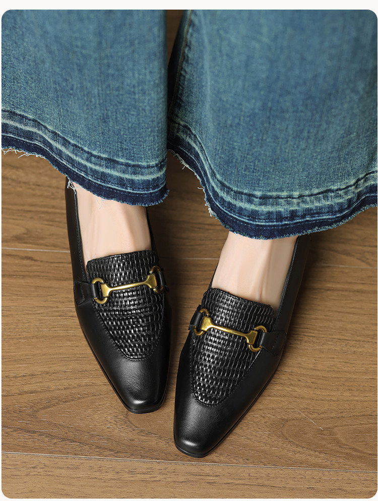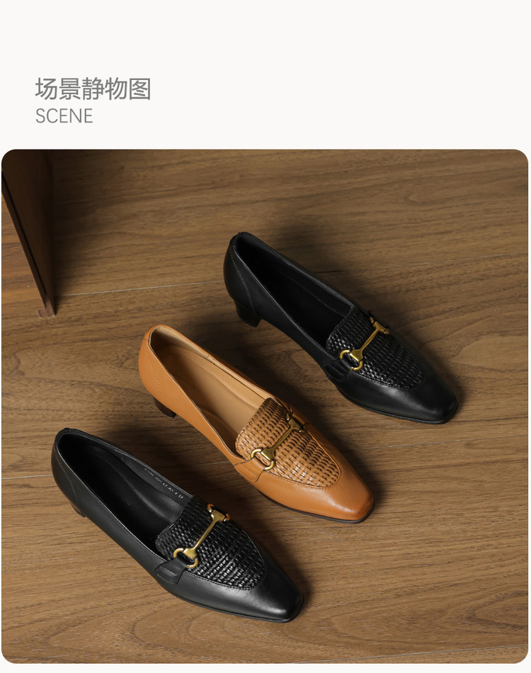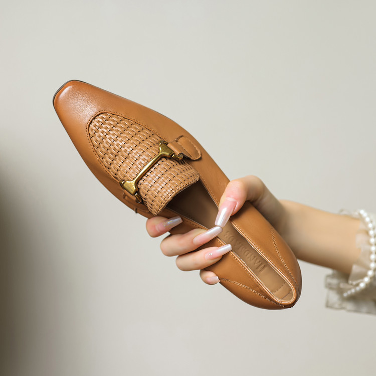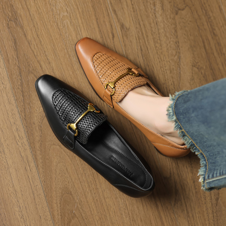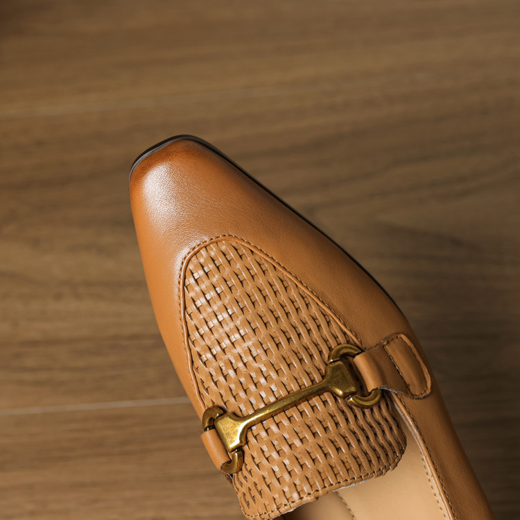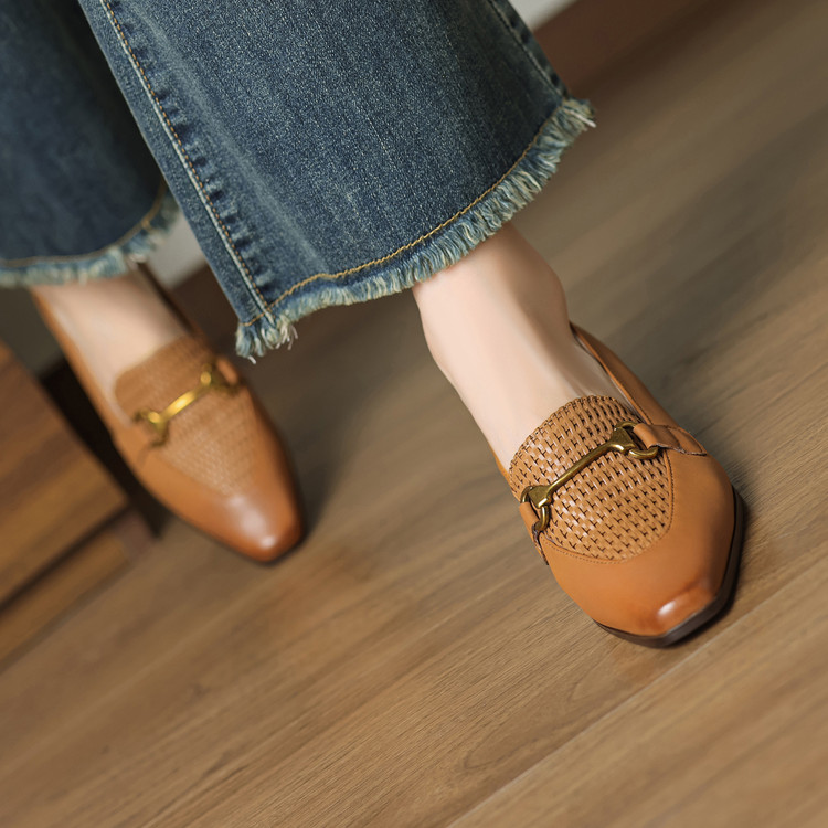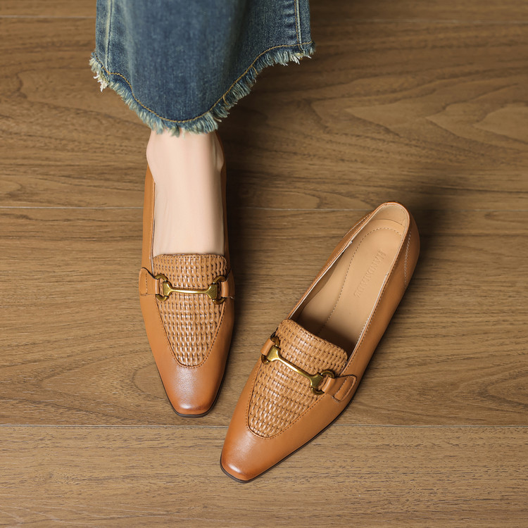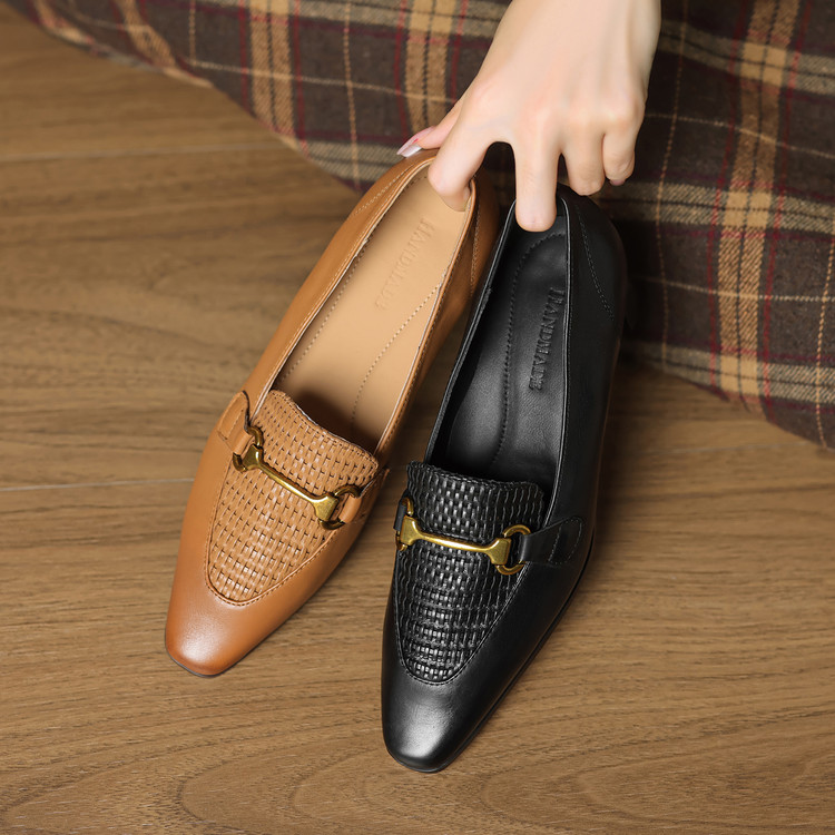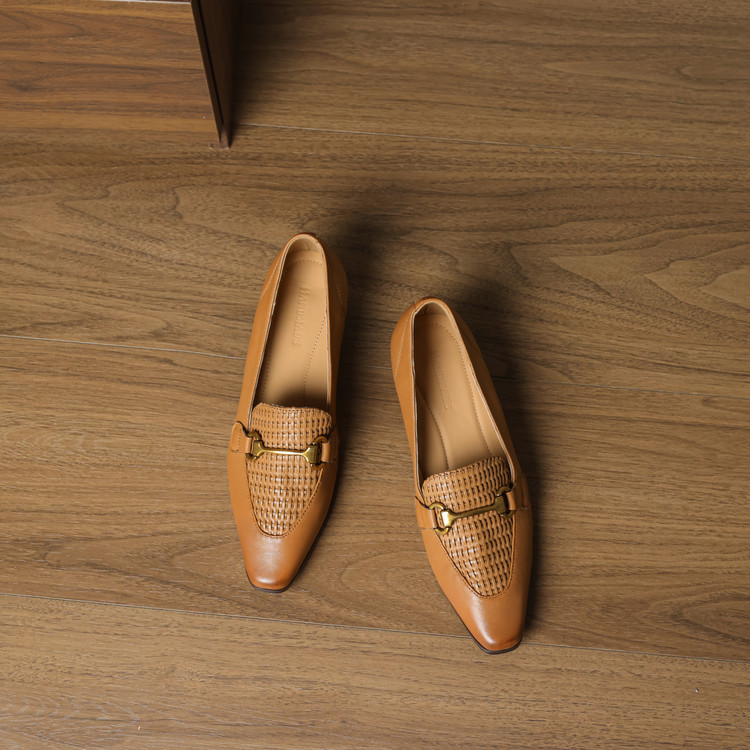 【预售5天】英伦风复古小方头编织单鞋女新款真皮软底金属链浅口小皮鞋NX&S9625
