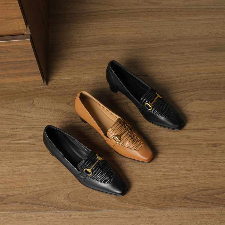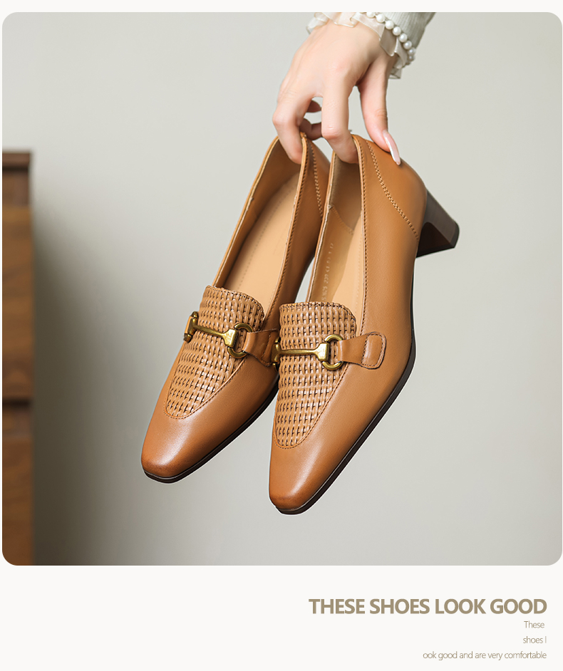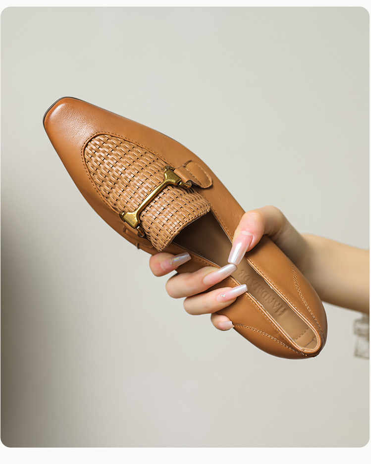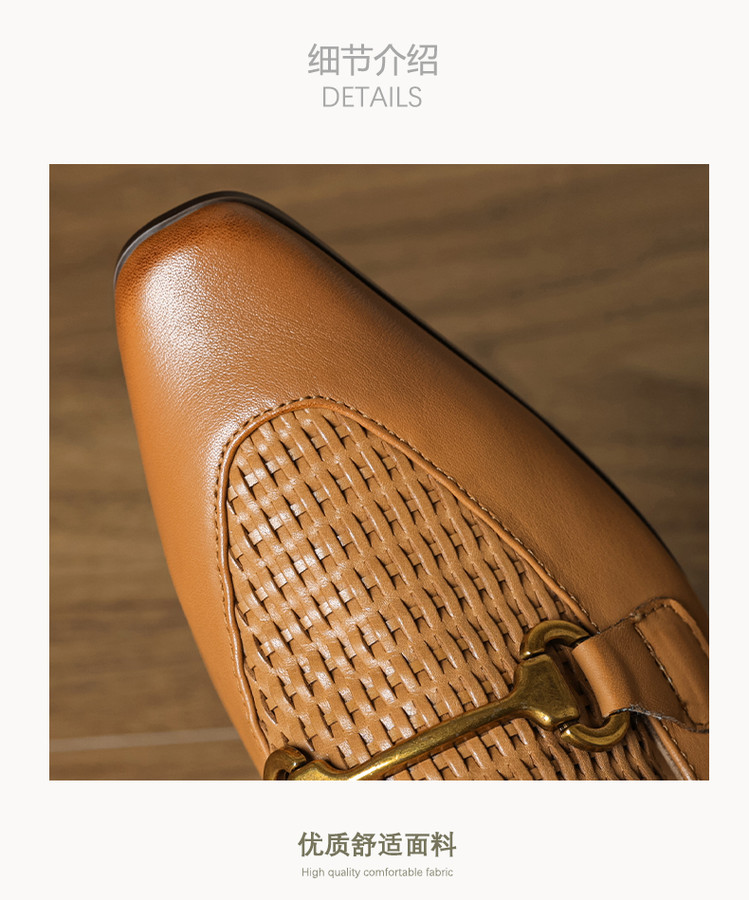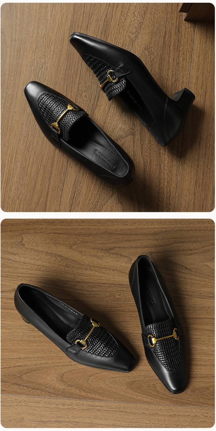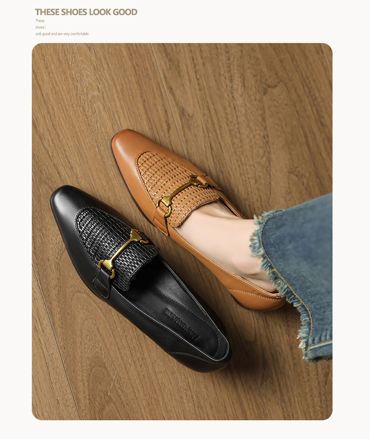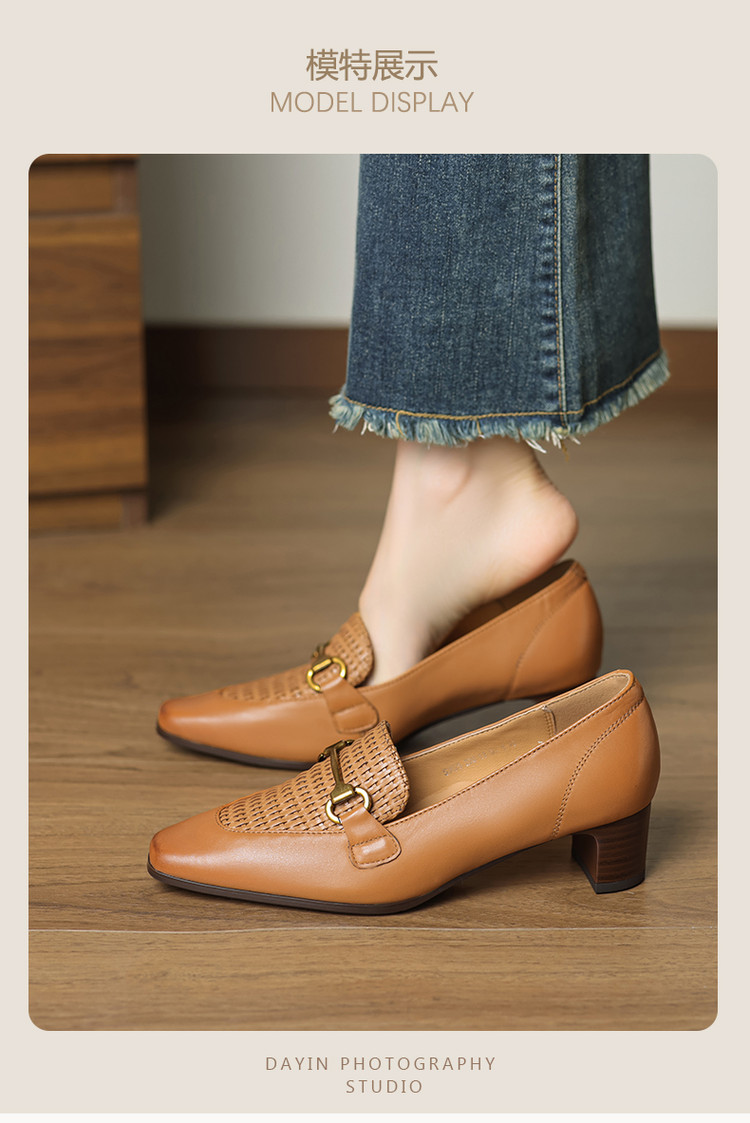 【预售5天】英伦风复古小方头编织单鞋女新款真皮软底金属链浅口小皮鞋NX&S9625
