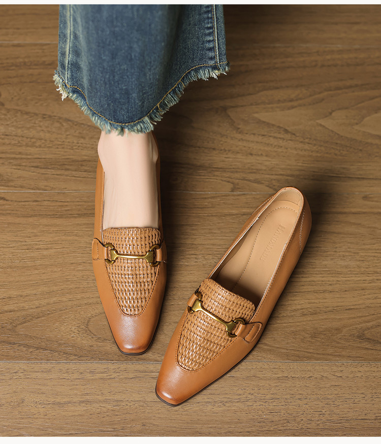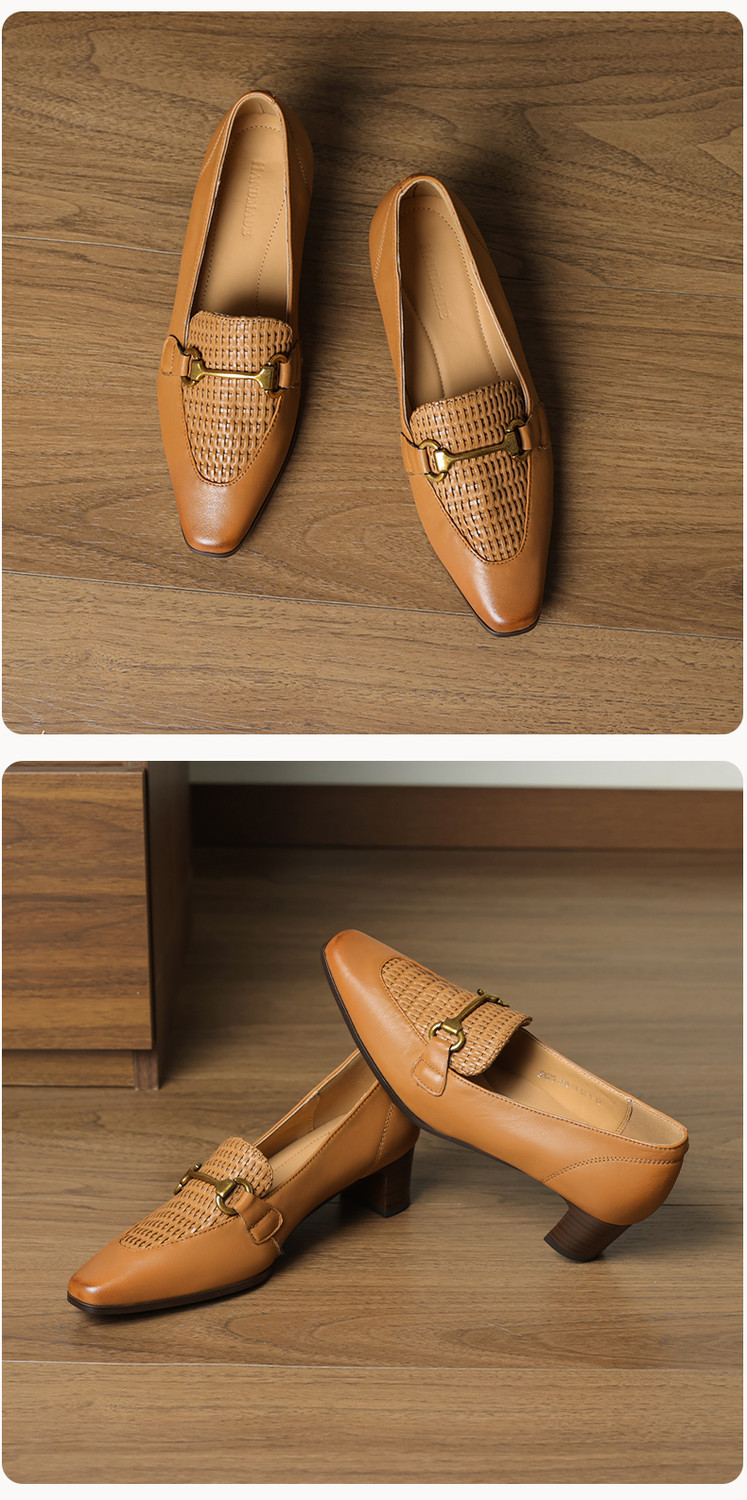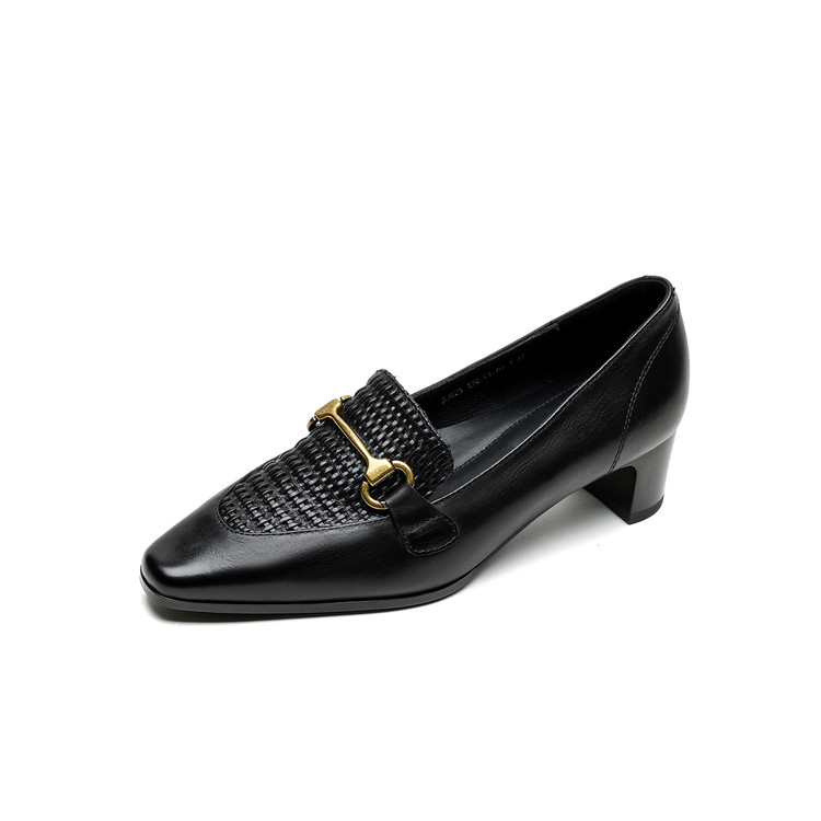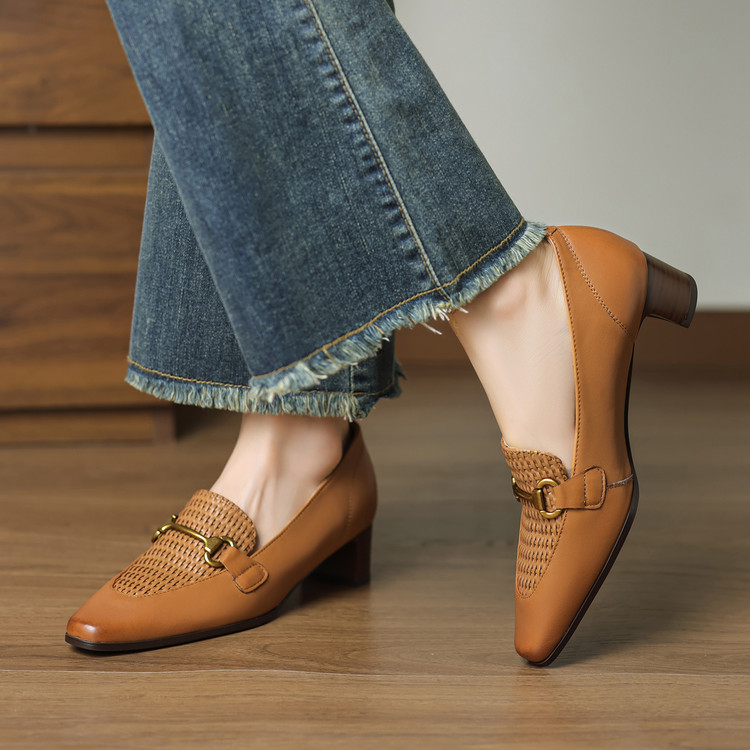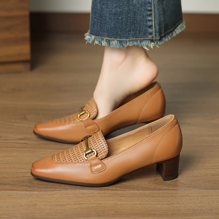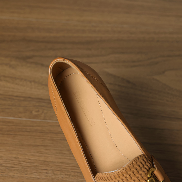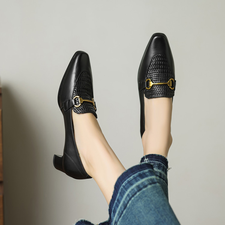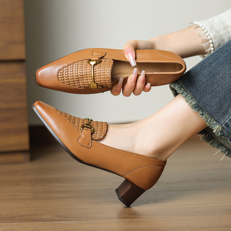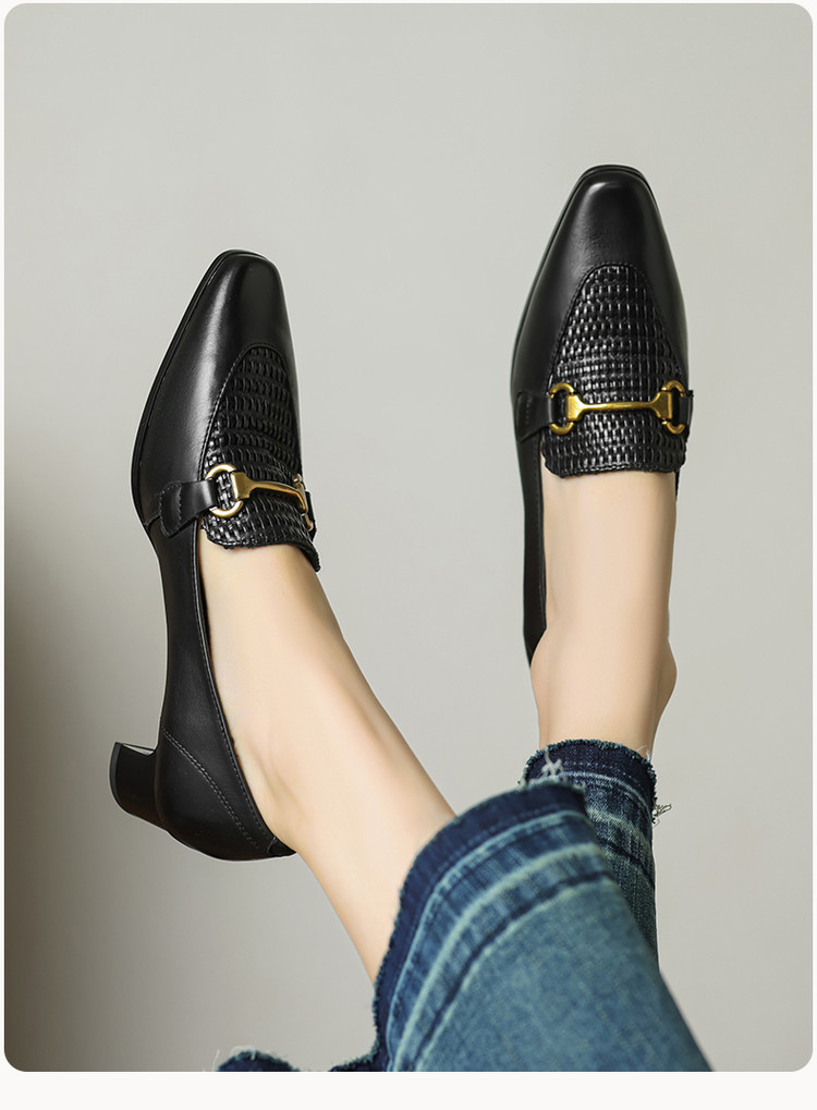 【预售5天】英伦风复古小方头编织单鞋女新款真皮软底金属链浅口小皮鞋NX&S9625