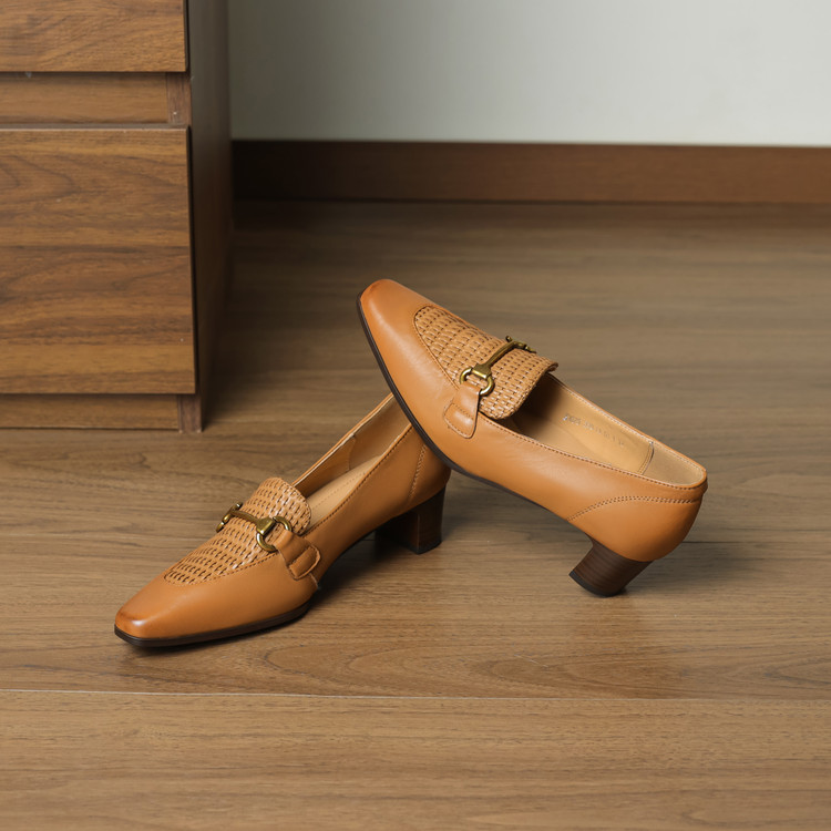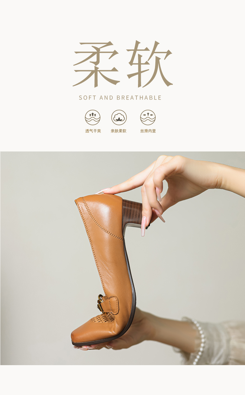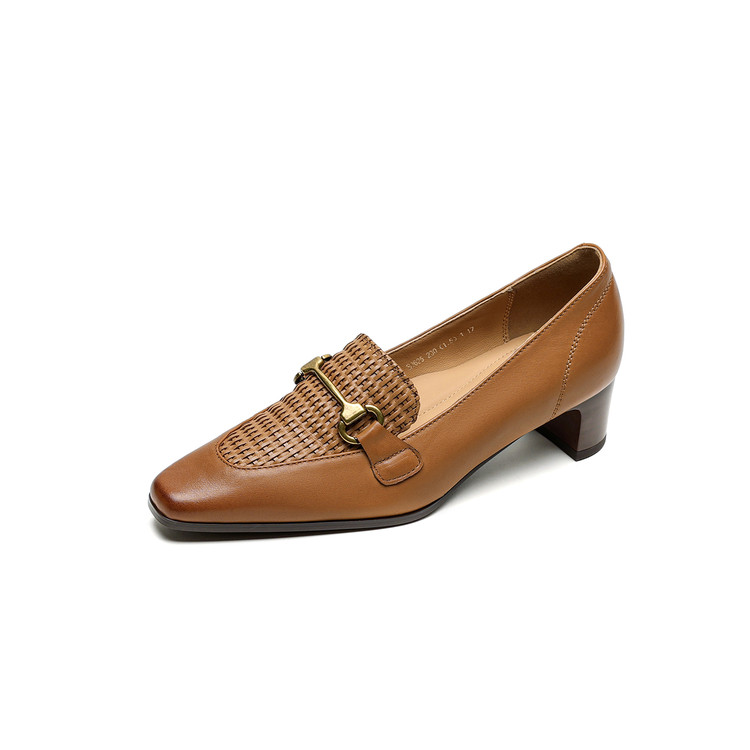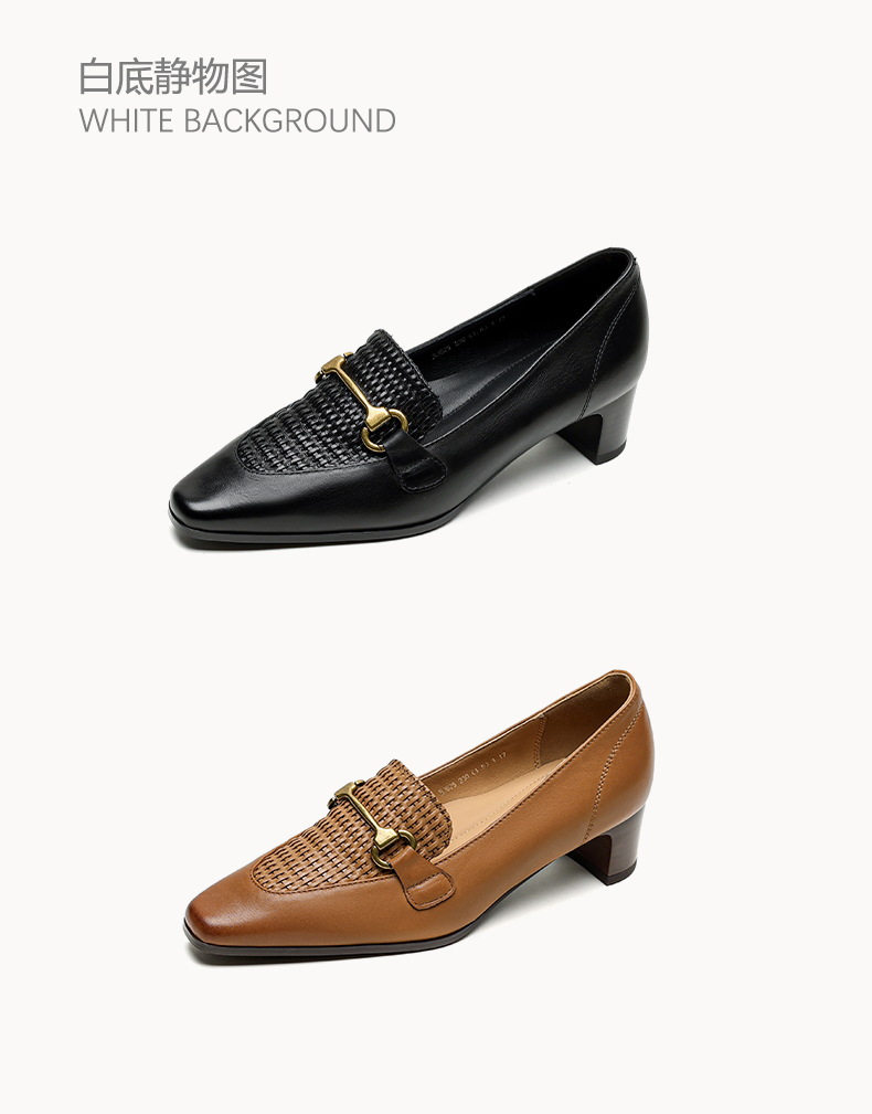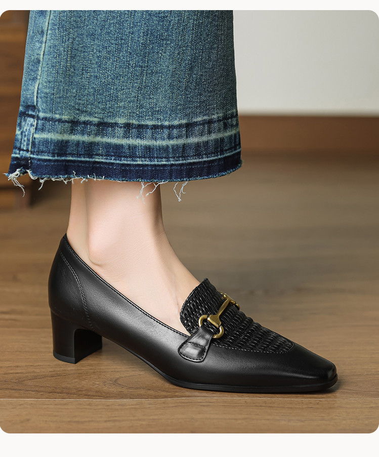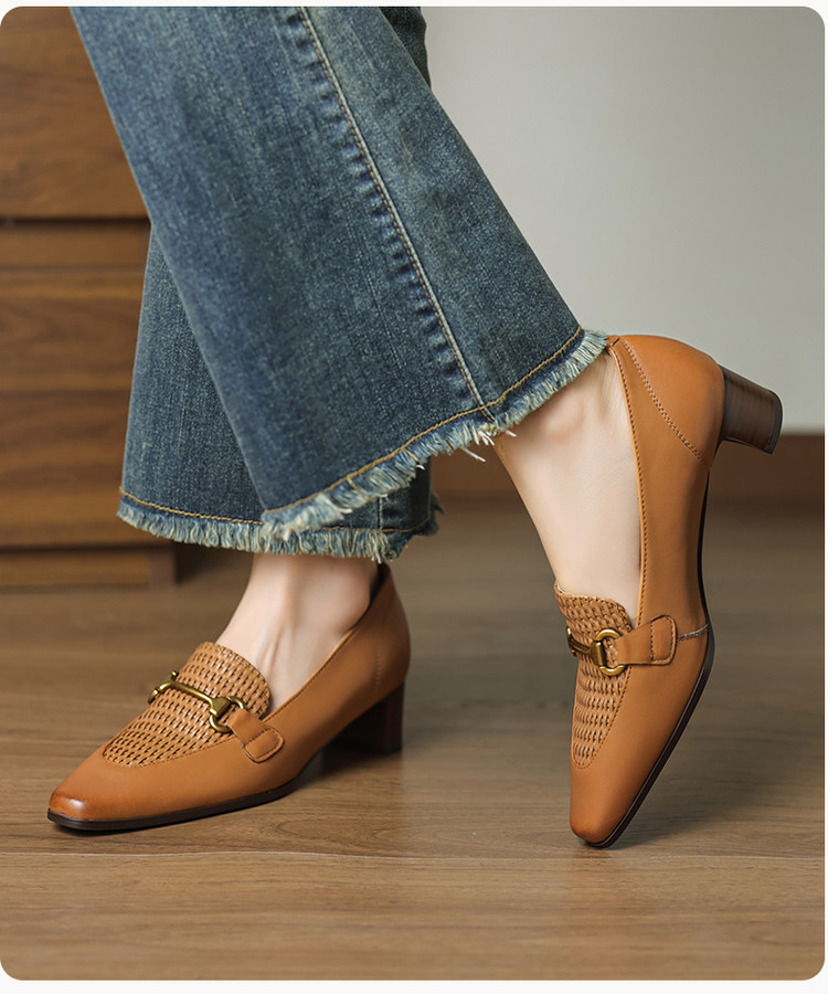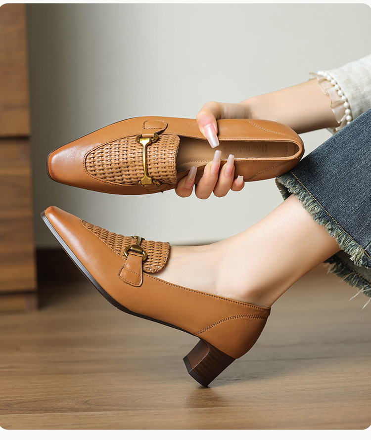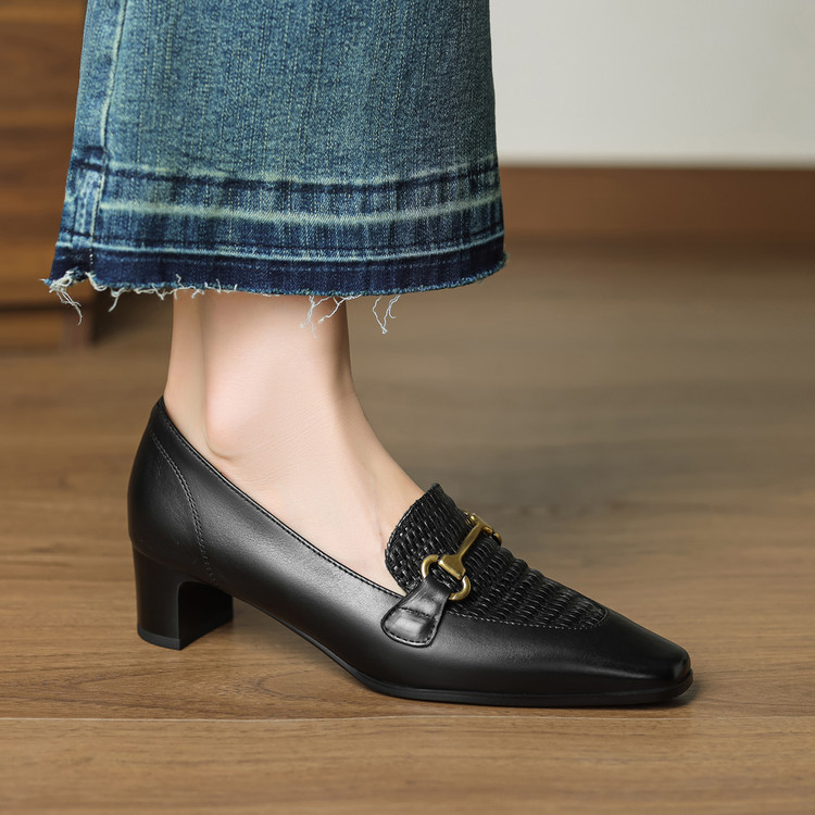 【预售5天】英伦风复古小方头编织单鞋女新款真皮软底金属链浅口小皮鞋NX&S9625
