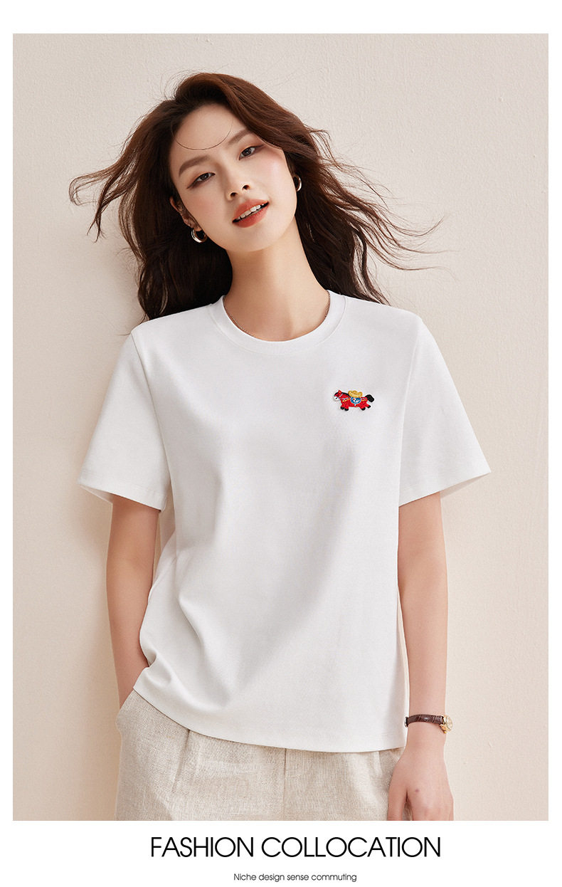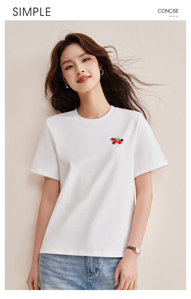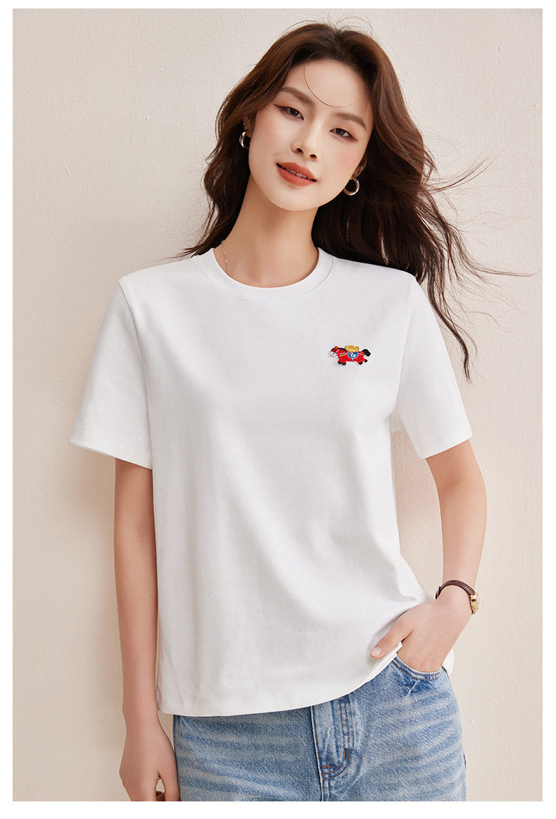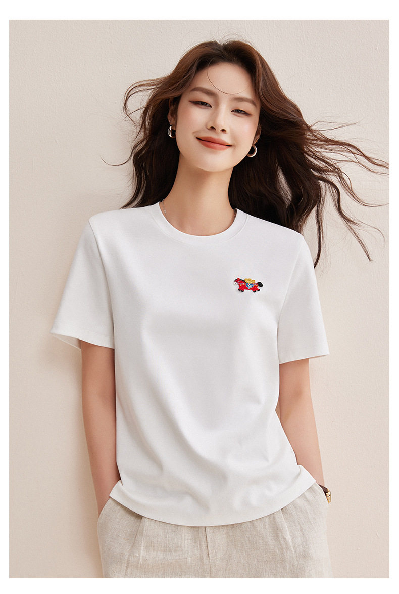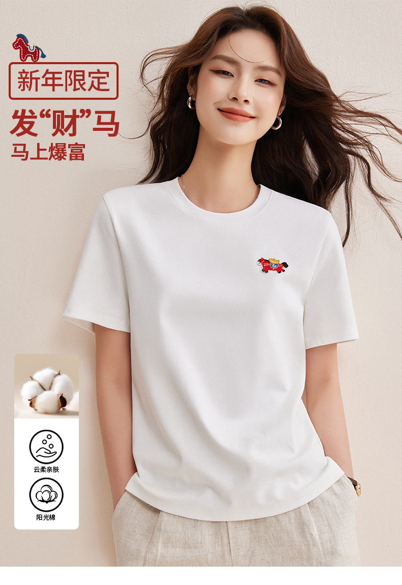 「自j」全新升级【铂金会员109/天猫149/差价40】(03955)洛诗琳小马刺绣纯棉短袖2026春季新款百搭正肩通勤T恤女