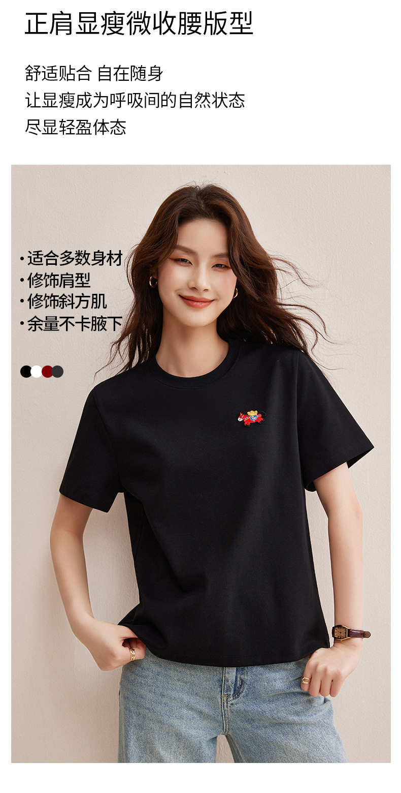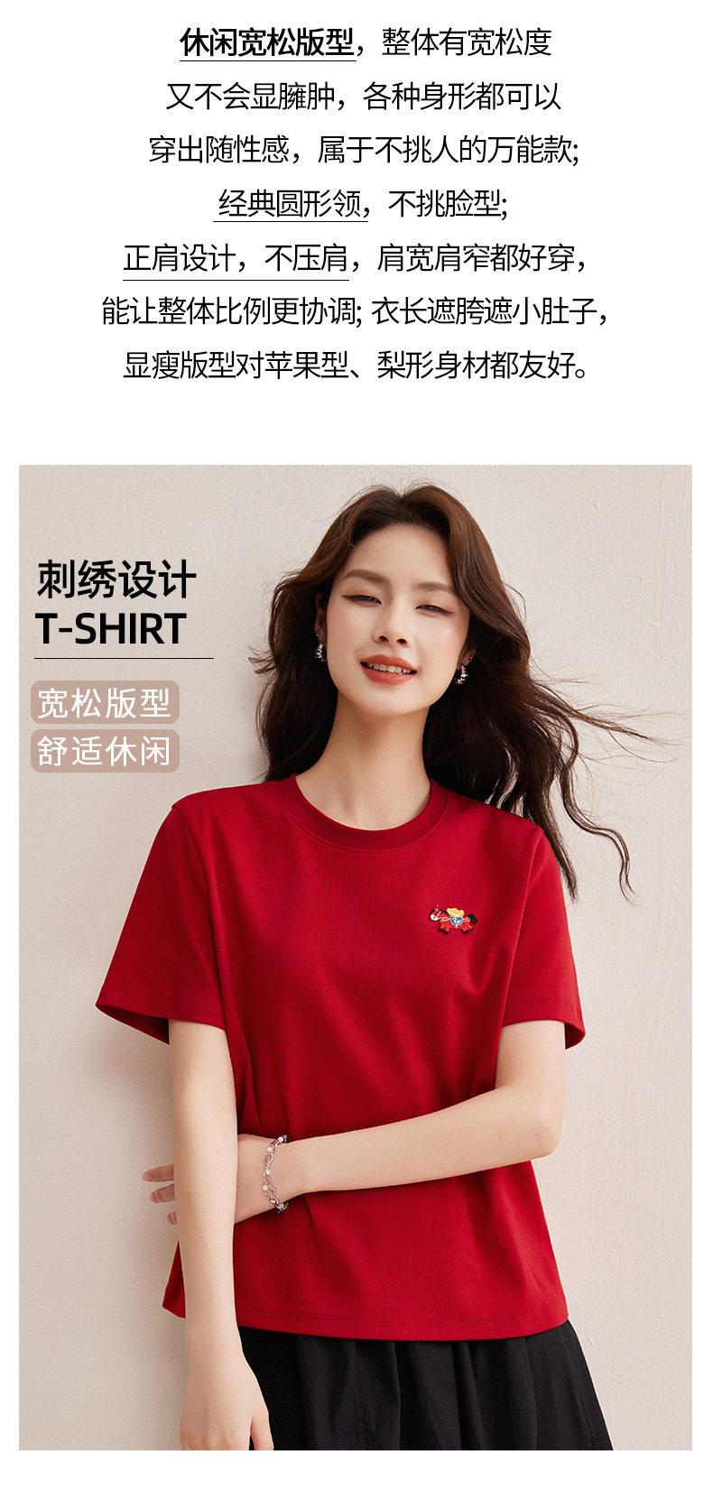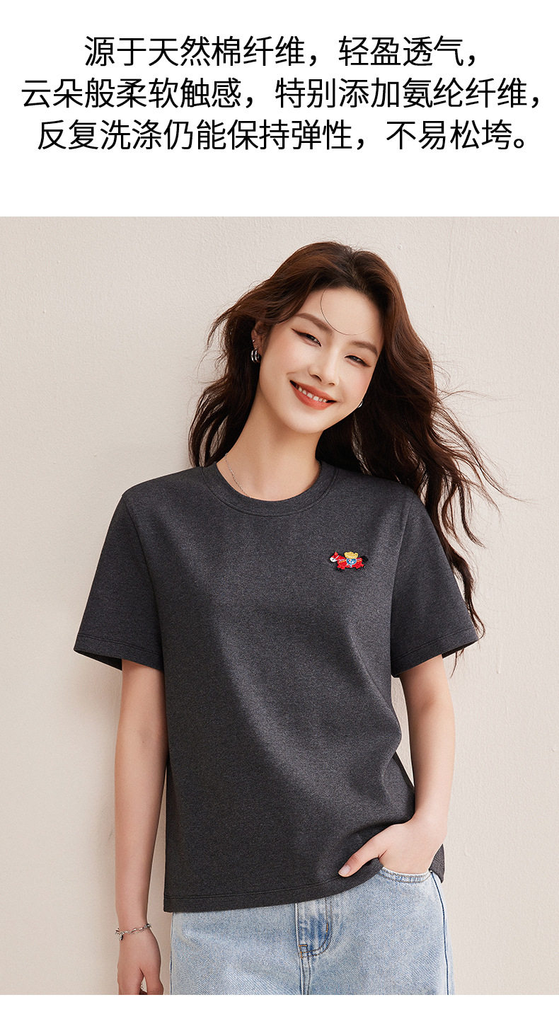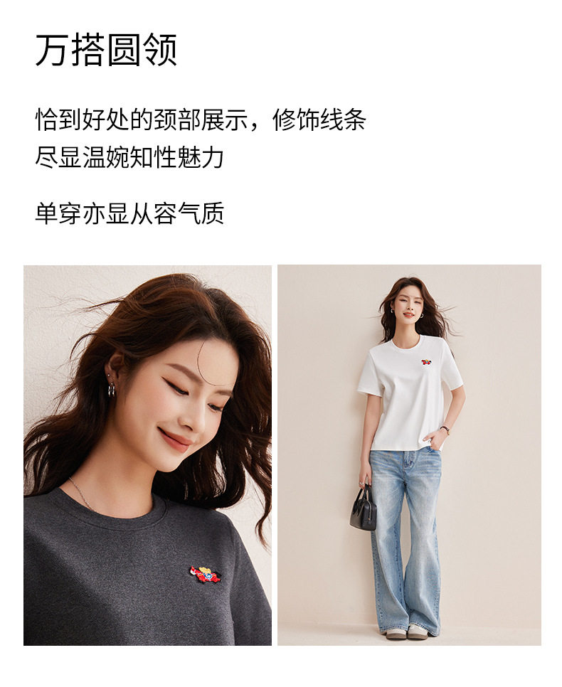 「自j」全新升级【铂金会员109/天猫149/差价40】(03955)洛诗琳小马刺绣纯棉短袖2026春季新款百搭正肩通勤T恤女